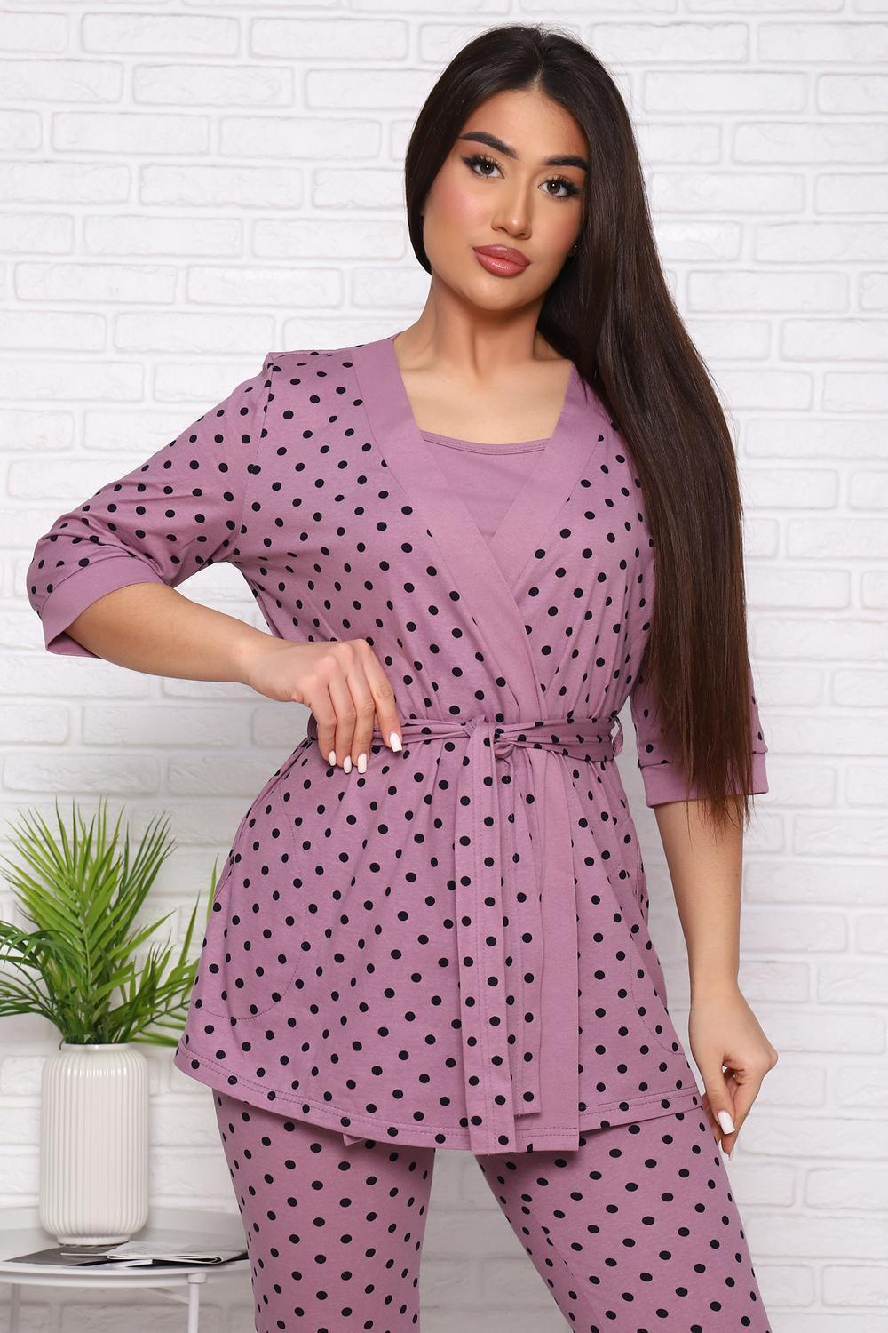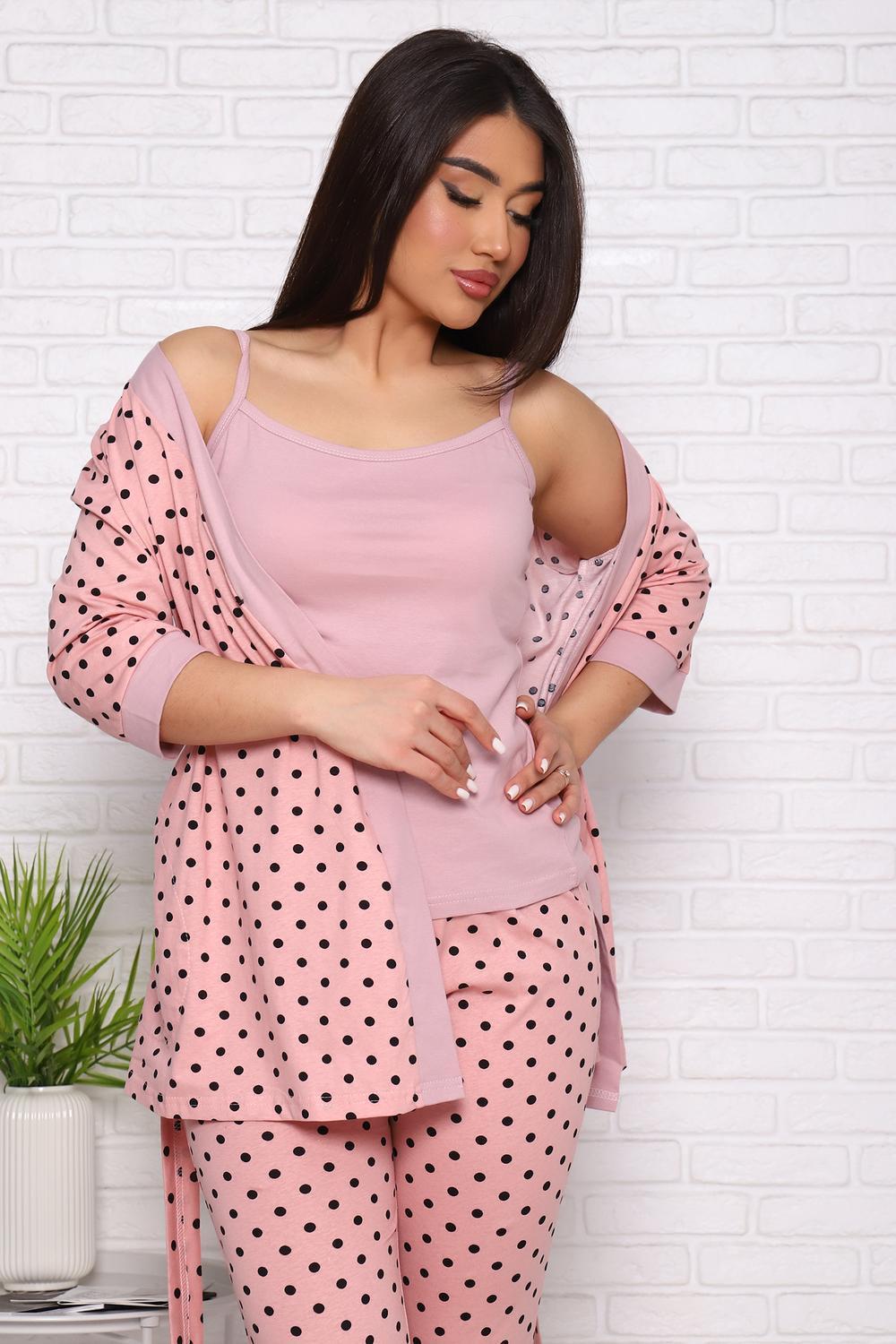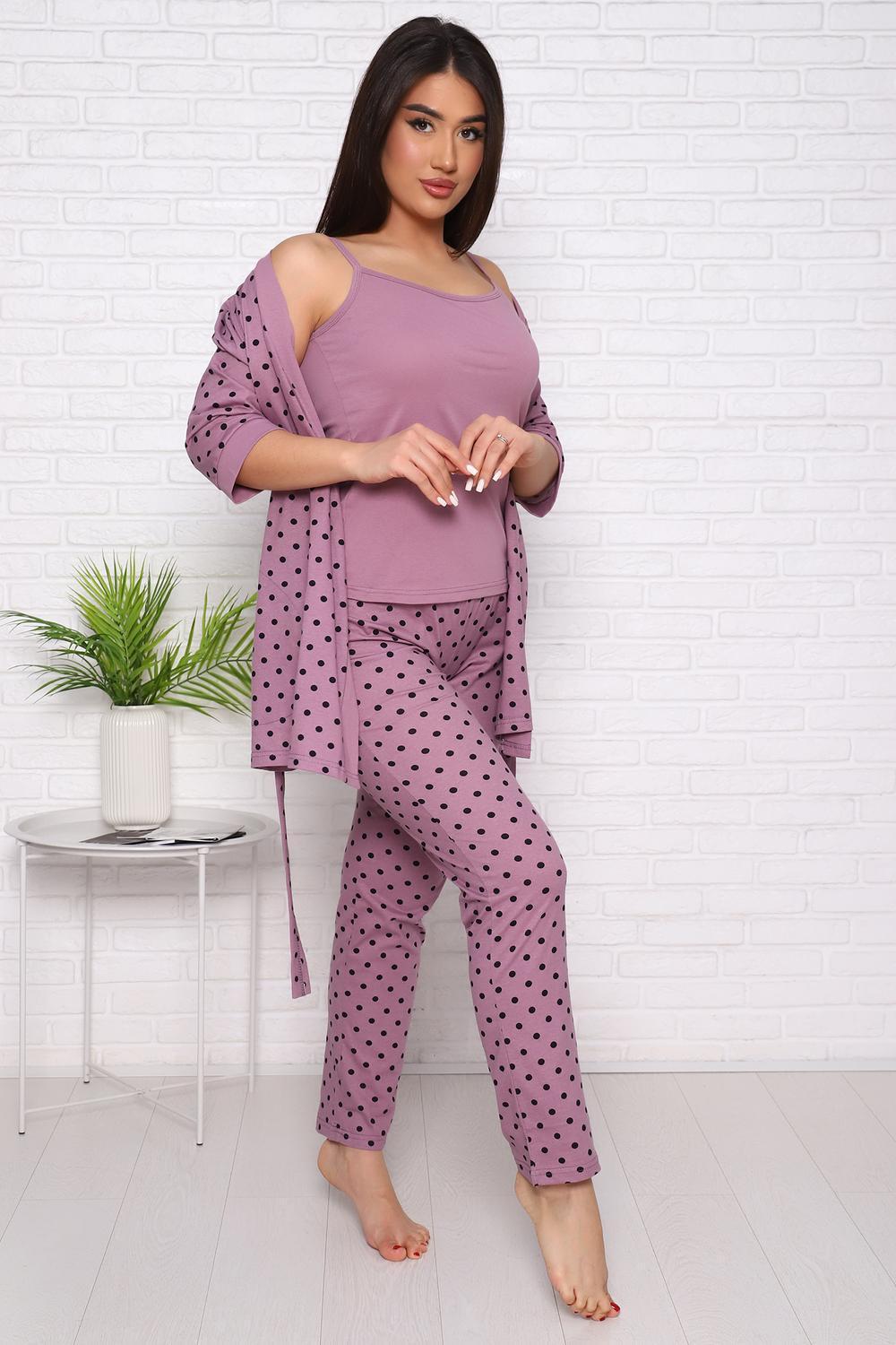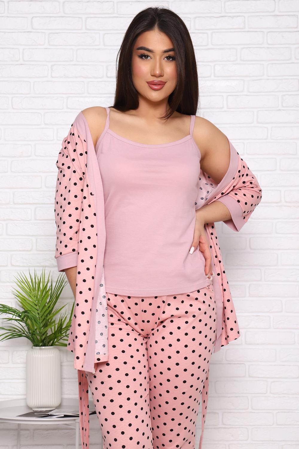 Комплект женский для сна и отдыха, состоящий из жакета, топа и брюк. Жакет с карманами, длиной до середины бедра. Топ на тонких бретелях. Брюки на резинке.