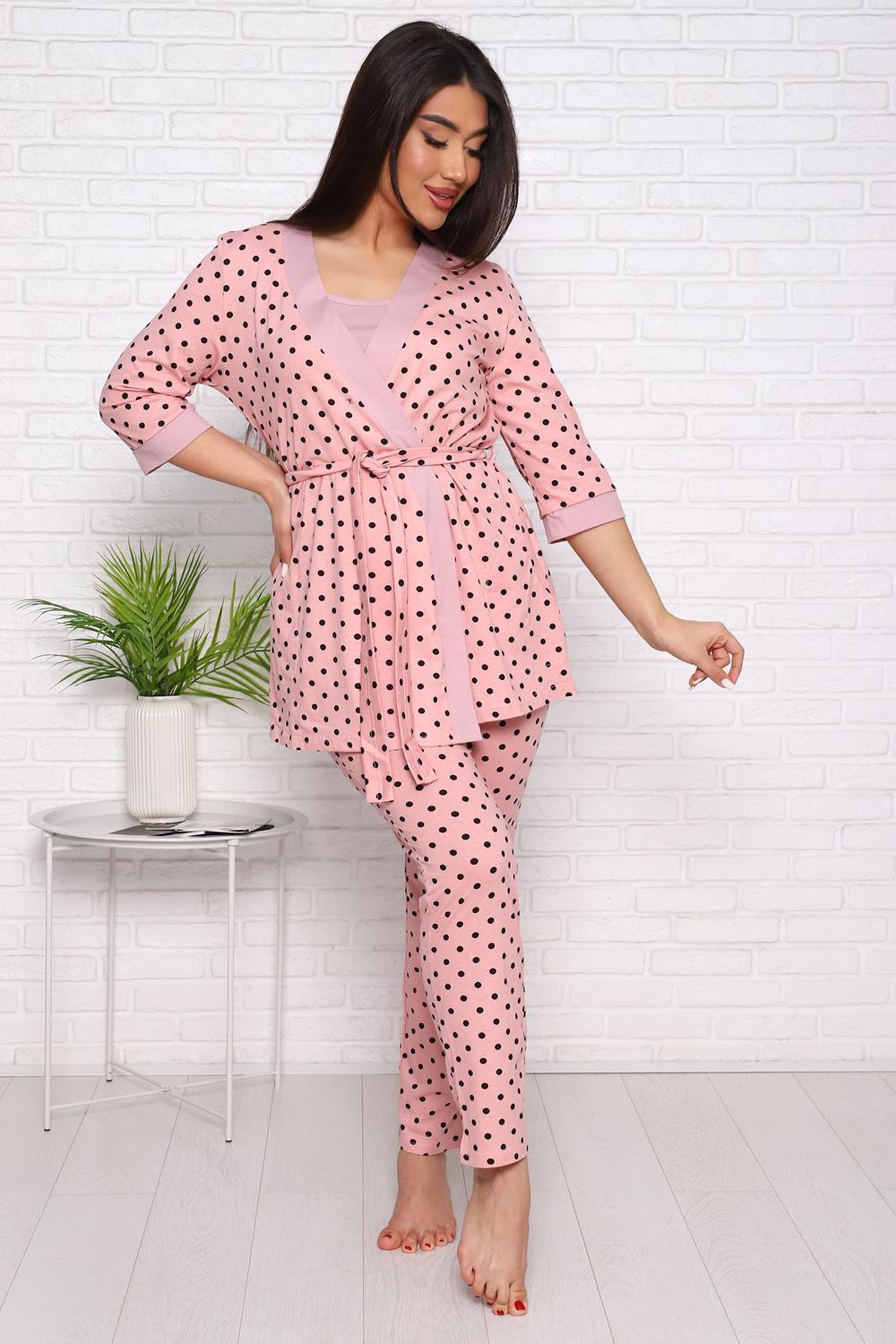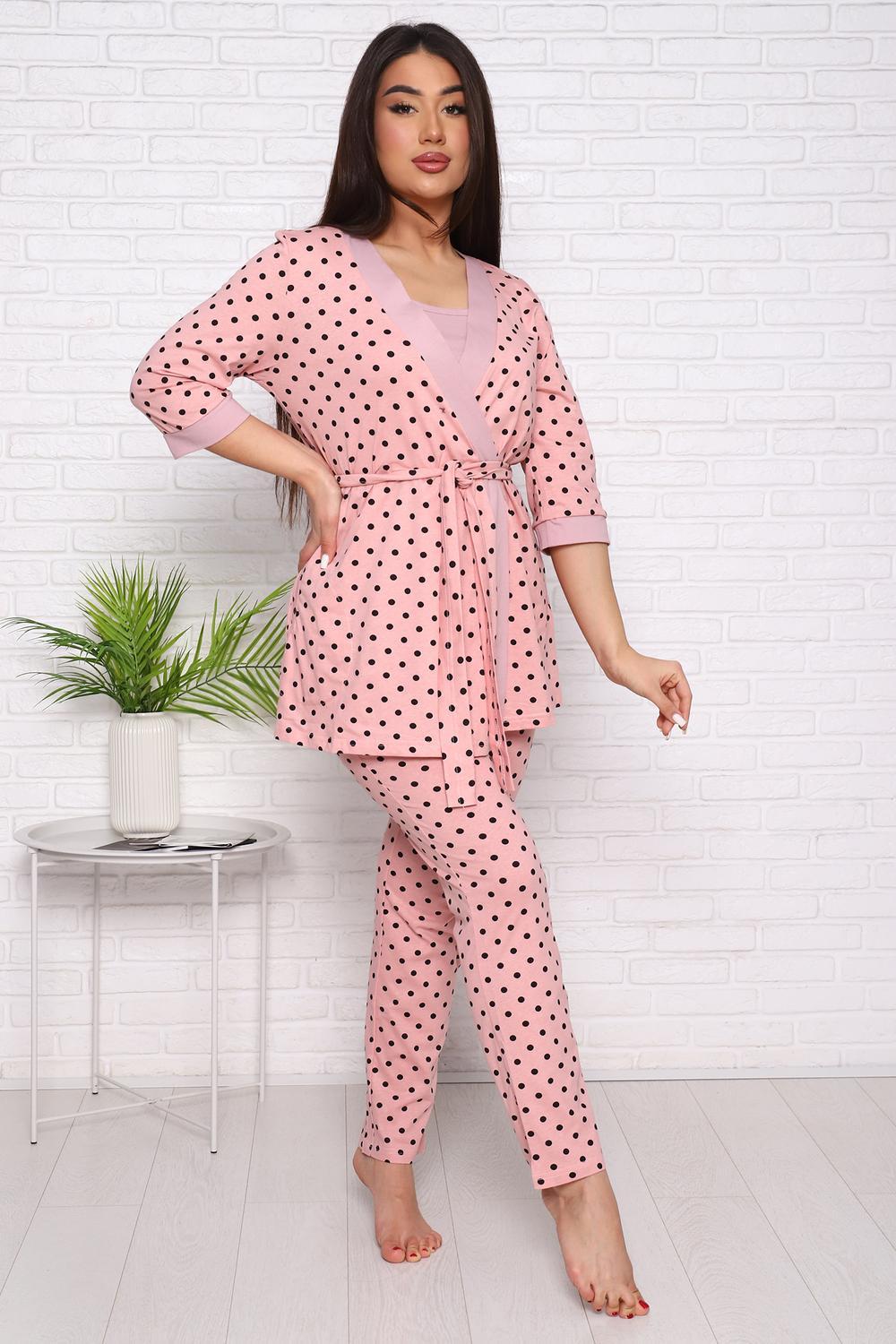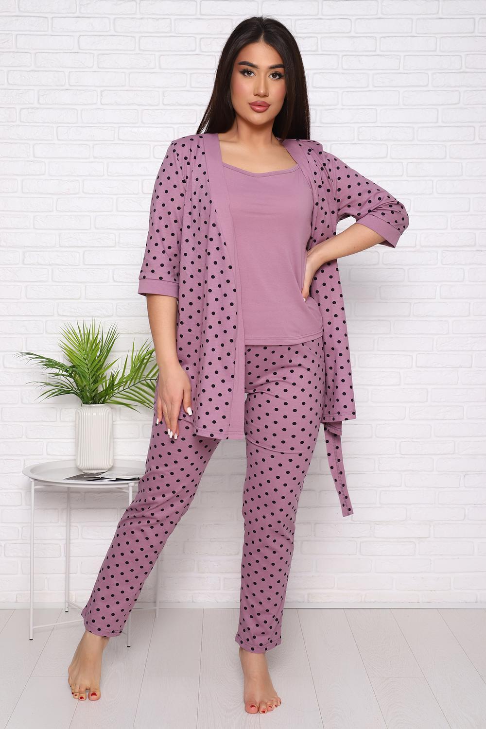 Комплект женский для сна и отдыха, состоящий из жакета, топа и брюк. Жакет с карманами, длиной до середины бедра. Топ на тонких бретелях. Брюки на резинке.