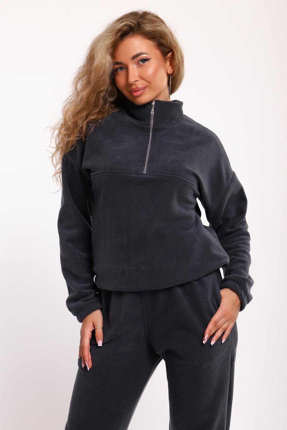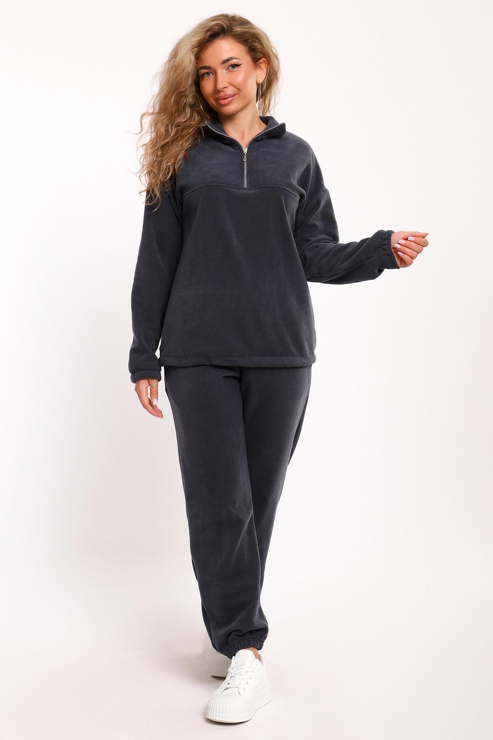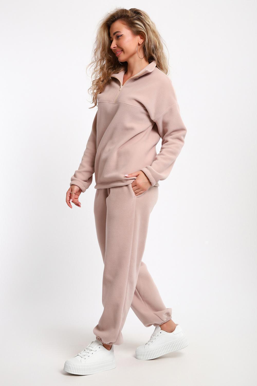 Костюм женский флисовый состоит из толстовки и брюк. Толстовка с кокеткой, на молнии, с воротником-стойкой, рукав спущенный внизу на резинке. Брюки с карманами, внизу на резинке. Костюм мягкий, теплый, удобный, идеально подойдет для прогулок и отдыха в прохладное время года. Молния может отличаться по цвету.