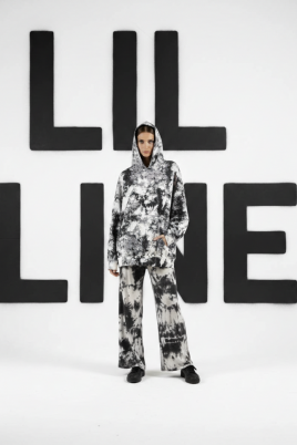 Костюм футболка и брюки. Футболка свободного кроя, короткий рукав на спущенном плече. Брюки прямого кроя на резинке.