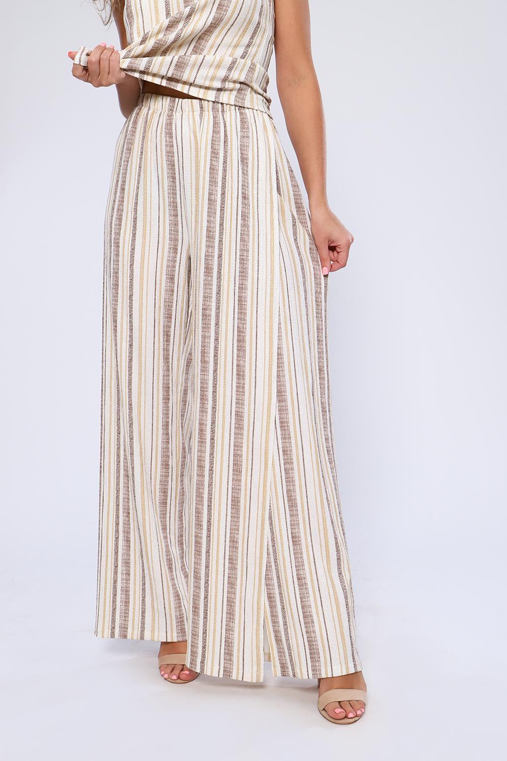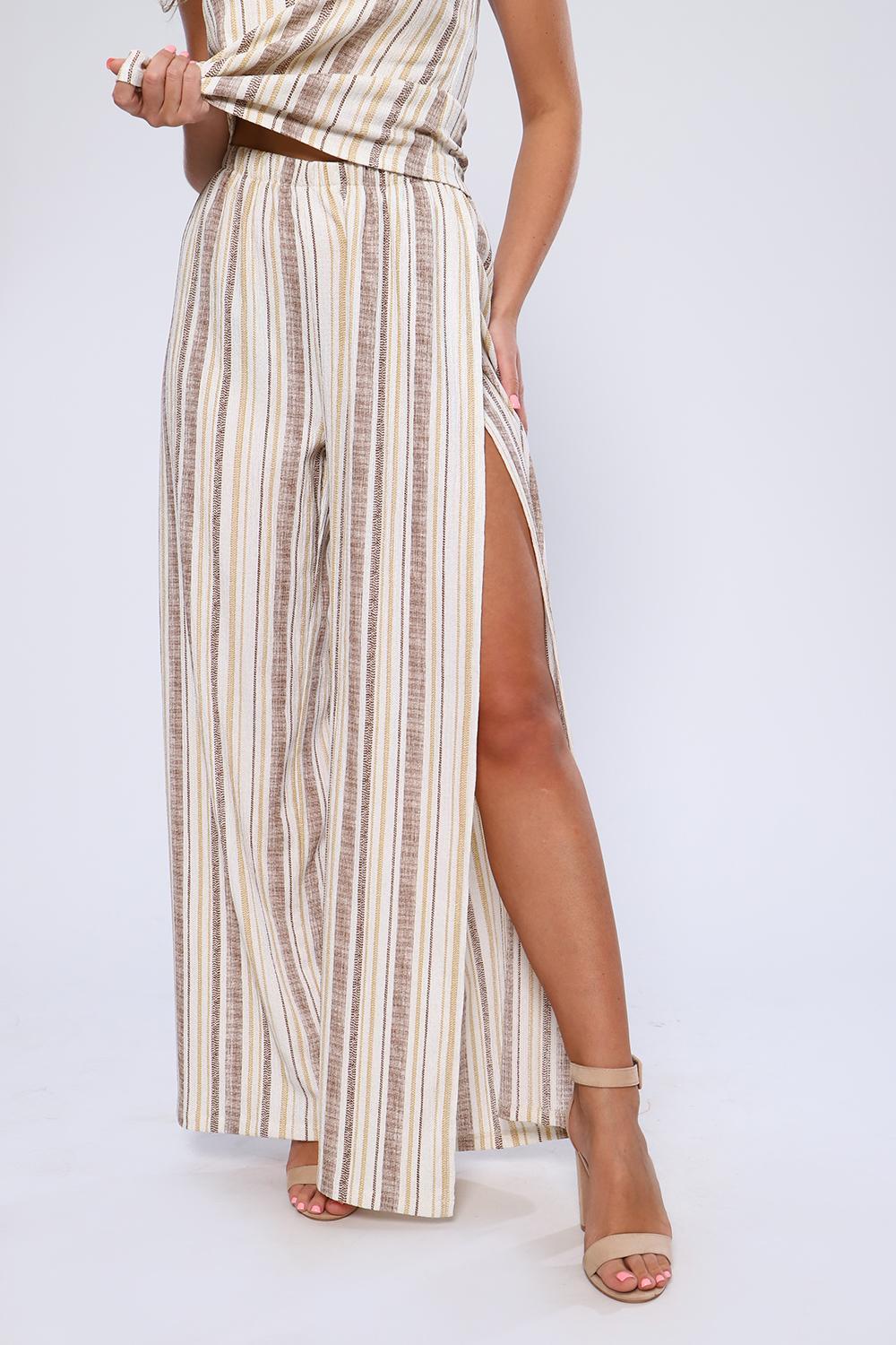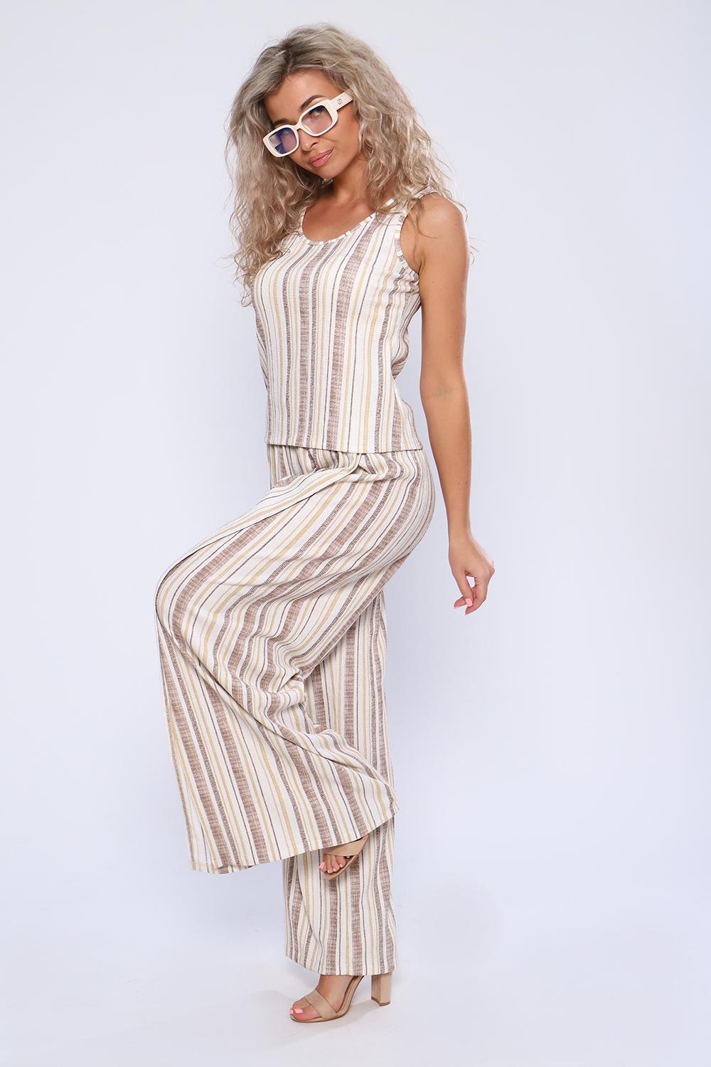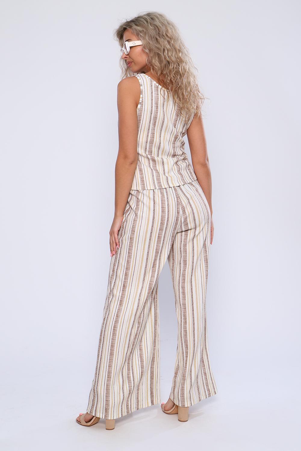 Элегантный костюм летящего силуэта из майки и брюк с разрезом на запах по одной брючине. Легкая ткань, облегающий силуэт майки и свободные брюки подарят приятные ощущения в летнюю жару.