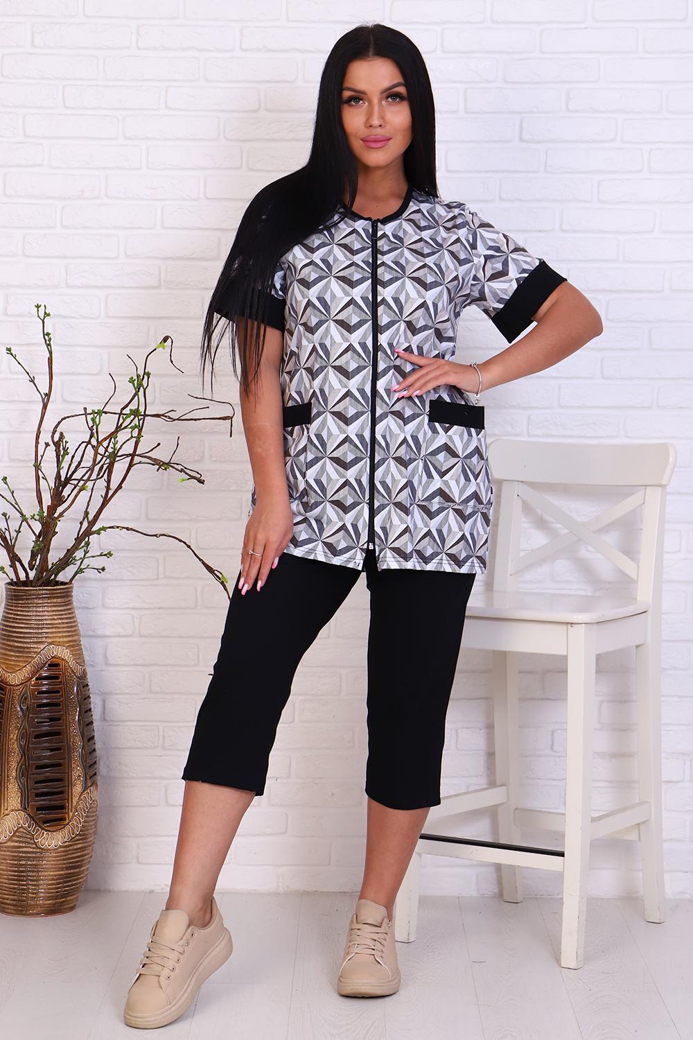 Женский костюм из кулирки кофта + бриджи. Кофта из набивной ткани на молнии с накладными карманами, короткие рукава с манжетами, бриджи из однотонной ткани. Идеальный костюм для отдыха дома, на даче.