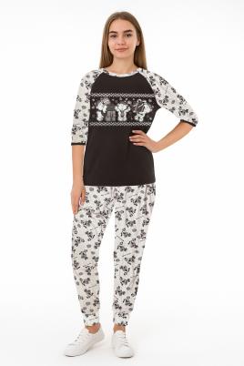 Костюм молодежный из махры. Горловина круглая, рукав длинный, по переду принт. Шортики короткие.