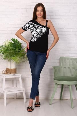 Комплект состоит из топа и шорт-велосипедок. Топ на тонких бретелях, с округлой горловиной на полочке. Вдоль боковых швов на полочке расположены отделочные лампасы. В верхней части спинки расположены перекрещенные бретели. Верх спинки собран на резинку. Горловина, проймы и бретели обработаны бейкой из основного полотна. Шорты облегающие, длинной выше колена, с завышенной линией талии, сверху на широком эластичном поясе.