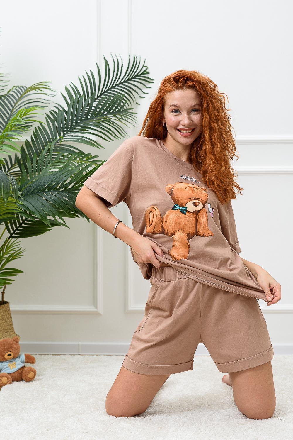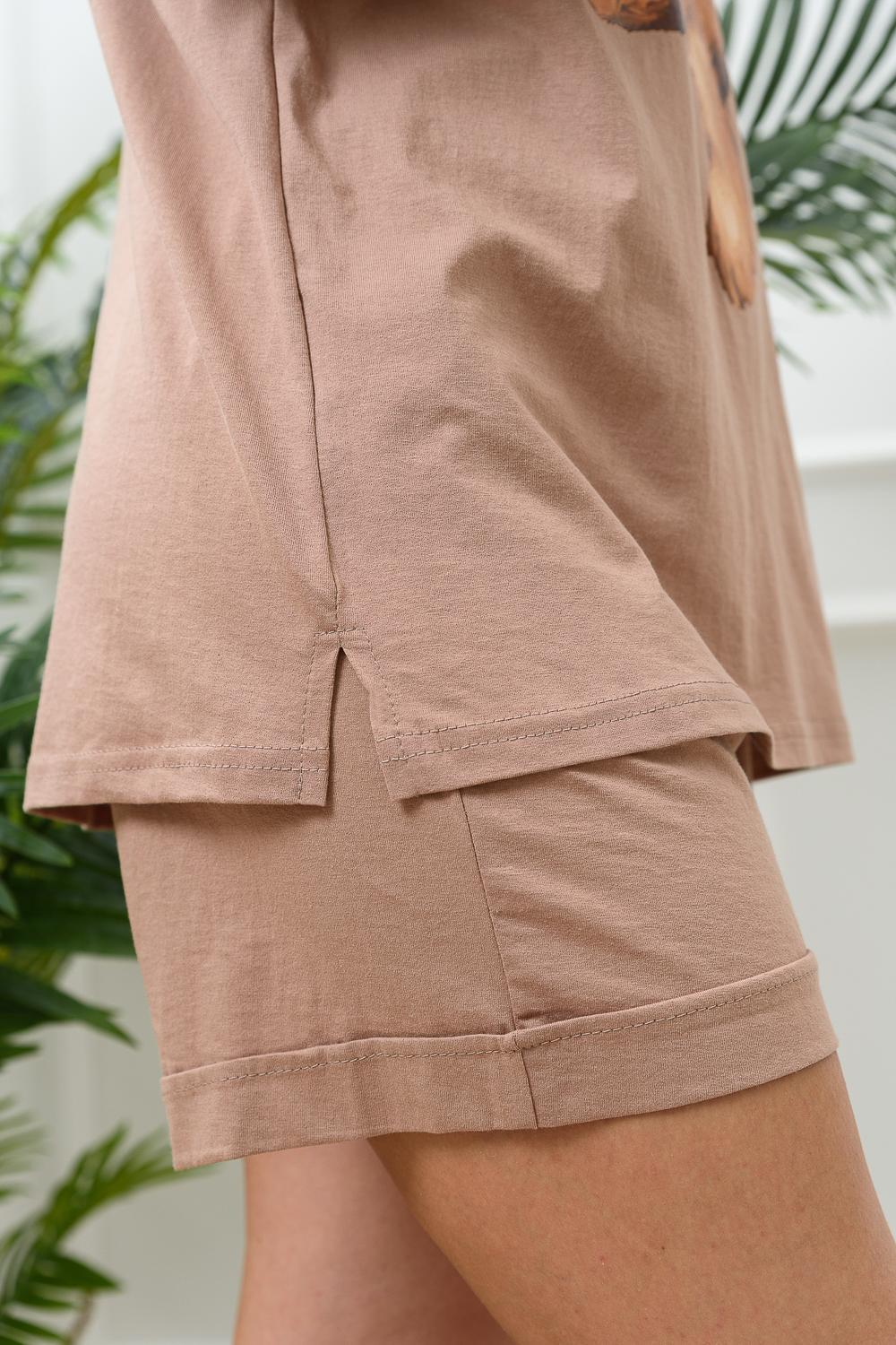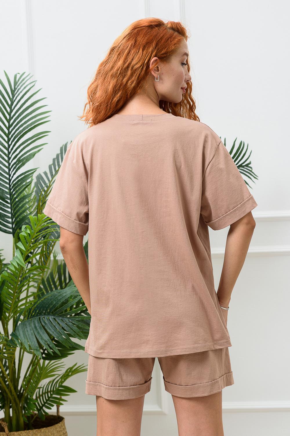 Костюм состоит из футболки и шорт. Футболка прямая, свободная, с округлой горловиной. В нижней части боковых швов футболки обработаны разрезы. Рукав короткий, с манжетом. Горловина обработана обтачкой из основного полотна. Шорты прямые, свободные, на поясе, с боковыми карманами, с манжетами.