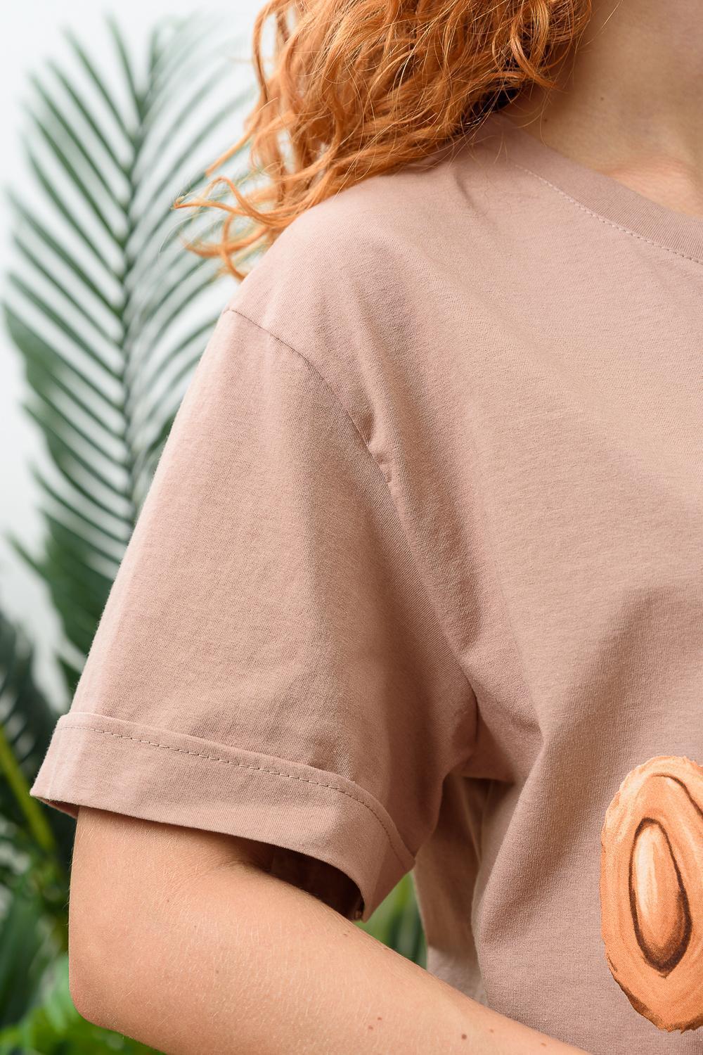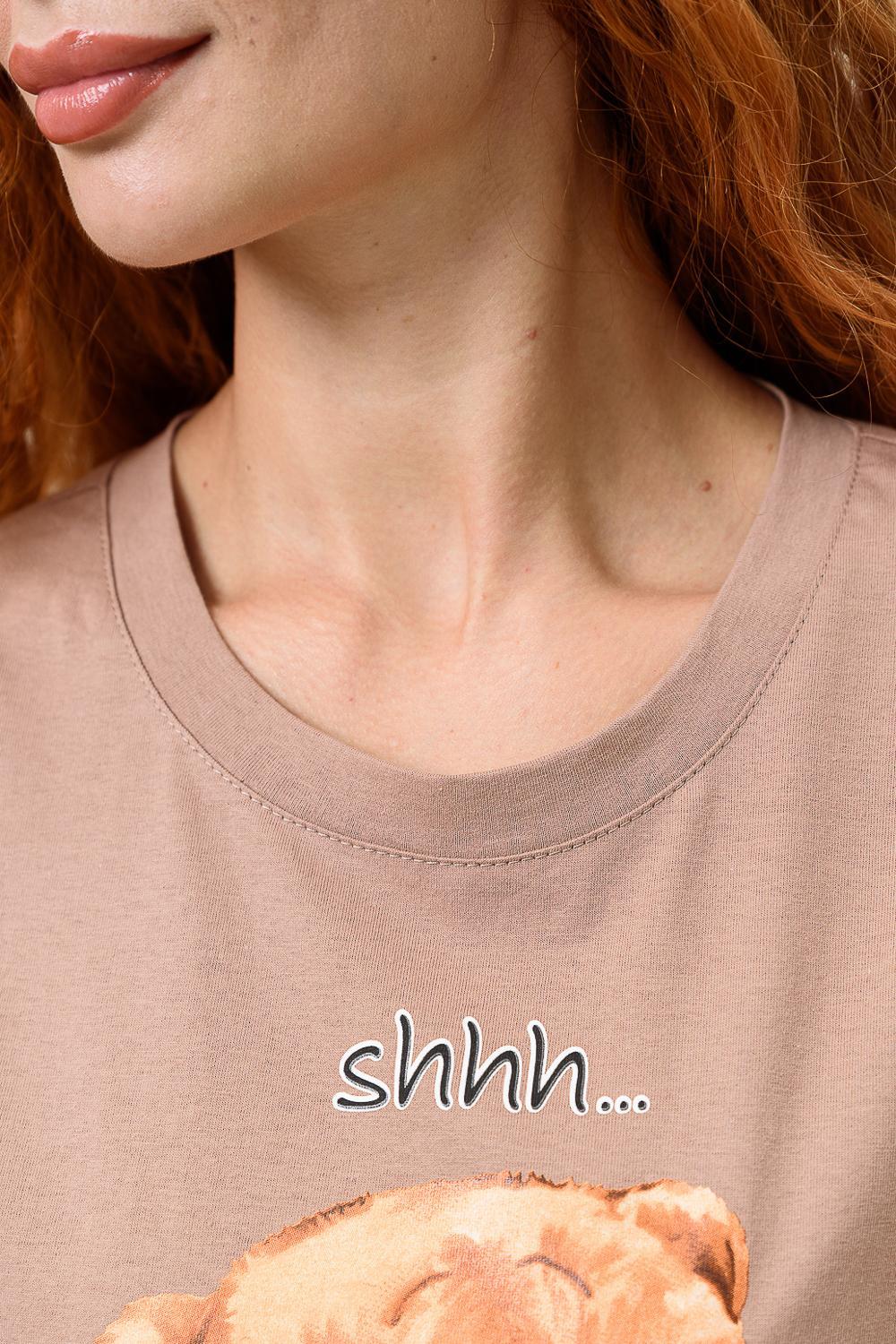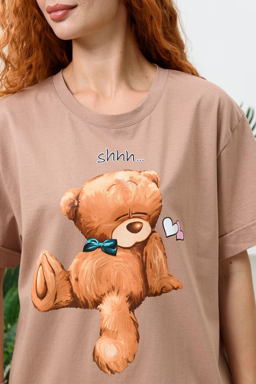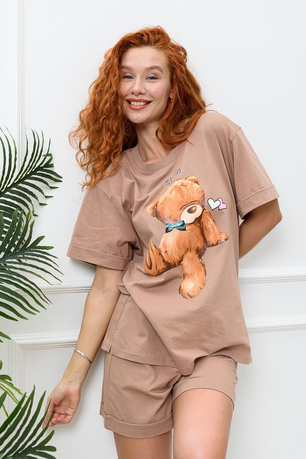 Костюм состоит из футболки и шорт. Футболка прямая, свободная, с округлой горловиной. В нижней части боковых швов футболки обработаны разрезы. Рукав короткий, с манжетом. Горловина обработана обтачкой из основного полотна. Шорты прямые, свободные, на поясе, с боковыми карманами, с манжетами.
