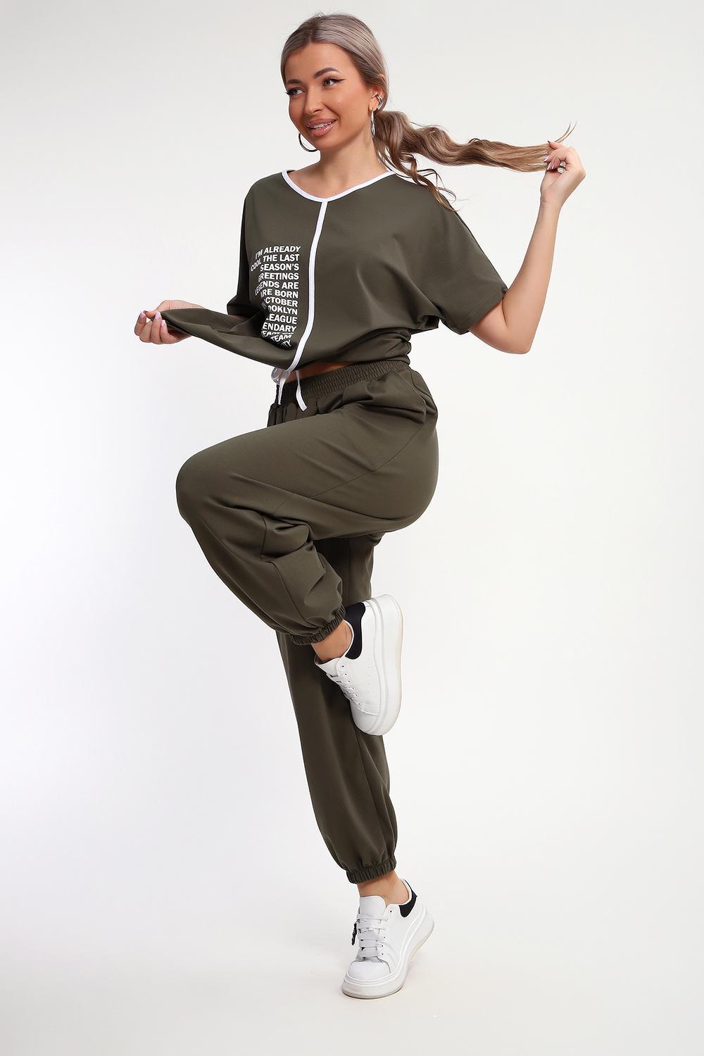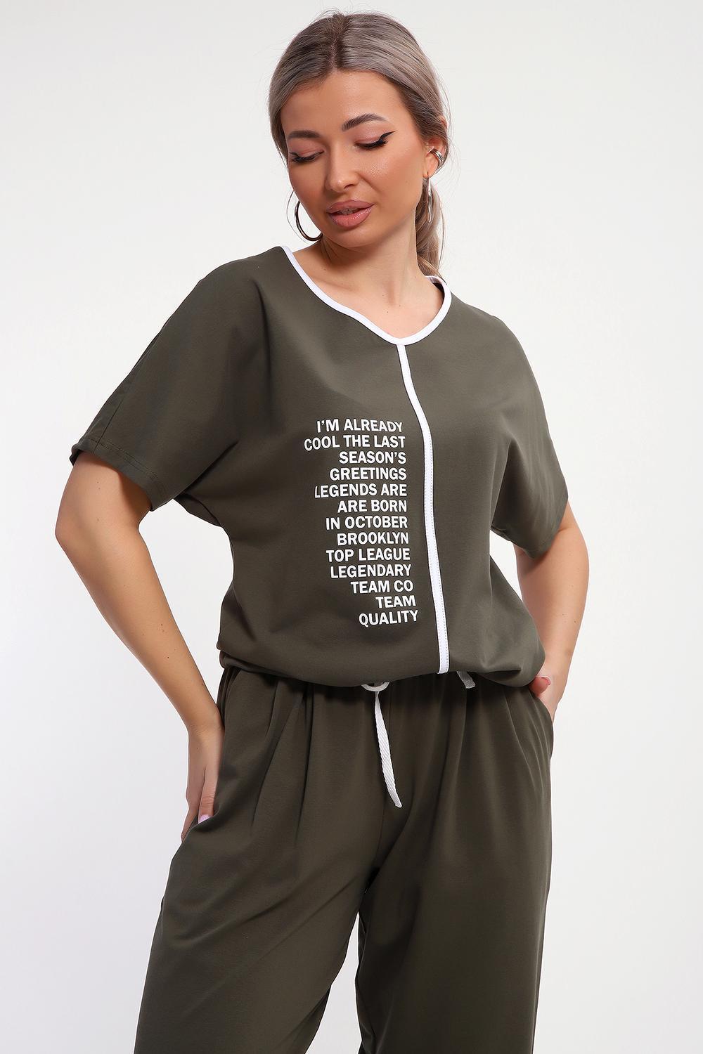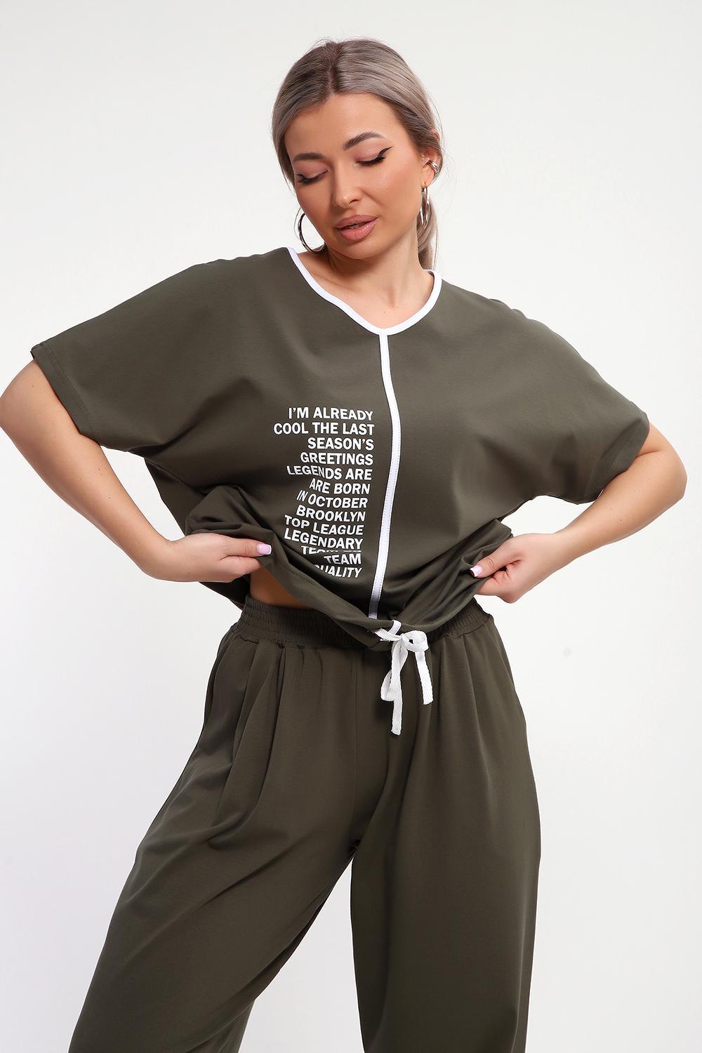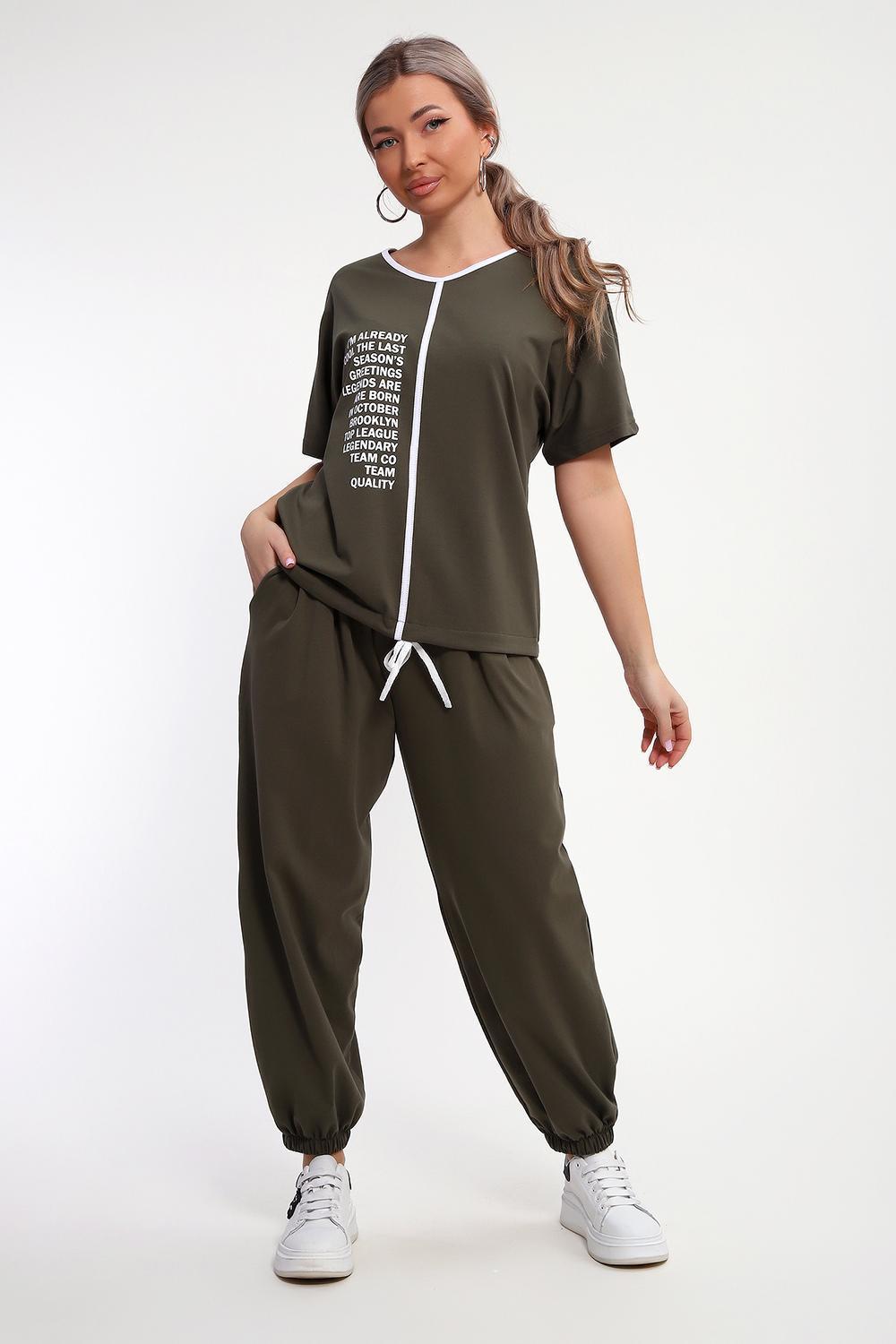 Модный, красивый и удобный костюмчик с брюками Алладинами. Костюм состоит из футболки и брюк. Рукав на футболке спущенный. На полочке принт в виде надписи, горловина обработана отбелочной тканью, по центру полочки отделочная тесьма. Низ у футболки на кулиске со шнурком, который регулируется по талии. Брюки алладины с мягкой широкой резинкой на талии и по низу изделия, свободного кроя со складочками спереди и карманами. Этот костюм станет отличным выбором для прогулок, встреч с друзьями или просто для комфортного отдыха дома!