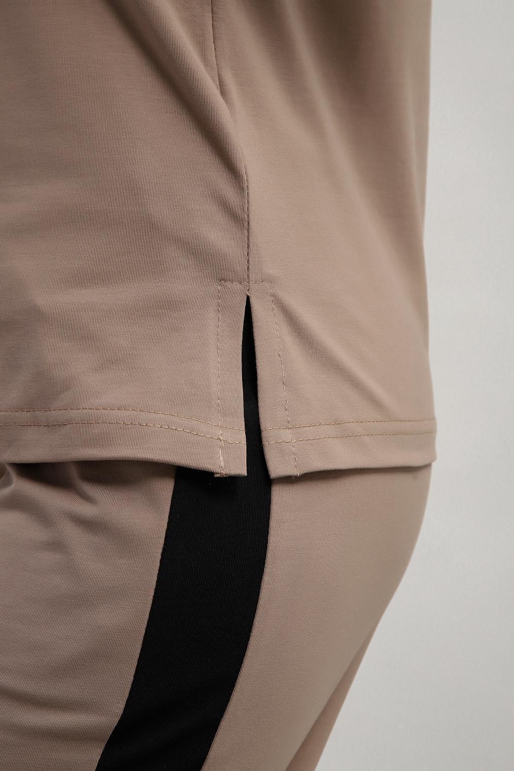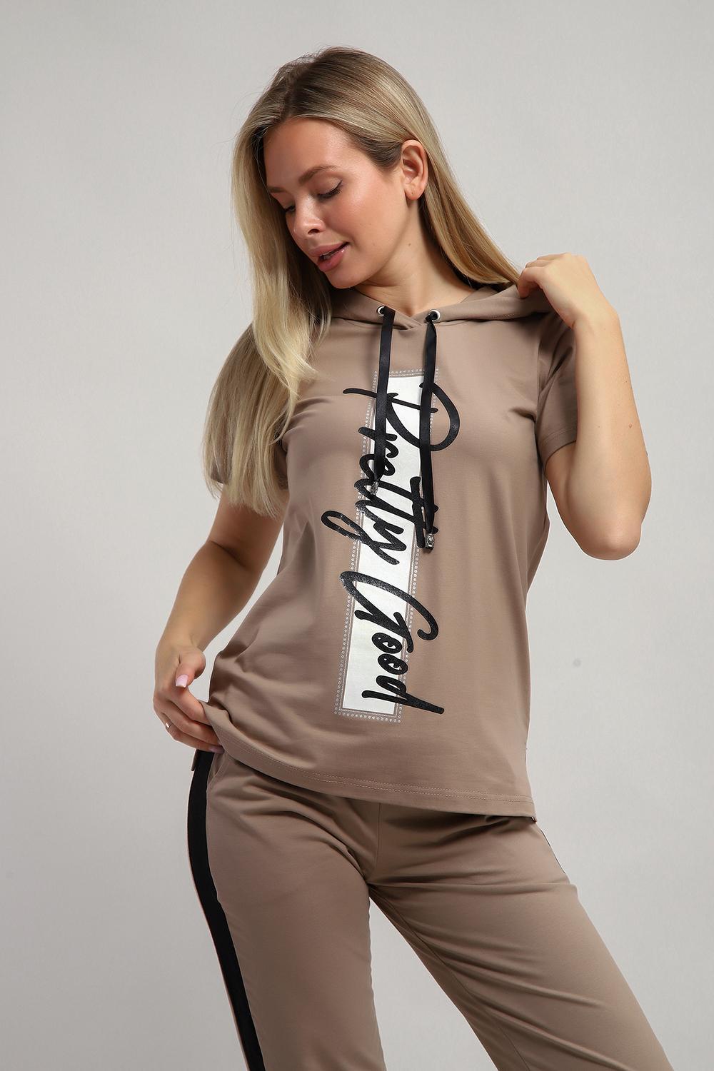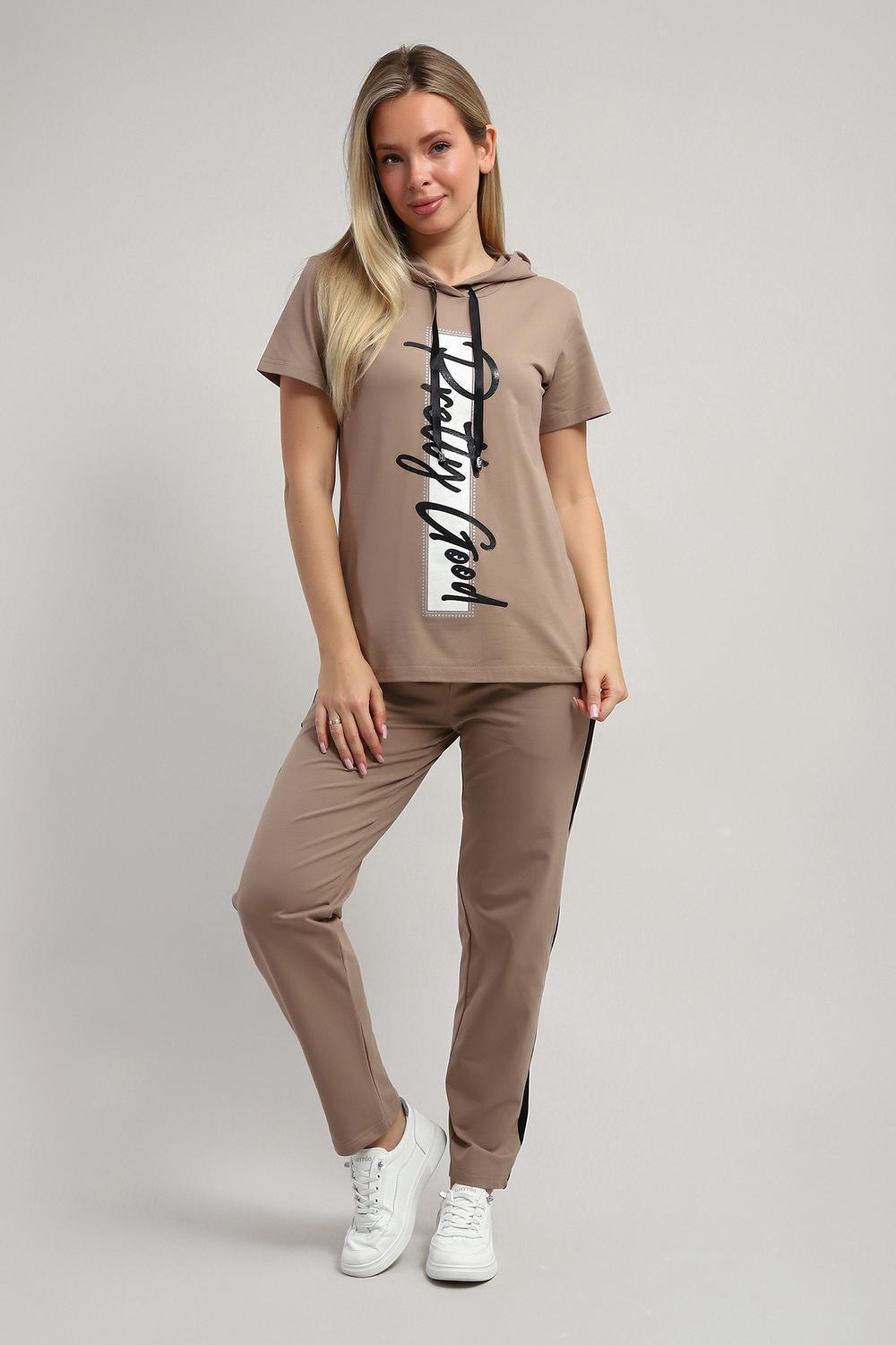Стильный женский костюм из легкой дышащей ткани. Сшит из мягкого трикотажного полотна высокого качества. Основной изюминкой костюма является яркий принт на полочке кофты, расположенный вертикально и контрастирующий с общим фоном. Кроме того, на кофте имеется капюшон, объем которого регулируется тонкой лентой. Этот универсальный и практичный повседневный костюм в спортивном стиле будет удобным и комфортным во многих ситуациях. Комплект отлично подойдет для спорта, бега или танцев. Брюки свободные с яркими лампасами, двумя боковыми карманами, на широком поясе с резинкой. Каждую вещь вполне можно использовать по отдельности. Комплект отлично подойдет для женщин любого возраста и поможет хозяйке выглядеть стильно, при этом даря чувство комфорта!