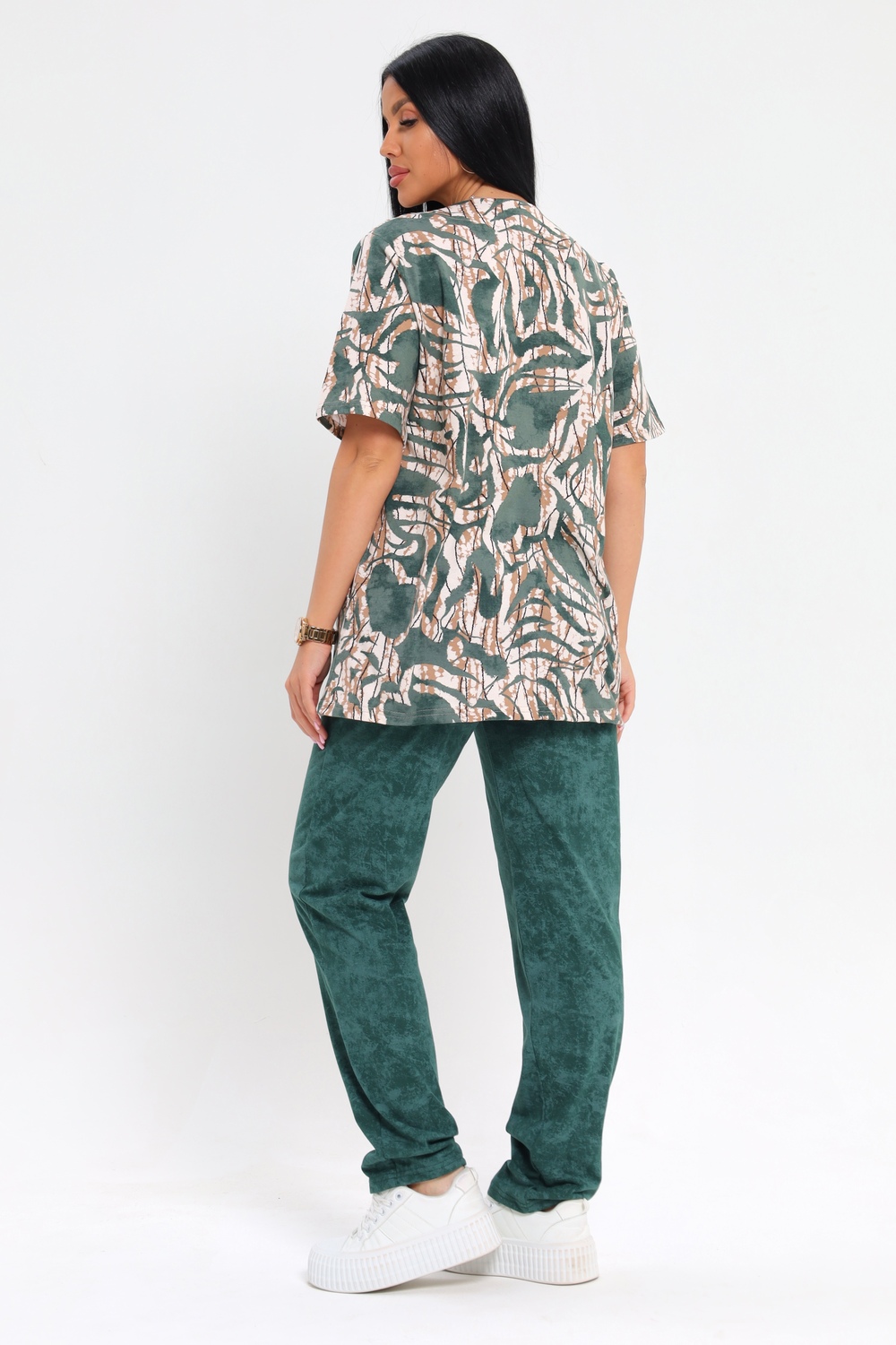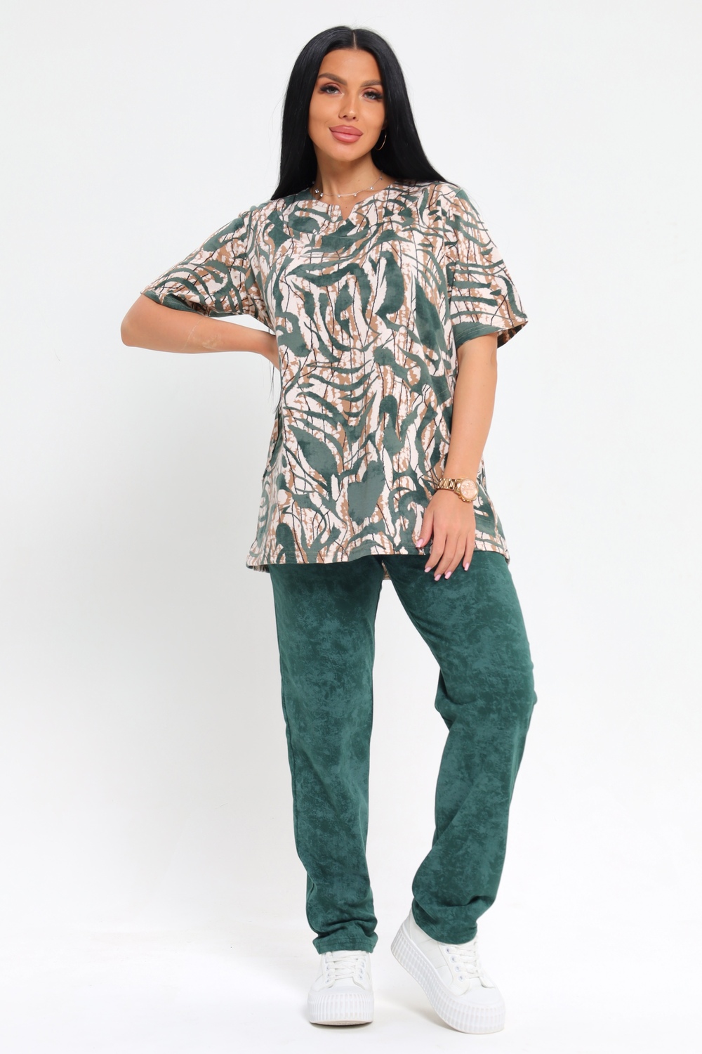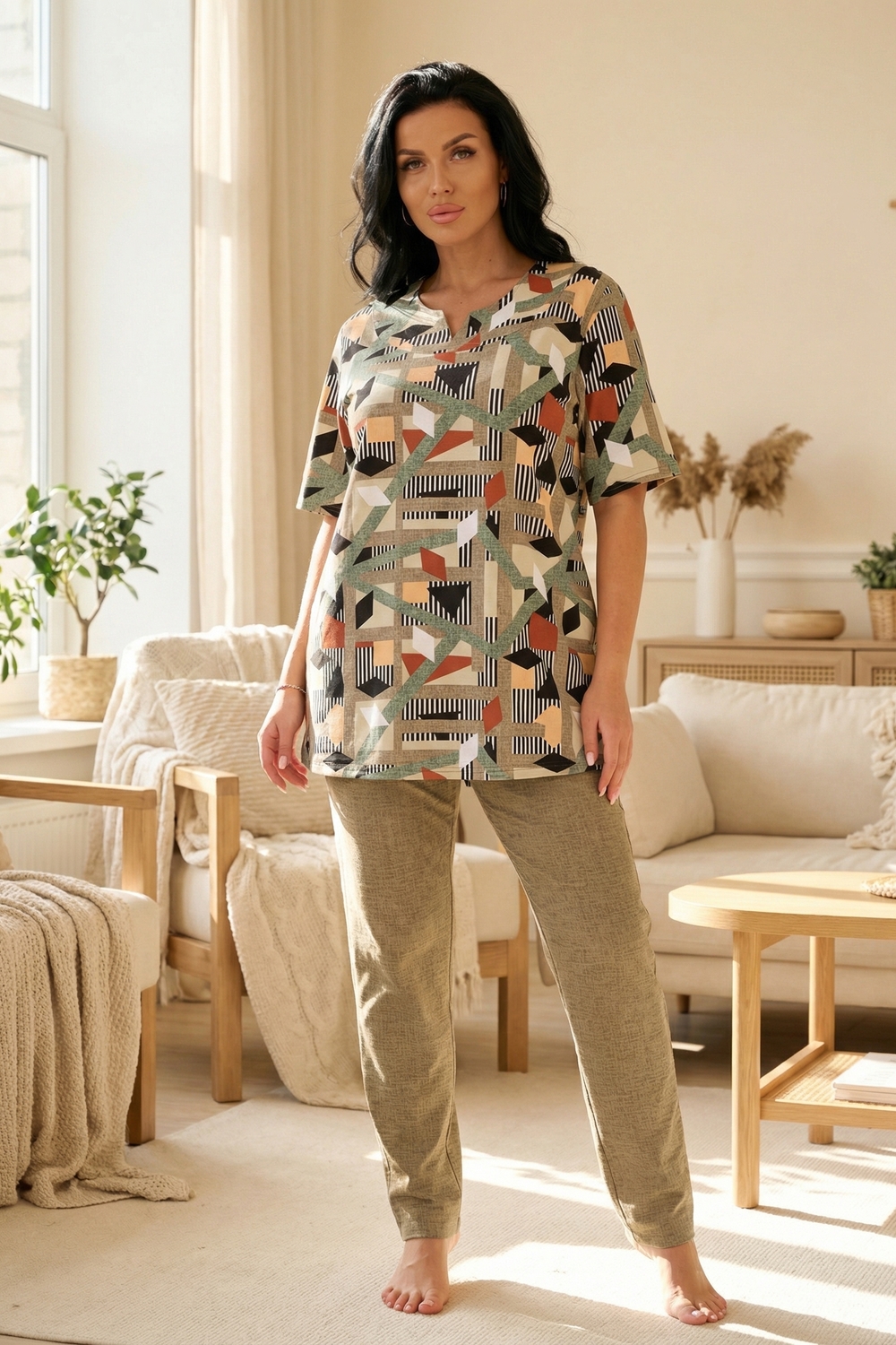 Костюм выполнен из приятной на ощупь трикотажной ткани, которая обеспечивает комфорт в течение всего дня. Легкая текстура материала позволяет коже дышать, что особенно важно для домашнего отдыха. Комплект состоит из свободной футболки и удобных брюк, что делает его идеальным выбором для ежедневного ношения дома. Брюки имеют прямой крой и мягкий пояс, что обеспечивает свободу движений и дополнительный комфорт. Ткань не сковывает движения, легко стирается и быстро сохнет, сохраняя форму даже после многочисленных стирок. Такой домашний костюм отлично подходит для отдыха, сна или выполнения повседневных дел. Современный внешний вид гармонично сочетается с функциональностью, а качество трикотажной ткани гарантирует долговечность изделия. Костюм прекрасно сидит по фигуре и подходит для любого типа телосложения.