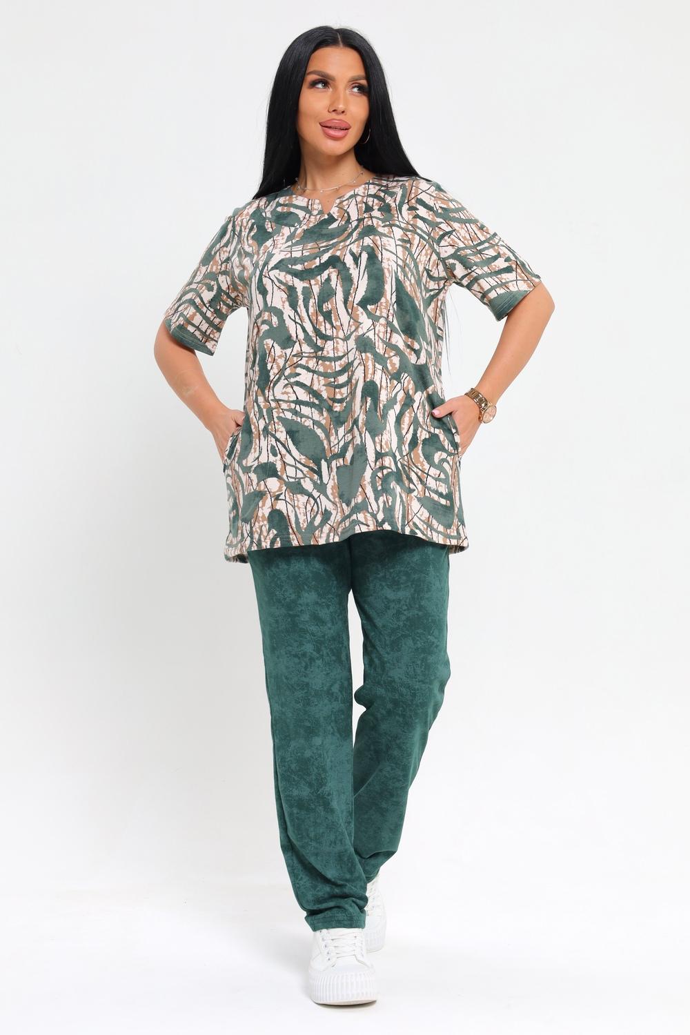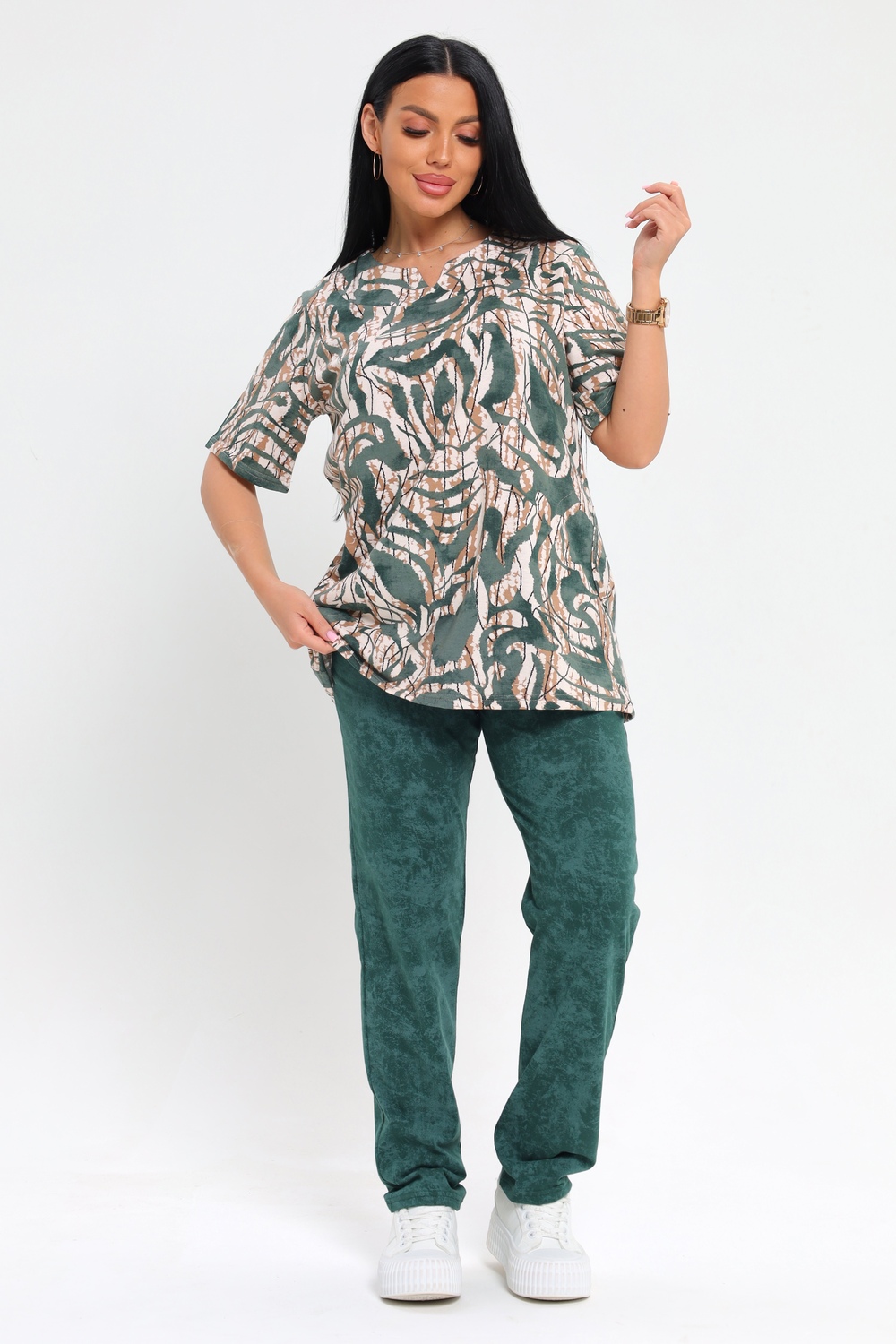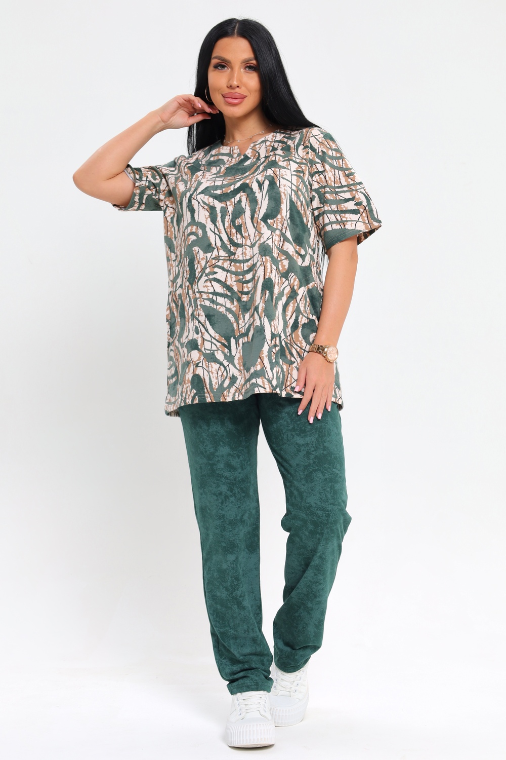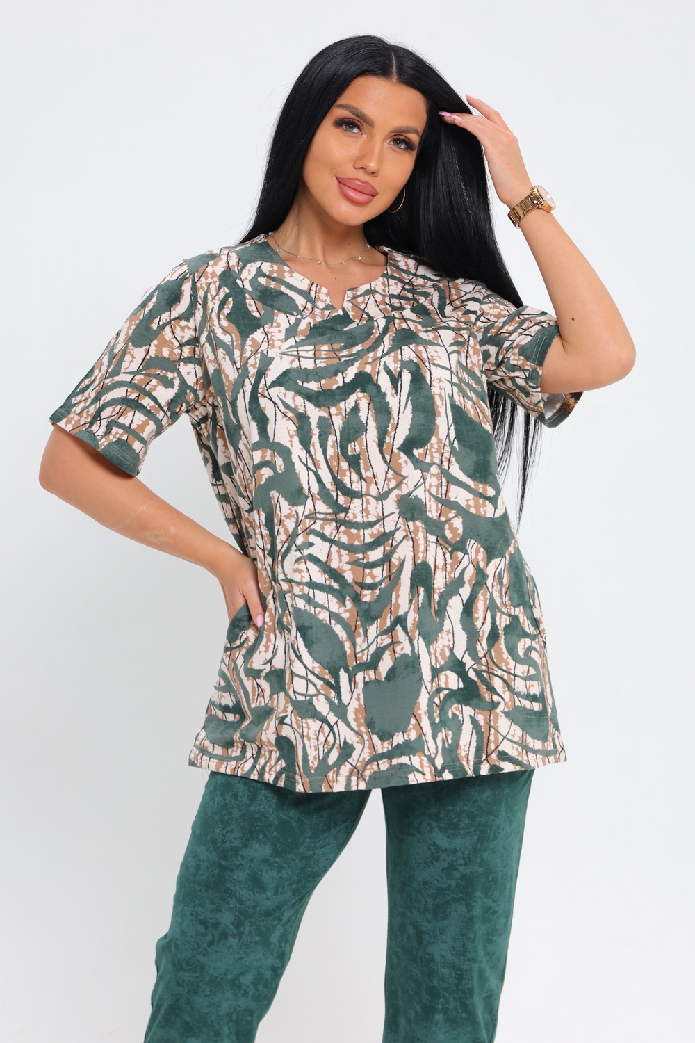 Костюм выполнен из приятной на ощупь трикотажной ткани, которая обеспечивает комфорт в течение всего дня. Легкая текстура материала позволяет коже дышать, что особенно важно для домашнего отдыха. Комплект состоит из свободной футболки и удобных брюк, что делает его идеальным выбором для ежедневного ношения дома. Брюки имеют прямой крой и мягкий пояс, что обеспечивает свободу движений и дополнительный комфорт. Ткань не сковывает движения, легко стирается и быстро сохнет, сохраняя форму даже после многочисленных стирок. Такой домашний костюм отлично подходит для отдыха, сна или выполнения повседневных дел. Современный внешний вид гармонично сочетается с функциональностью, а качество трикотажной ткани гарантирует долговечность изделия. Костюм прекрасно сидит по фигуре и подходит для любого типа телосложения.