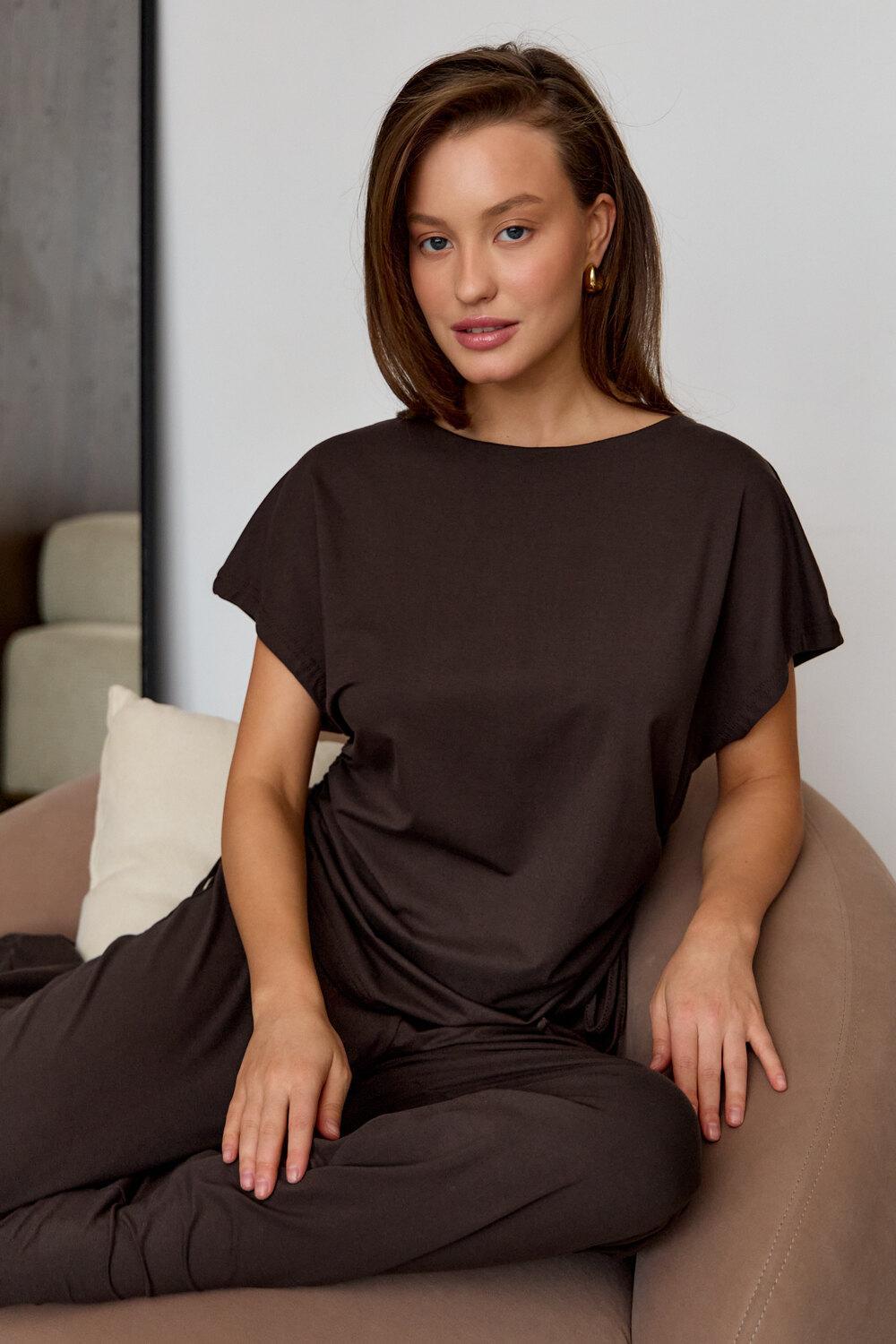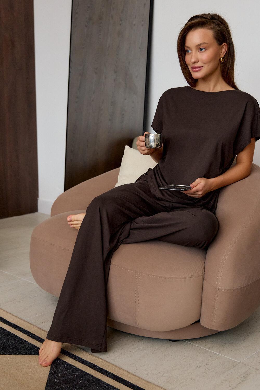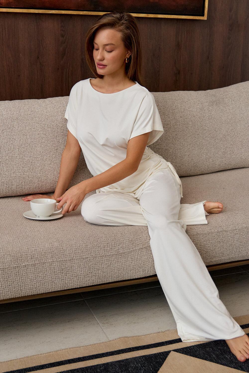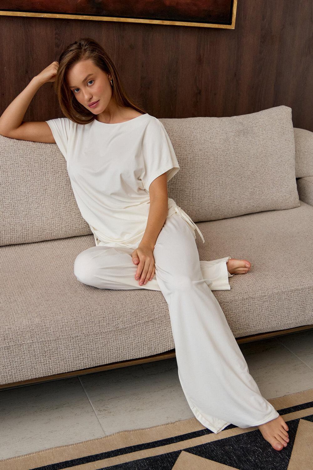 Представляем вам стильный комплект домашней пижамы женской, который станет незаменимым в вашем гардеробе. Этот костюм включает в себя футболку с завязками и с брюками палаццо, выполненный из премиальной вискозы, что обеспечивает невероятный комфорт и приятные ощущения на коже.