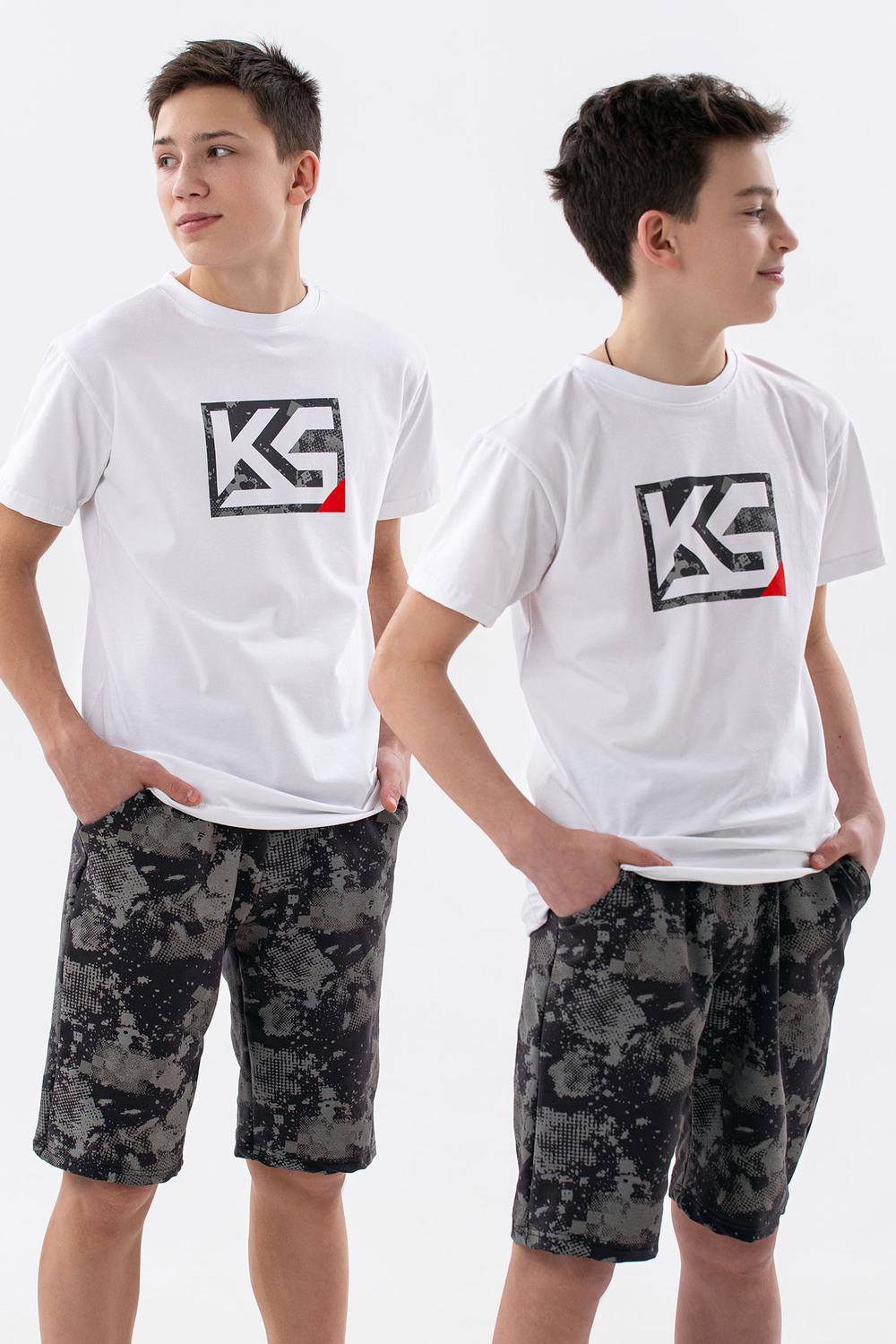 Костюм для подростков состоит из двух изделий - футболки и шорт. Футболка выполнена из ткани с абстрактным принтом. Футболка прямого свободного кроя, круглый вырез горловины, втачной рукав. Шорты выполнены из футера 2-х нитки, прямого кроя, с удобной посадкой. С боковыми карманами и красным шнурком.