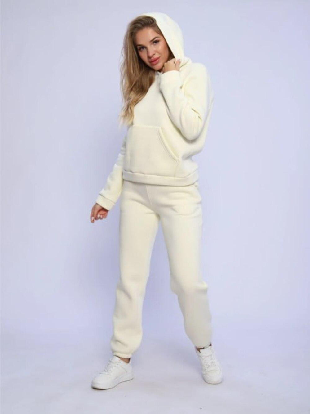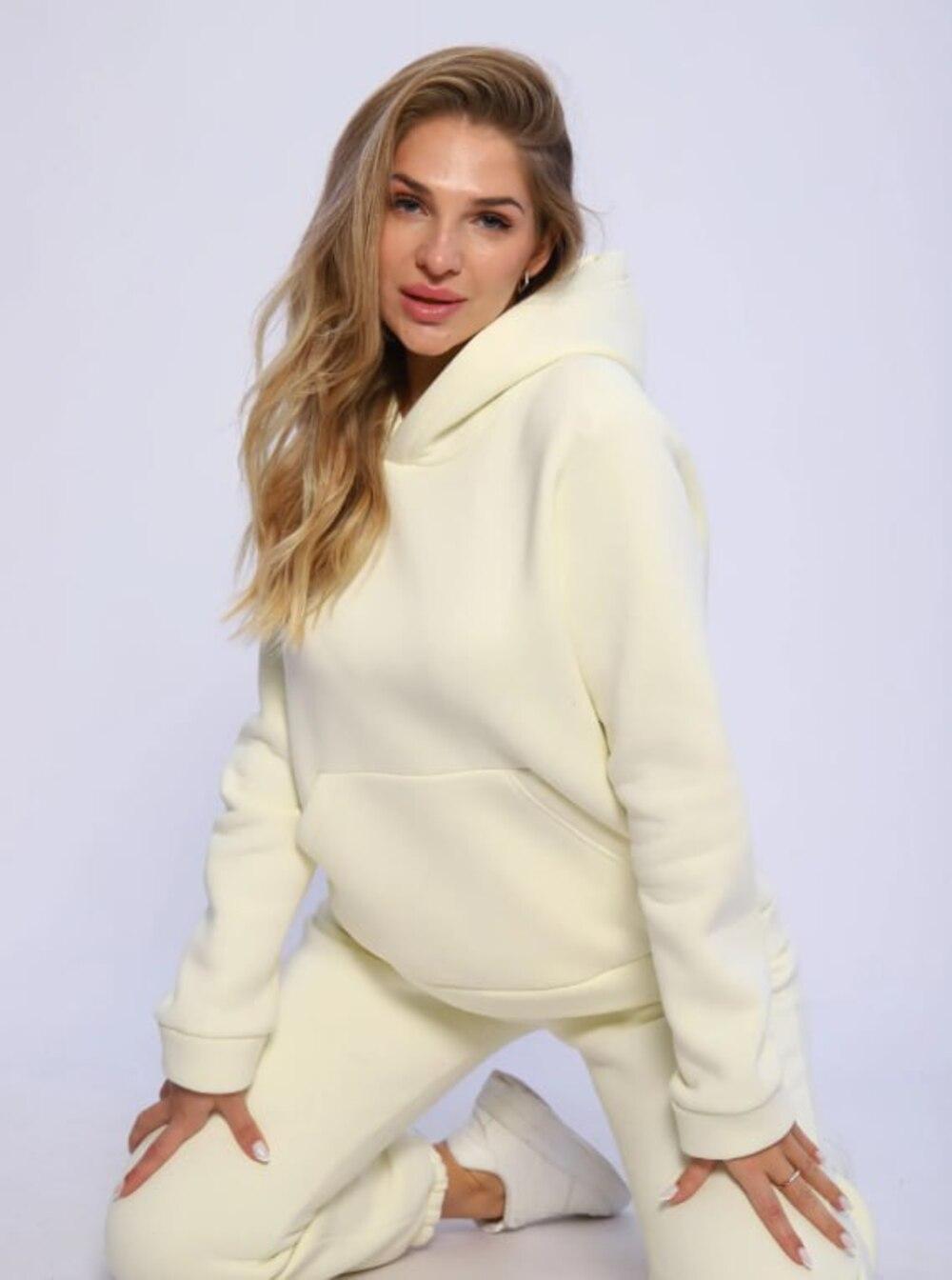 Костюм с начёсом -прекрасный вариант повседневной одежды для осени и зимы. Толстовка прямого кроя, имеет классическую пройму с втачным рукавом с притачными манжетами и поясом из ткани верха. На полочке расположен карман –кенгуру. Капюшон однослойный, он прекрасно защитит голову в прохладную погоду. Брюки на резинке, с боковыми наклонными карманами, по низу штанины вшита внутрь резинка.