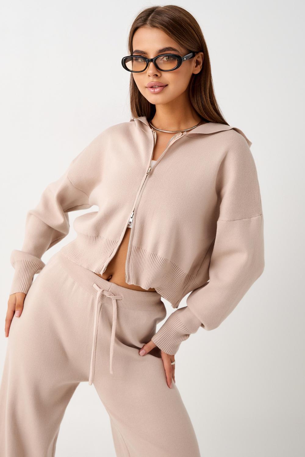 Вязаный костюм станет незаменимой основой женского гардероба для прохладной погоды, комфортным способом утепления. Он сшит из мягкой, приятной к телу пряжи с шерстяными волокнами, которая надолго сохраняет насыщенность цвета и свою форму, выдерживая интенсивное ношение и частые стирки. Стильный дизайнерский комплект отличается продуманным дизайном: кофточка - оверсайз со спущенным плечом, V-образным вырезом горловины и отложным воротником обеспечивает комфорт, а брюки - спортивки с широким поясом - резинкой, длинными штанинами с манжетами и удобными карманами подчеркивают силуэт, не сковывая движений. Универсальность классической пастельной палитры и лаконичного дизайна позволяет легко включать комплект в коллекцию вещей для осенне - весеннего демисезонного и зимнего периода. Он идеально сочетается с однотонными вариантами обуви и нарядными праздничными аксессуарами для создания элегантного и собранного образа.