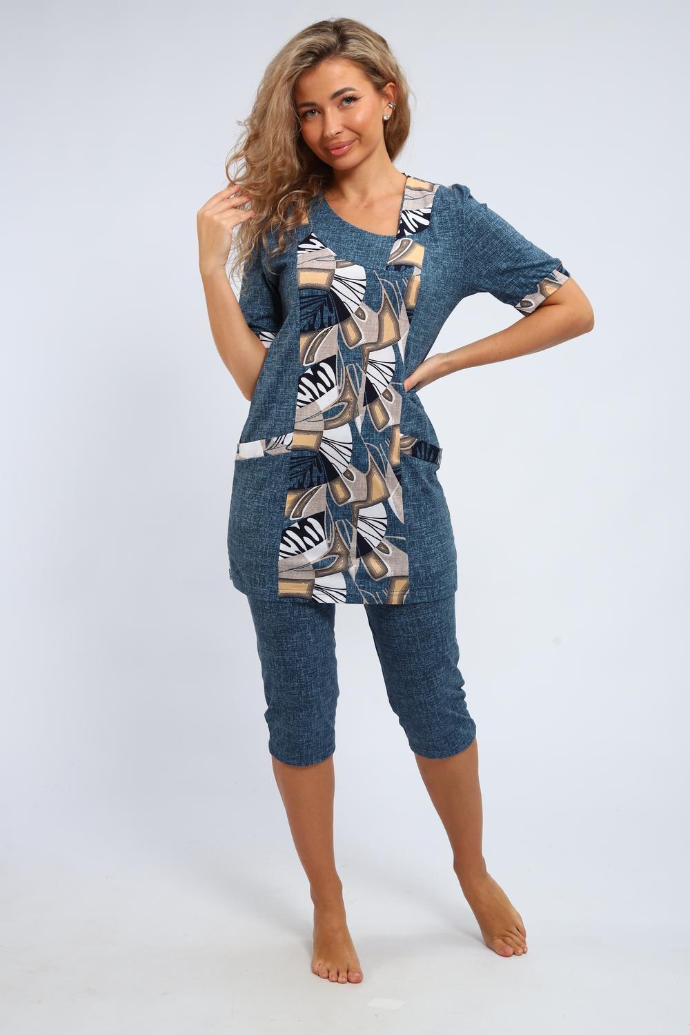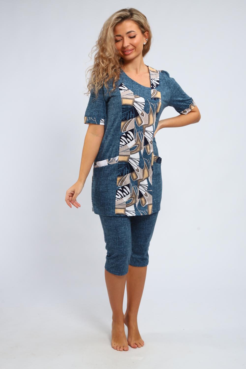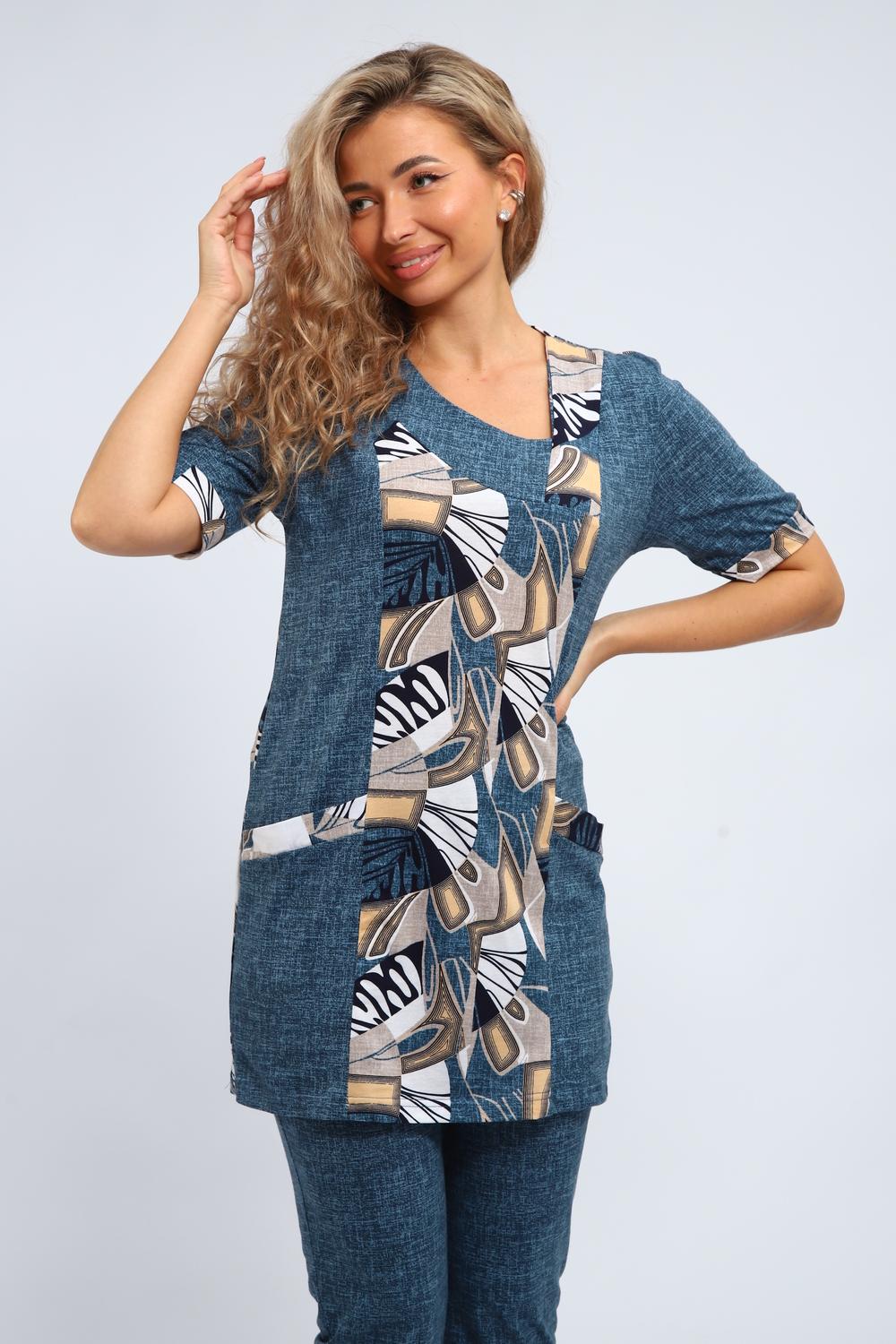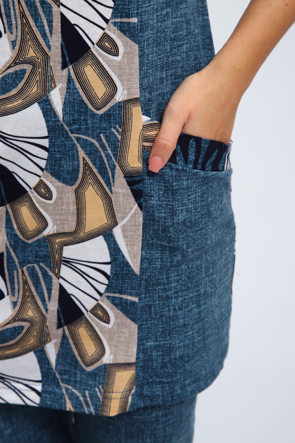 Женский костюм выполнен из мягкого хлопка, поэтому в нем комфортно в любое время года. Такой трикотажный костюм легко использовать как повседневный наряд для дома. Фасон продуман до мелочей: удобный крой туники с карманами и коротким рукавом отлично подходит как летний вариант, а в прохладное время костюм можно носить как демисезонный. Для полных женщин костюм станет удачным решением: эластичный материал хорошо садится на фигуру и не сковывает движений, долго сохраняет аккуратный вид, не вытягивается и остаётся привлекательным даже при длительном использовании. Благодаря мягкой ткани и свободному крою в нем удобно отдыхать дома