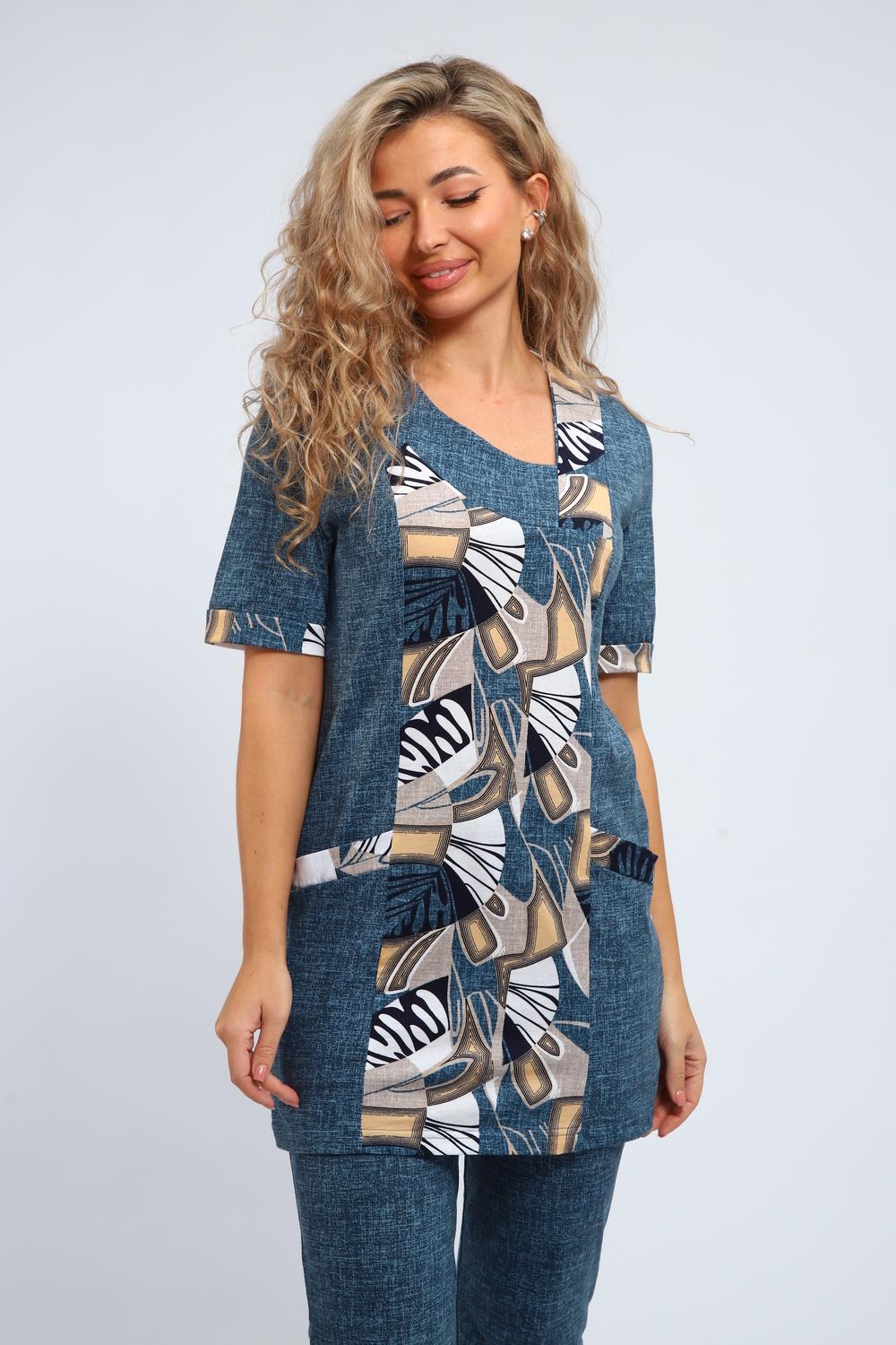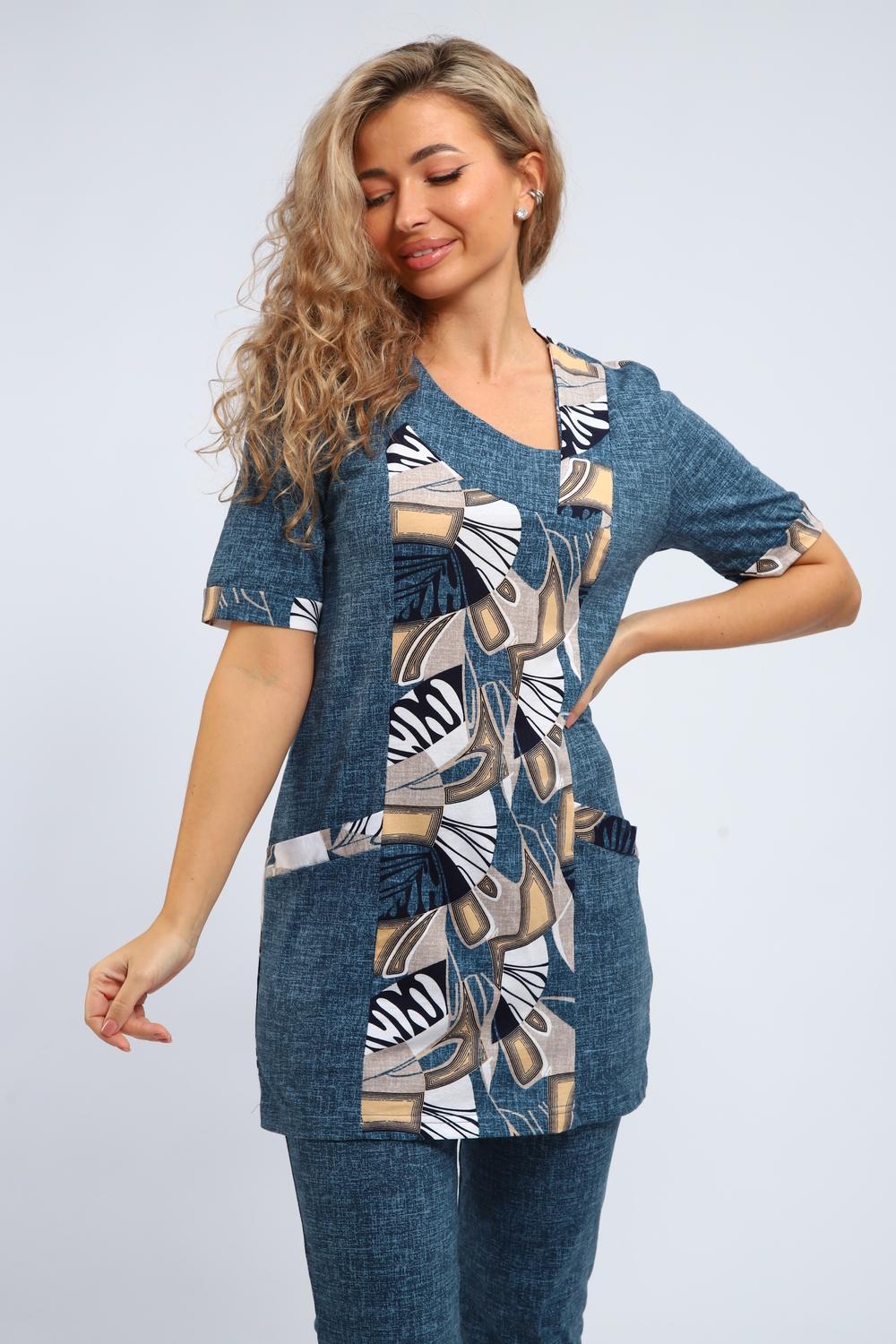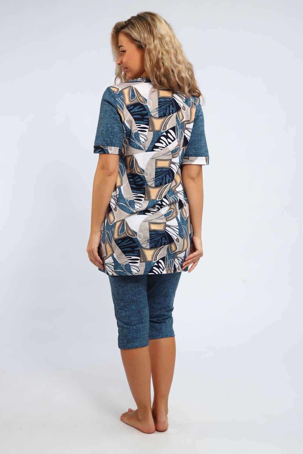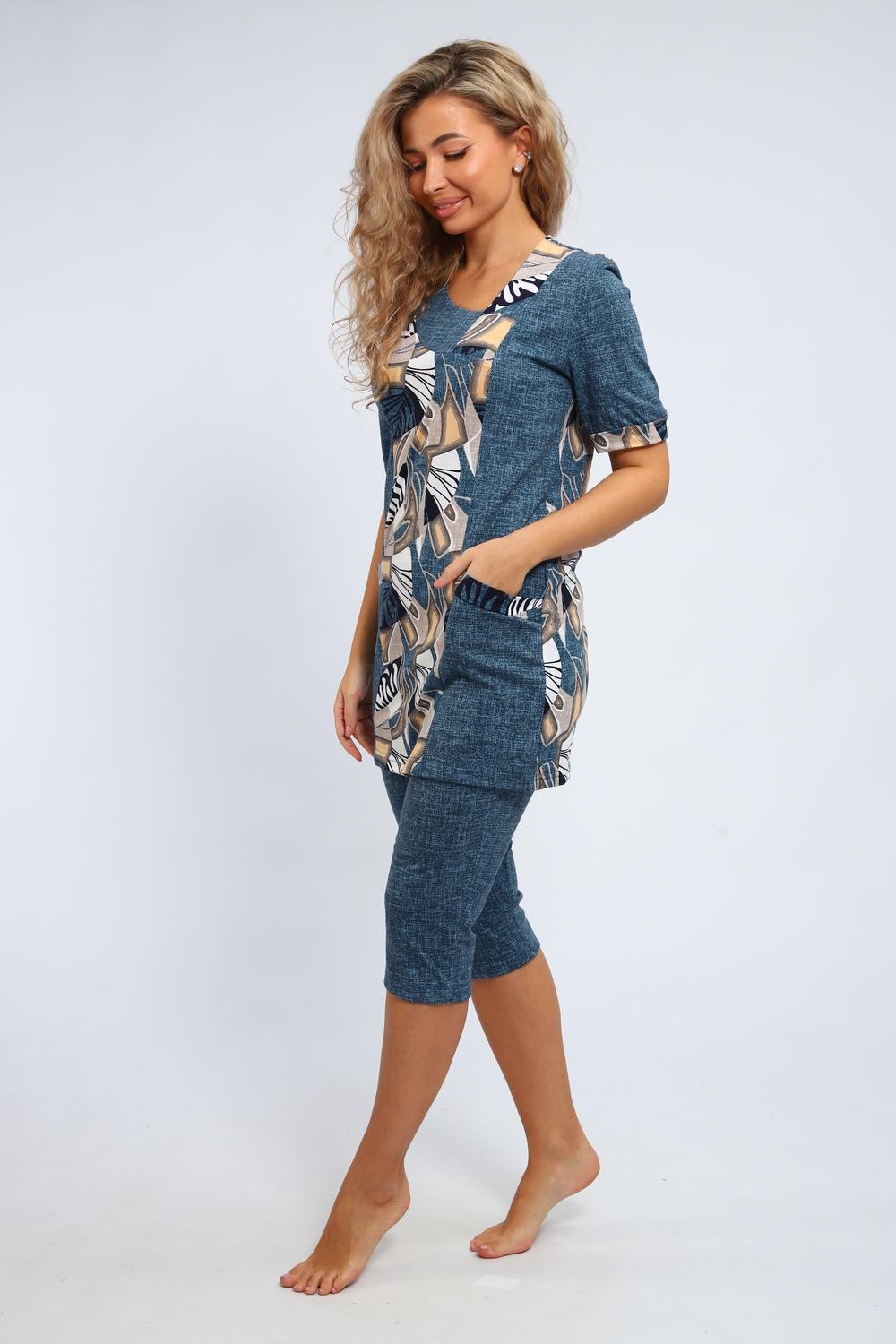Женский костюм выполнен из мягкого хлопка, поэтому в нем комфортно в любое время года. Такой трикотажный костюм легко использовать как повседневный наряд для дома. Фасон продуман до мелочей: удобный крой туники с карманами и коротким рукавом отлично подходит как летний вариант, а в прохладное время костюм можно носить как демисезонный. Для полных женщин костюм станет удачным решением: эластичный материал хорошо садится на фигуру и не сковывает движений, долго сохраняет аккуратный вид, не вытягивается и остаётся привлекательным даже при длительном использовании. Благодаря мягкой ткани и свободному крою в нем удобно отдыхать дома