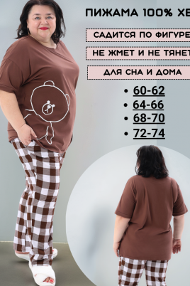 Костюм состоит из туники и шорт. Туника прямая, свободная, с резинкой по талии, с ушками на капюшоне, с разрезами в нижней части боковых швов. Рукав короткий. Шорты прямые, на поясе, с накладными карманами спереди. Вдоль боковых швов расположены молнии.