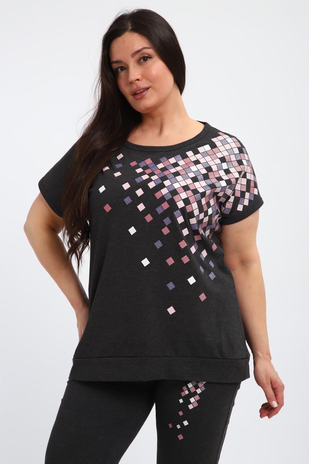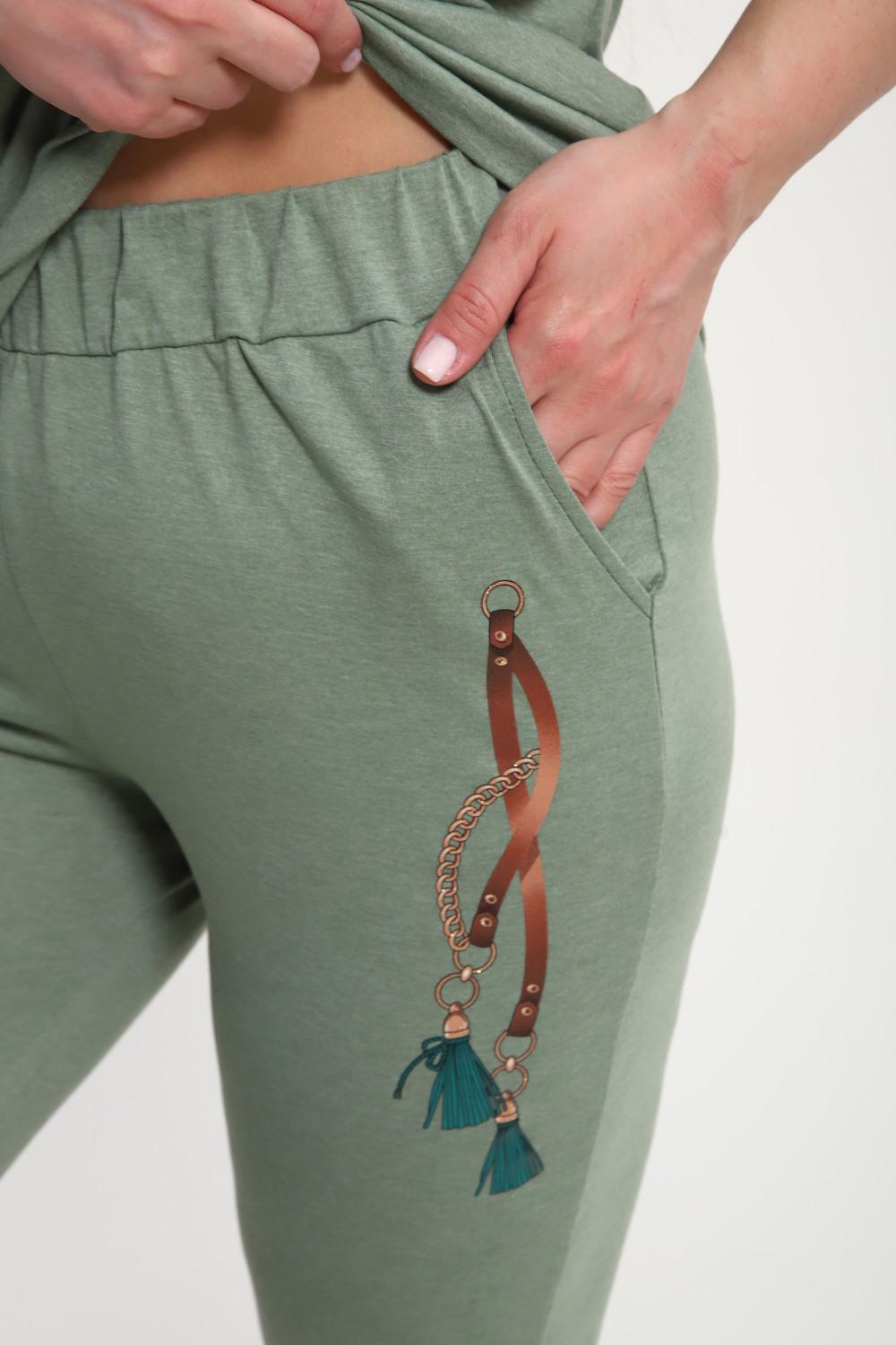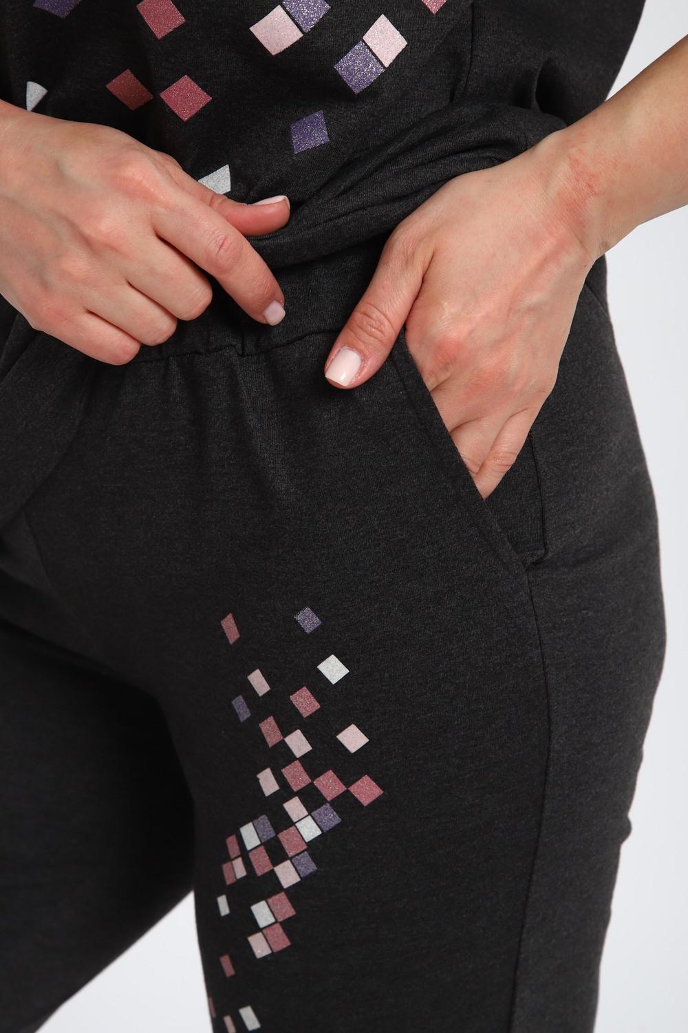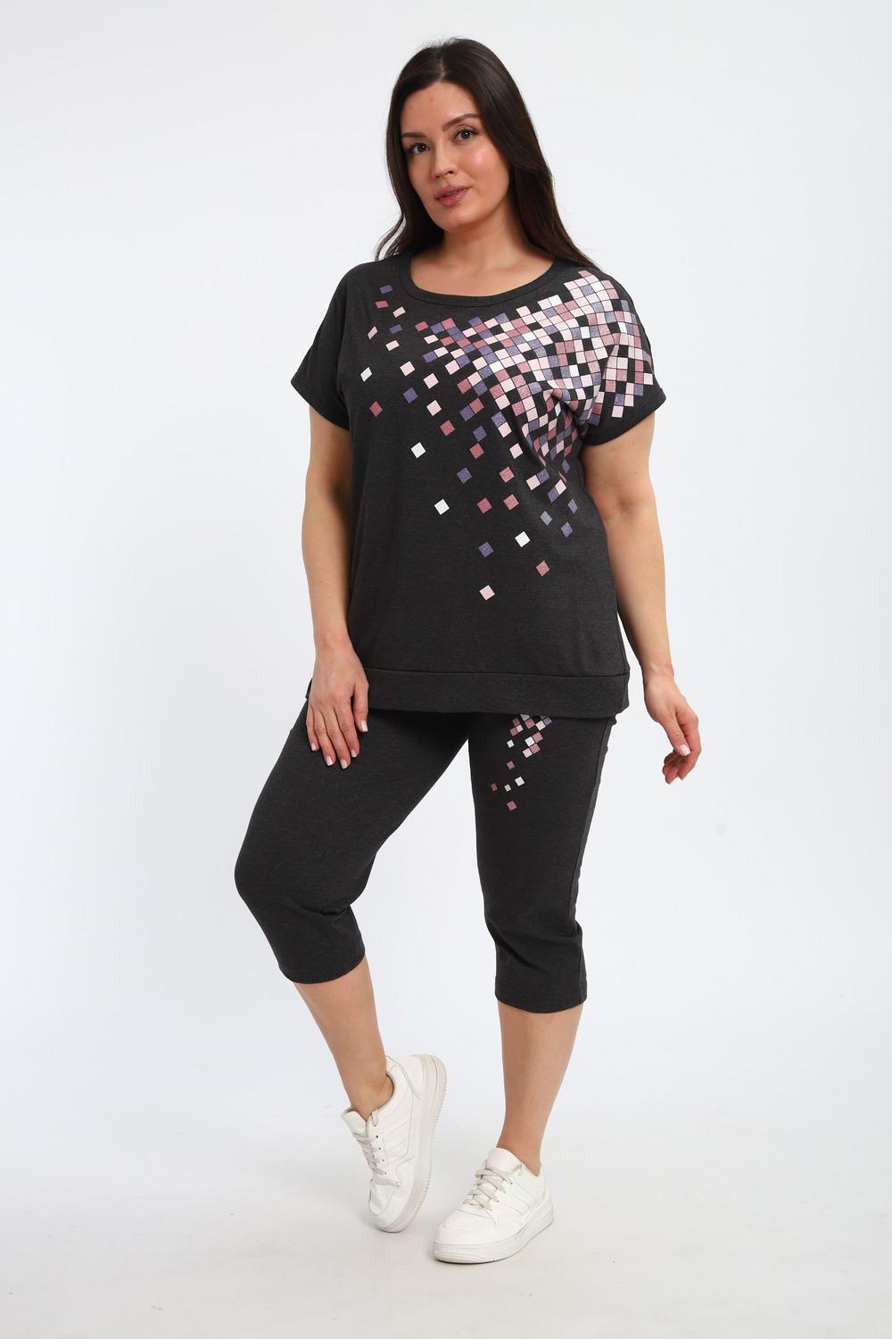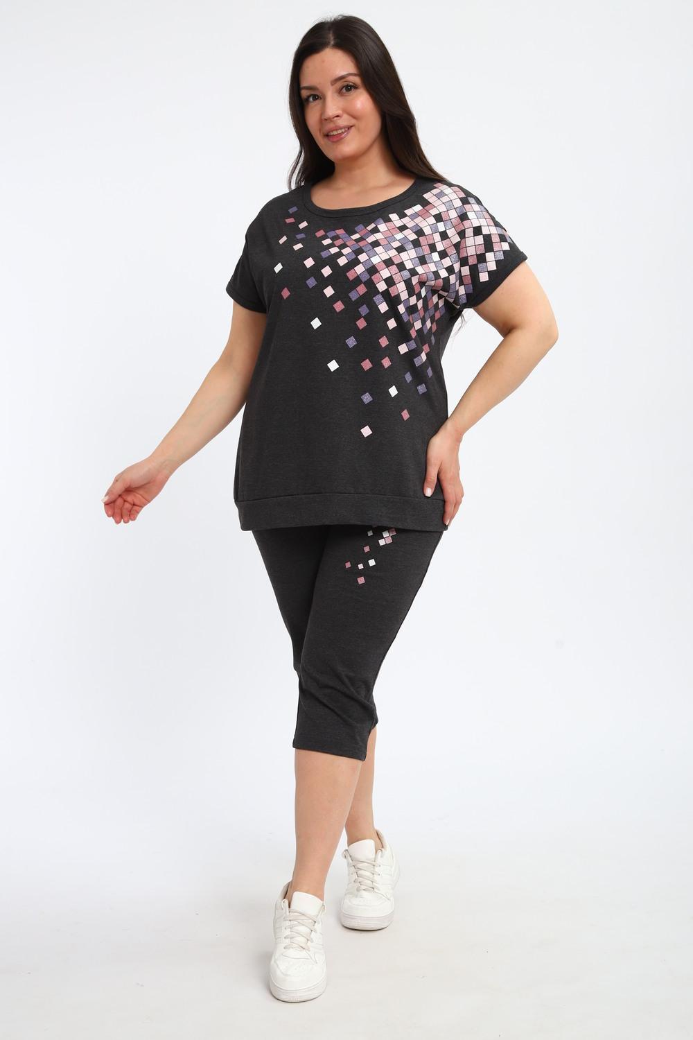 Женский домашний костюм с бриджами выполнен из комфортного материала, в составе которого 50% хлопок и 50% ПЭ, что обеспечивает приятные тактильные ощущения и простоту ухода. Модель представлена в графитовом цвете, изумрудном цвете и фисташковом цвете которые подчеркивают стиль и современность образа. Футболка имеет свободный крой, короткий рукав и круглый вырез, обеспечивая удобство и свободу движений в повседневной носке. На передней части футболки выполнена печать методом шелкографии, что гарантирует долговечность рисунка и устойчивость к стиркам. Бриджи средней длины, с эластичным поясом, хорошо сидят на фигуре и подходят для женщин больших размеров. Благодаря продуманной конструкции, костюм подходит для домашнего отдыха, прогулок и легких занятий спортом. Собственное производство гарантирует контроль качества на всех этапах изготовления. Материал дышащий и приятный к телу, не вызывает раздражения. Костюм с бриджами хорошо сохраняет форму после многочисленных стирок, не теряет насыщенность цвета и не деформируется.