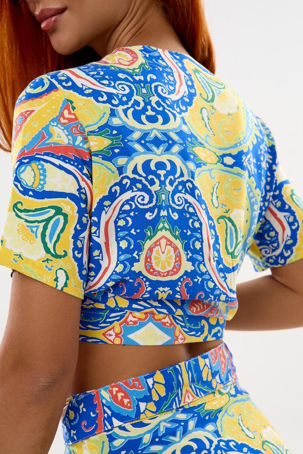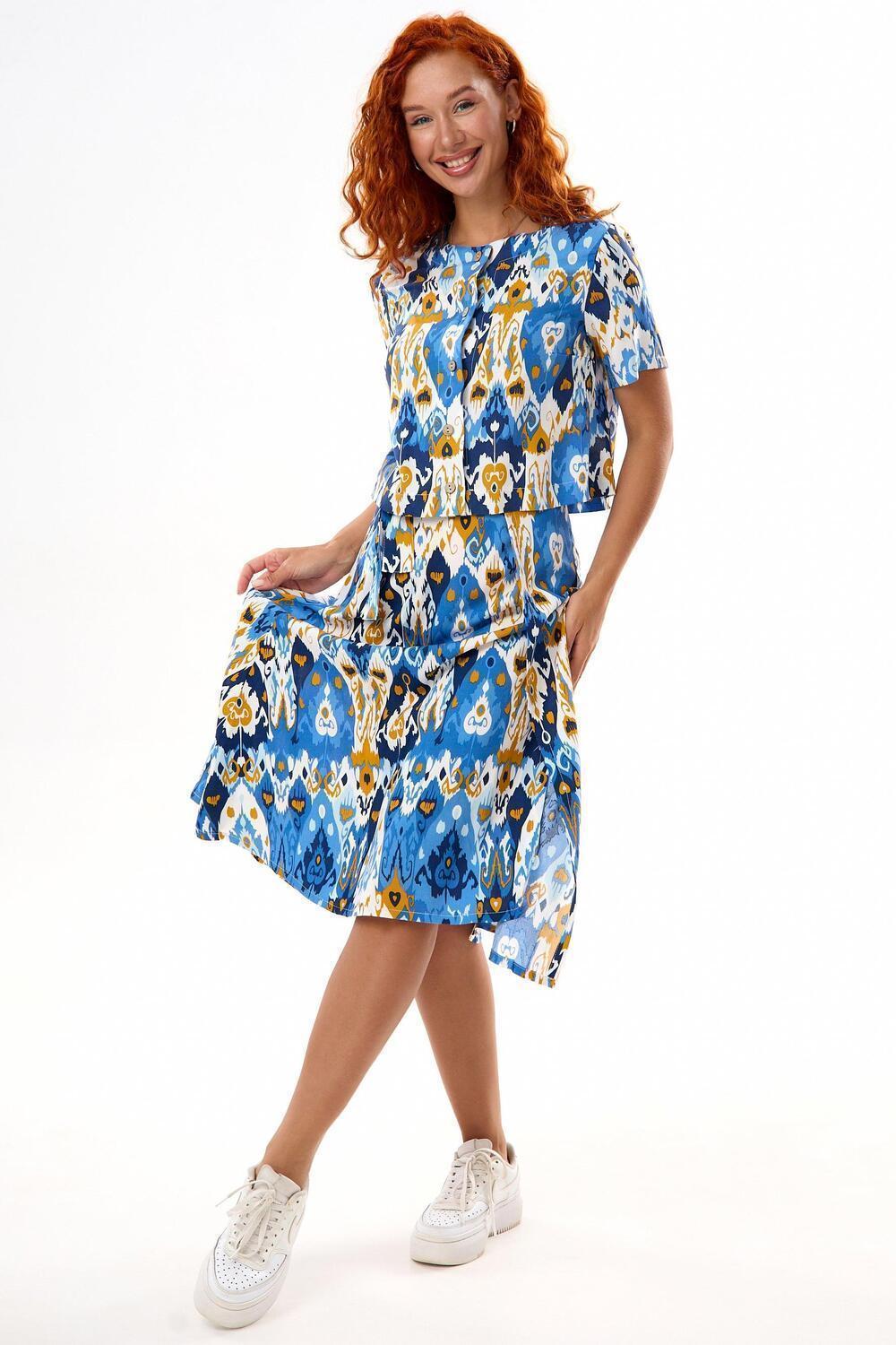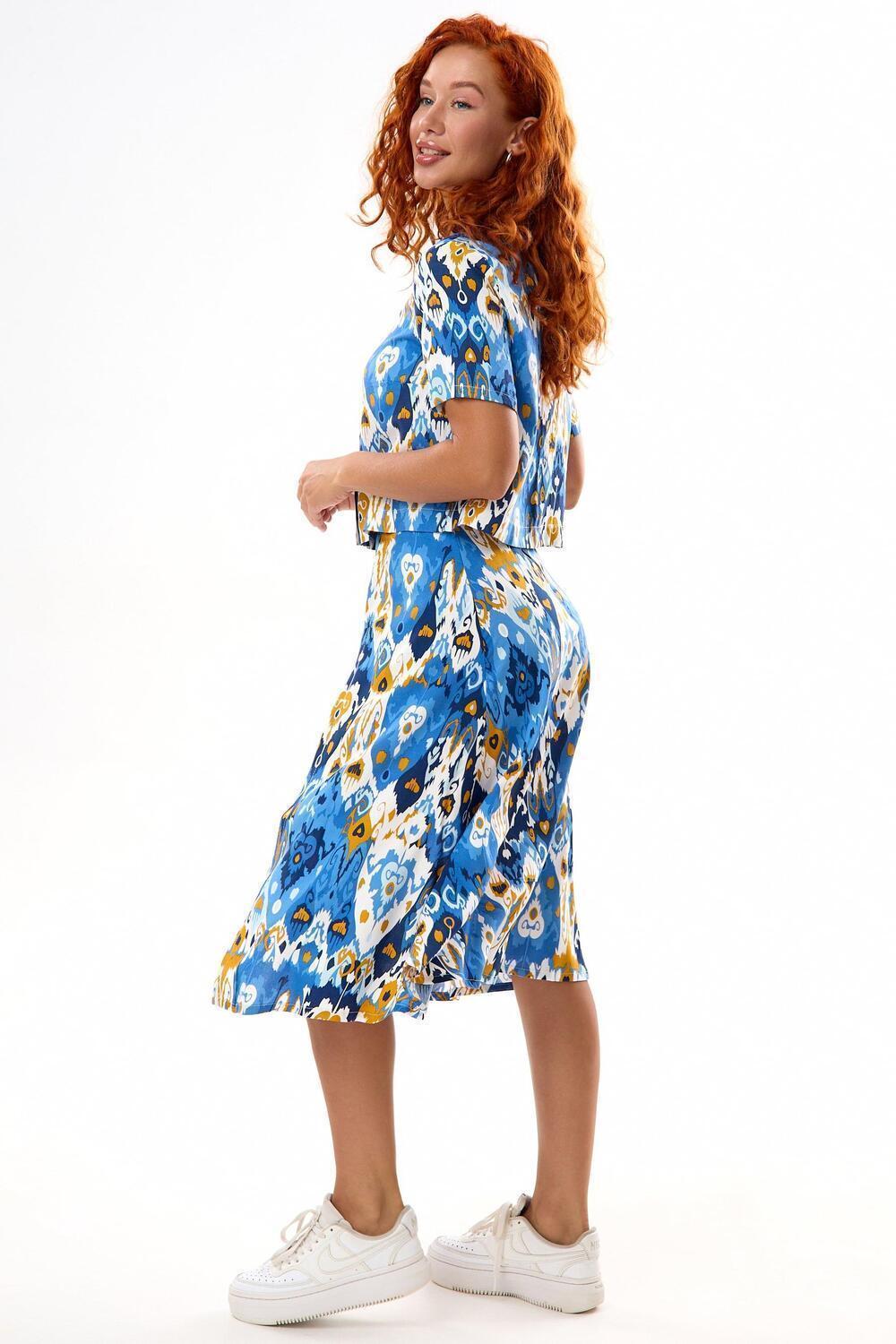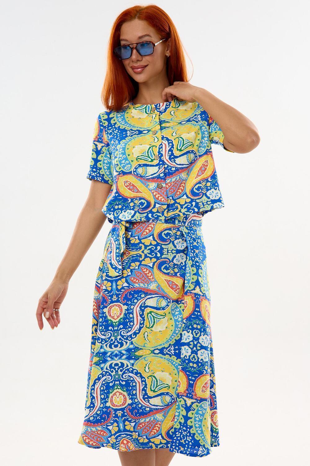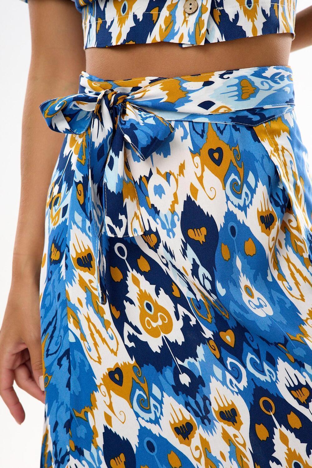 Костюм выполнен из лёгкого и приятного к телу штапеля. Модель состоит из укороченной блузы на пуговицах с втачным коротким рукавом и юбки длины миди с запа́хом и удобной завязкой, позволяющей регулировать посадку по фигуре. Комплект выглядит женственно и современно, не стесняет движений и отлично подходит для летних прогулок, поездок или похода на работу, когда хочется чувствовать комфорт и выглядеть стильно.