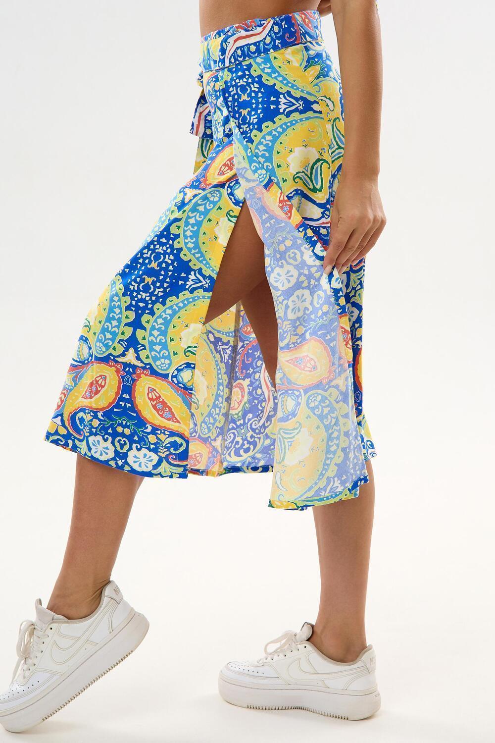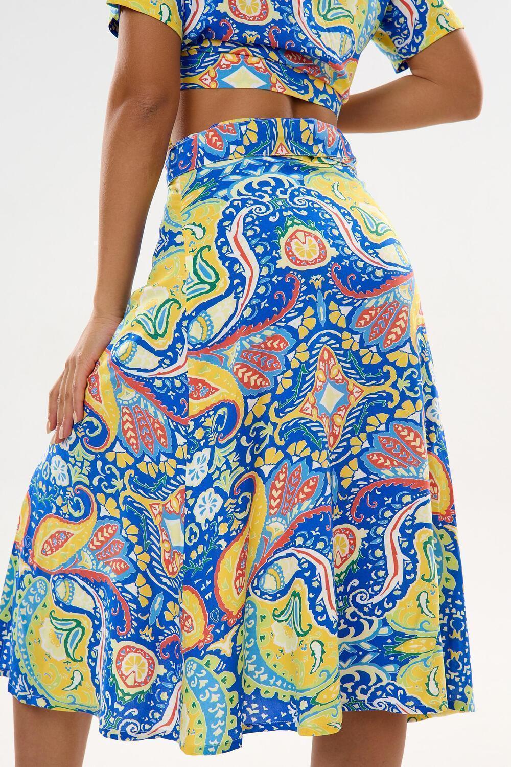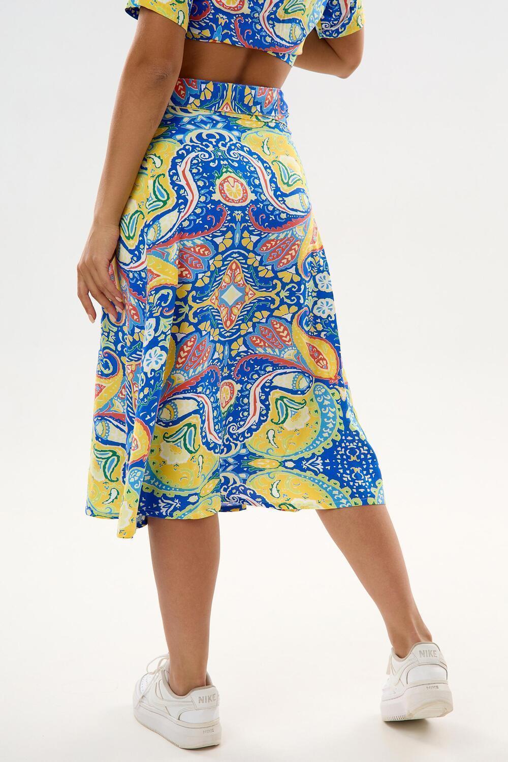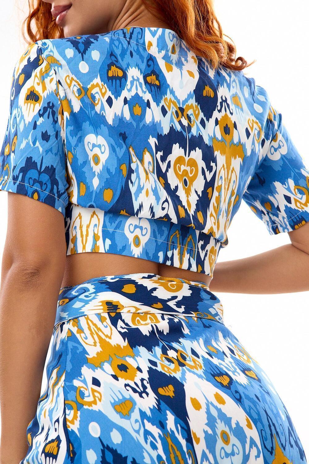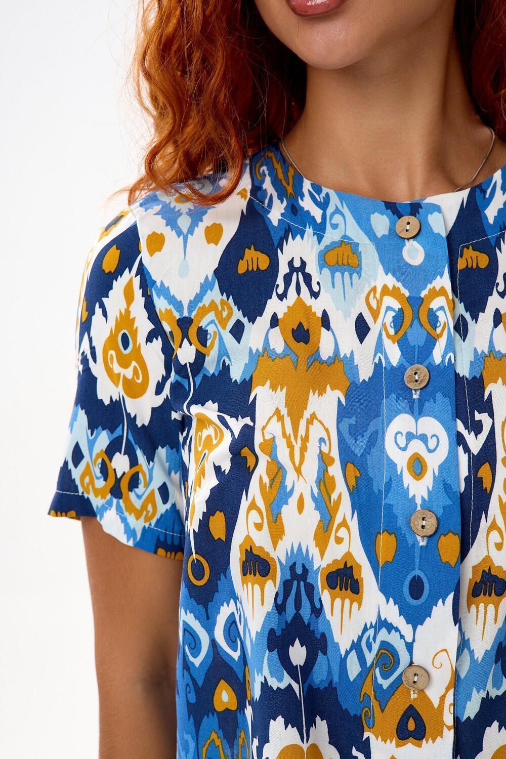 Костюм выполнен из лёгкого и приятного к телу штапеля. Модель состоит из укороченной блузы на пуговицах с втачным коротким рукавом и юбки длины миди с запа́хом и удобной завязкой, позволяющей регулировать посадку по фигуре. Комплект выглядит женственно и современно, не стесняет движений и отлично подходит для летних прогулок, поездок или похода на работу, когда хочется чувствовать комфорт и выглядеть стильно.