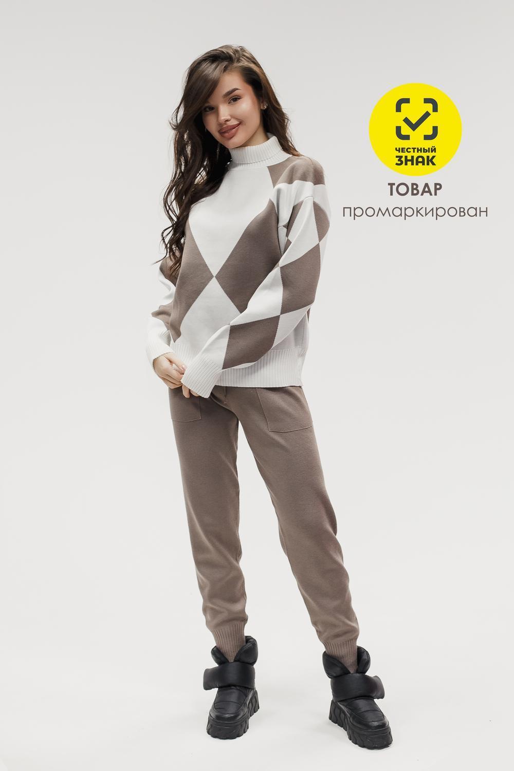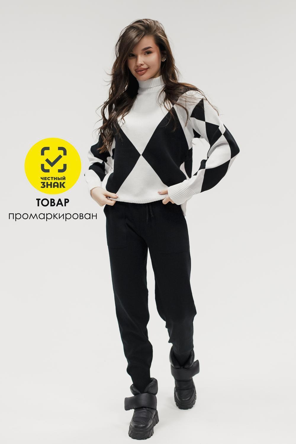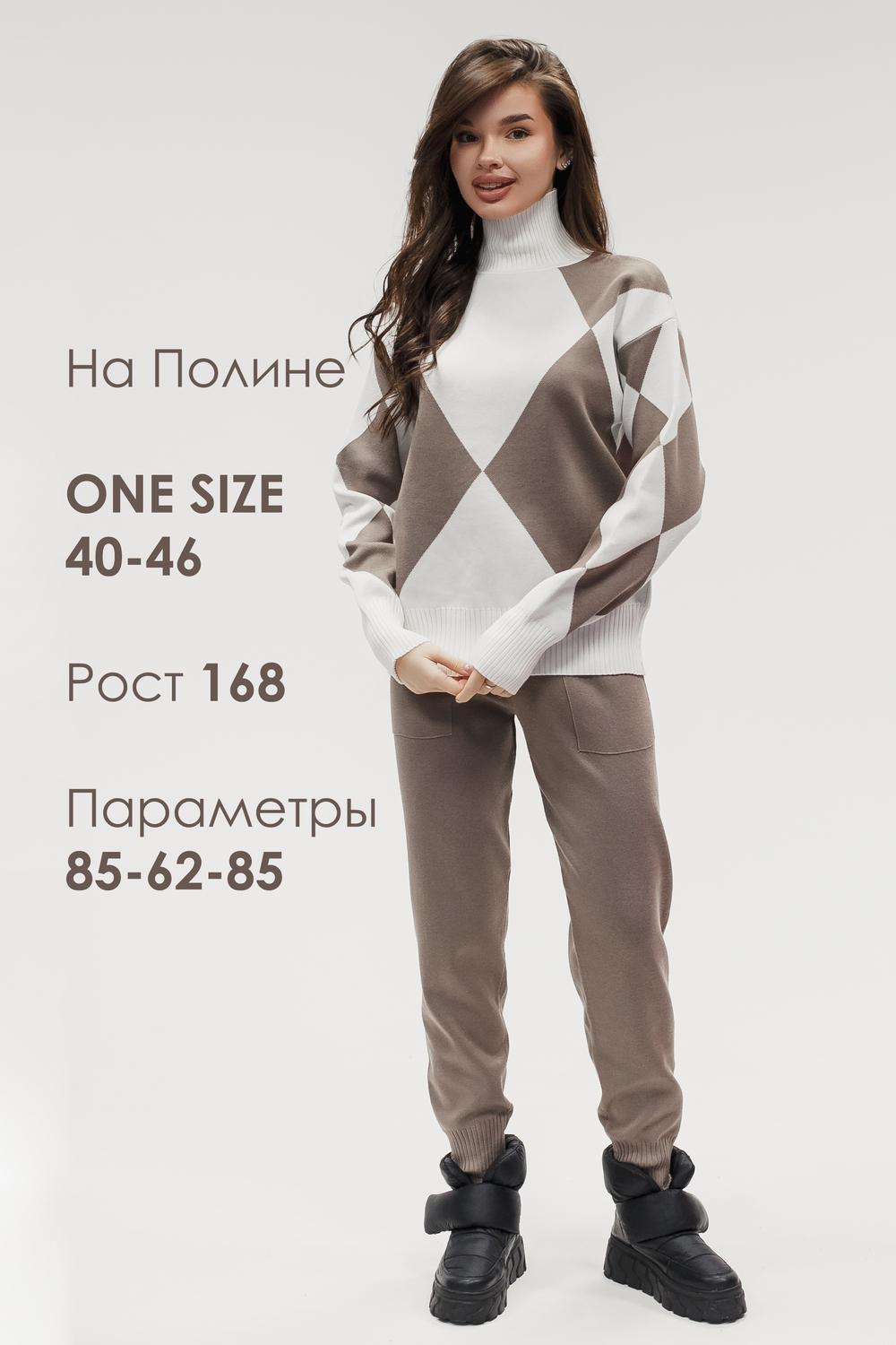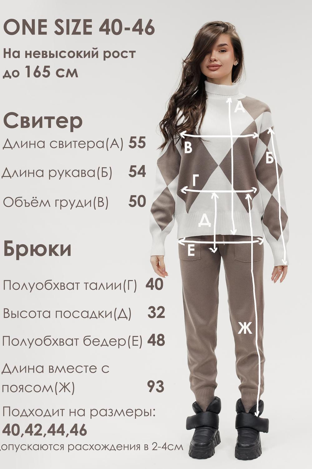 Этот тёплый женский вязаный костюм — гармоничный комплект из свитера и брюк, выполненный из плотной, мягкой и эластичной пряжи (состав: 30% хлопок, 40% вискоза, 30% полиэстер), который надёжно сохраняет тепло и при этом приятно прилегает к телу. Свитер свободногос аккуратной воротниковой стойкой средней высоты визуально стройнит и обеспечивает дополнительную защиту от холода, манжеты и нижняя кромка обработаны резинкой для лучшей посадки и сохранения формы. Плечи оформлены со скосом или лёгким «полупритёком» для комфортной посадки на фигуры разных типов; брюки средней посадки с эластичным поясом и внутренней мягкой тесьмой или шнурком обеспечивают индивидуальную регулировку, прямой или слегка зауженный книзу силуэт свободно сидит по бедру и книзу, благодаря эластичности материала изделие «тянется» и адаптируется под параметры от 40 до 46 размера и комфортно смотрится на росте до 160 см, при этом посадка и длина оптимизированы под невысокий рост — брюки не требуют сильной подшивки, а длина пуловера рассчитана так, чтобы сочетаться с верхней одеждой; в дизайне предусмотрены функциональные детали: скрытые боковые или накладные карманы в брюках, аккуратные декоративные швы или узорная вязка на передней части пуловера, что добавляет текстуре и визуального интереса, при этом декоративность не мешает повседневному использованию; палитра — нейтральные базовые оттенки (беж, серый, графит, тёмно-синий) и несколько насыщенных цветовых акцентов (бордо, изумруд, горчичный), которые легко сочетаются с верхней одеждой и аксессуарами; материал и плотная вязка делают костюм универсальным для осенне-зимнего периода и прохладной весны — он отлично подойдёт как для прогулок и поездок, так и для уютных домашних вечеров или неофициальных встреч; уход: рекомендована деликатная стирка руками или в машине на щадящем режиме при температуре не выше 30°C, сушить в расправленном виде на горизонтальной поверхности, не отбеливать, при необходимости возможна бережная химчистка; благодаря продуманной посадке и использованию качественной пряжи комплект сохраняет форму и внешний вид даже при регулярной носке, подчёркивает женственность без лишней вычурности и станет практичным элементом гардероба тех, кто ценит комфорт, тепло и стиль.