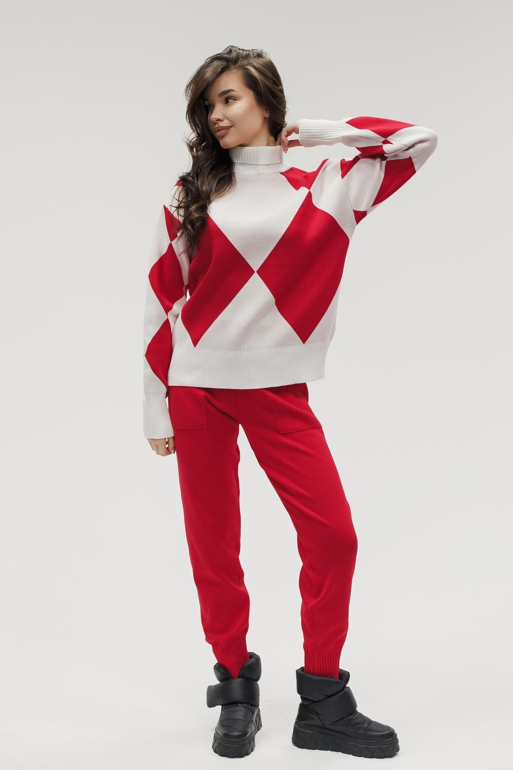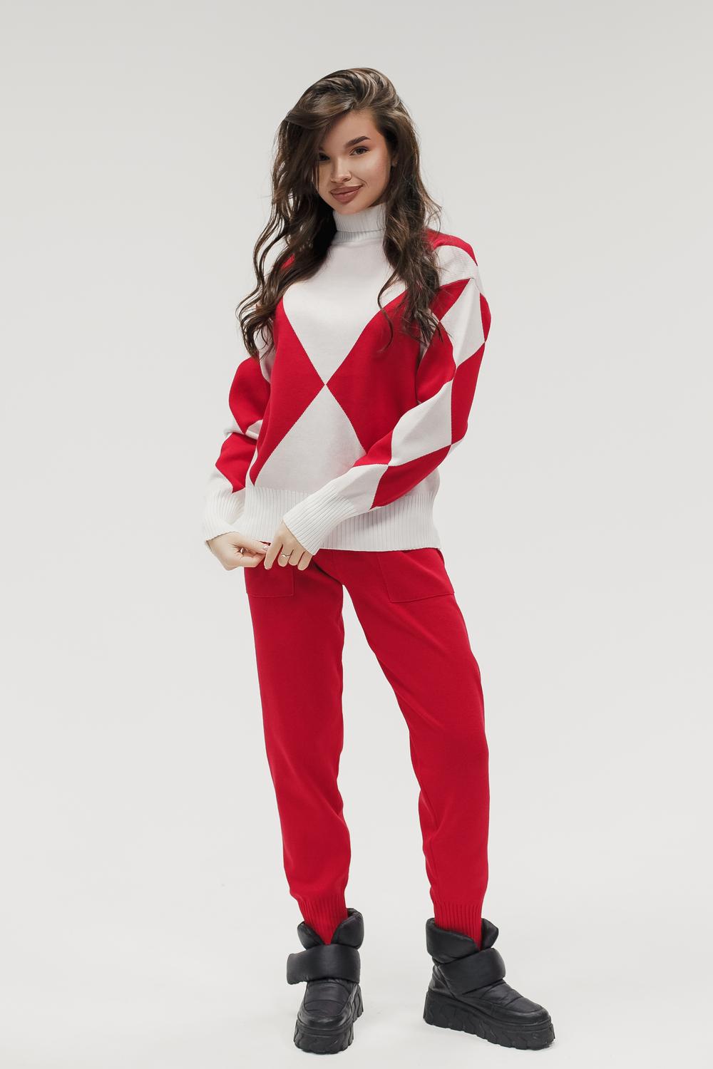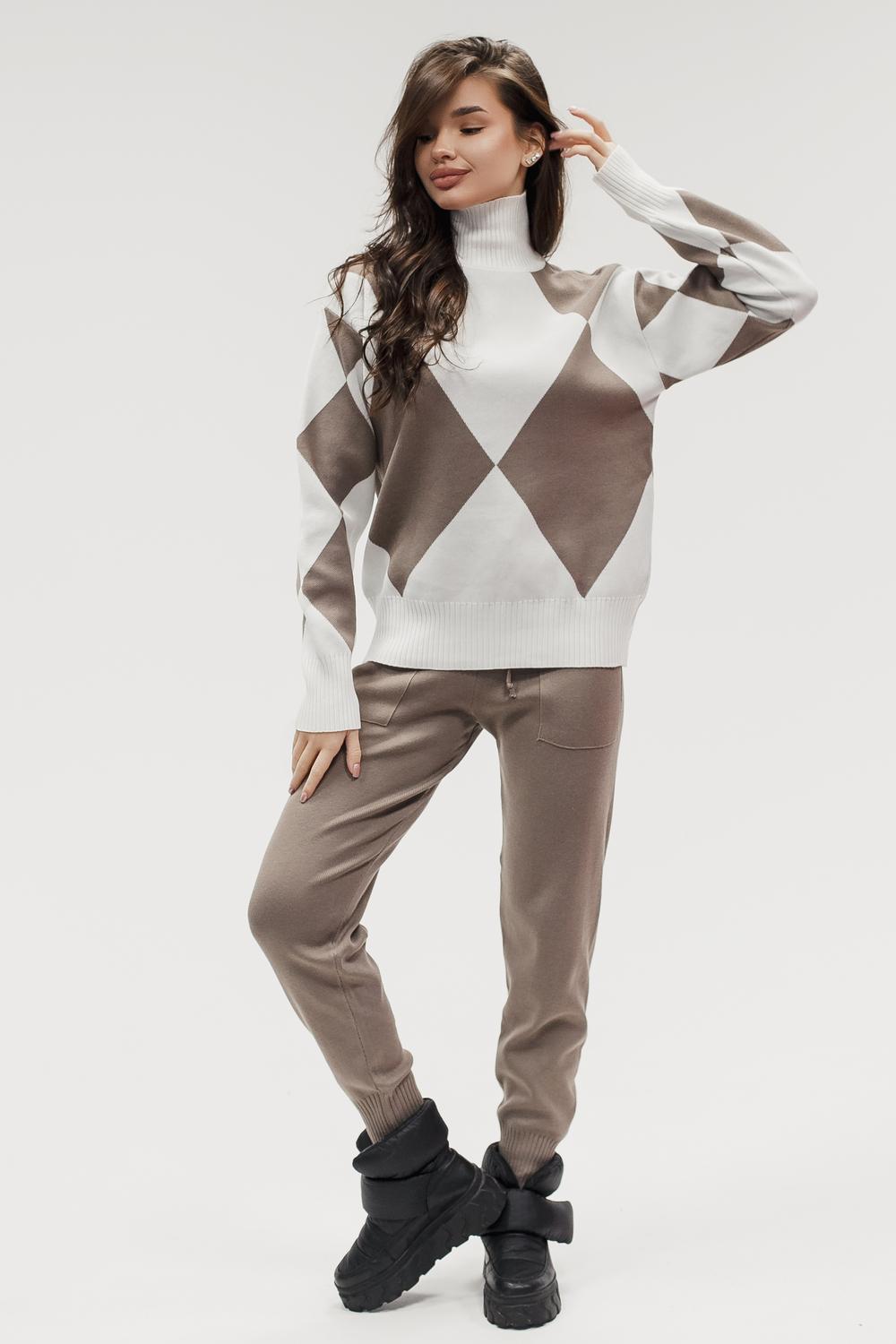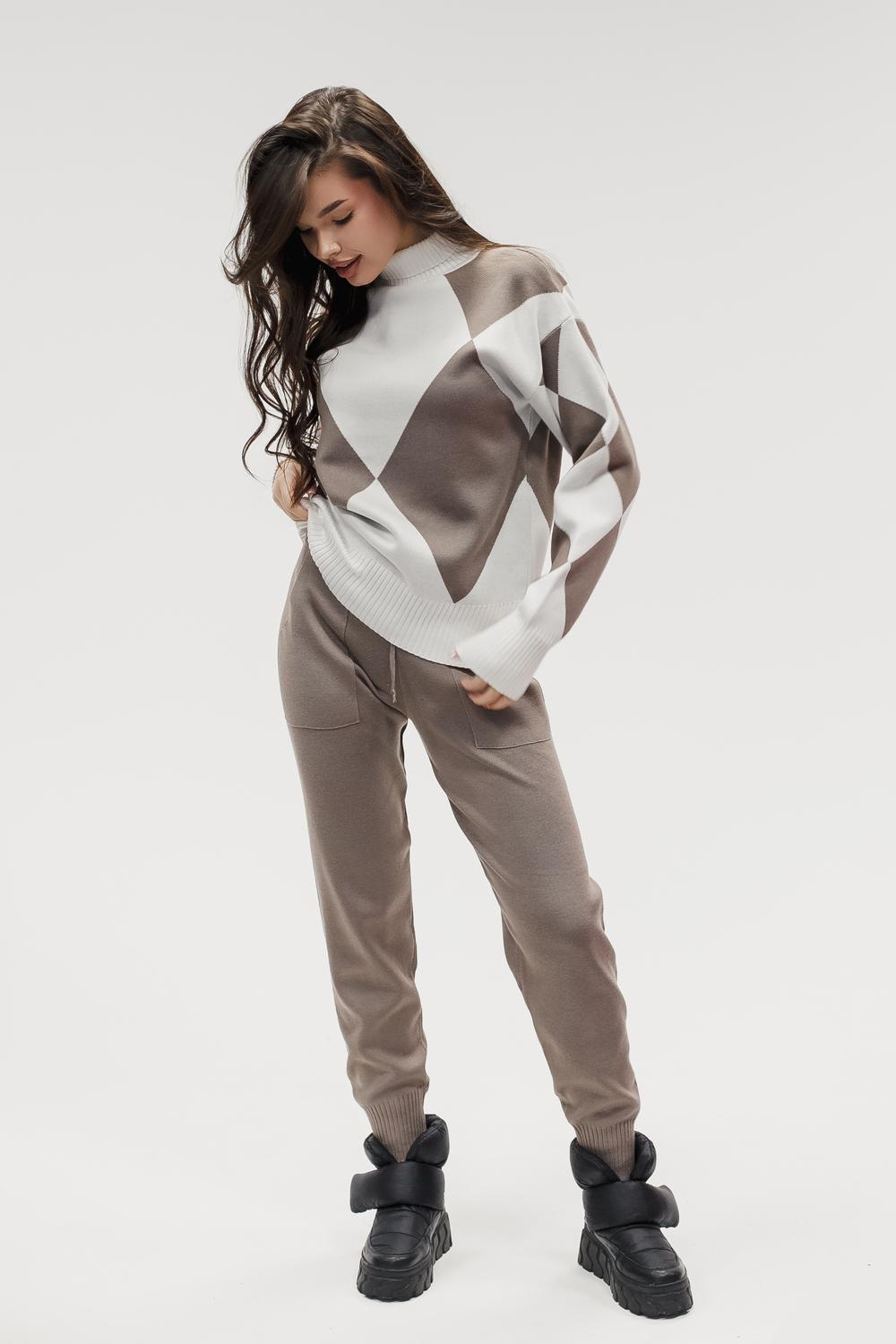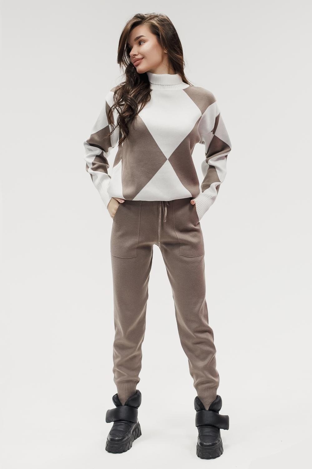 Этот тёплый женский вязаный костюм — гармоничный комплект из свитера и брюк, выполненный из плотной, мягкой и эластичной пряжи (состав: 30% хлопок, 40% вискоза, 30% полиэстер), который надёжно сохраняет тепло и при этом приятно прилегает к телу. Свитер свободногос аккуратной воротниковой стойкой средней высоты визуально стройнит и обеспечивает дополнительную защиту от холода, манжеты и нижняя кромка обработаны резинкой для лучшей посадки и сохранения формы. Плечи оформлены со скосом или лёгким «полупритёком» для комфортной посадки на фигуры разных типов; брюки средней посадки с эластичным поясом и внутренней мягкой тесьмой или шнурком обеспечивают индивидуальную регулировку, прямой или слегка зауженный книзу силуэт свободно сидит по бедру и книзу, благодаря эластичности материала изделие «тянется» и адаптируется под параметры от 40 до 46 размера и комфортно смотрится на росте до 160 см, при этом посадка и длина оптимизированы под невысокий рост — брюки не требуют сильной подшивки, а длина пуловера рассчитана так, чтобы сочетаться с верхней одеждой; в дизайне предусмотрены функциональные детали: скрытые боковые или накладные карманы в брюках, аккуратные декоративные швы или узорная вязка на передней части пуловера, что добавляет текстуре и визуального интереса, при этом декоративность не мешает повседневному использованию; палитра — нейтральные базовые оттенки (беж, серый, графит, тёмно-синий) и несколько насыщенных цветовых акцентов (бордо, изумруд, горчичный), которые легко сочетаются с верхней одеждой и аксессуарами; материал и плотная вязка делают костюм универсальным для осенне-зимнего периода и прохладной весны — он отлично подойдёт как для прогулок и поездок, так и для уютных домашних вечеров или неофициальных встреч; уход: рекомендована деликатная стирка руками или в машине на щадящем режиме при температуре не выше 30°C, сушить в расправленном виде на горизонтальной поверхности, не отбеливать, при необходимости возможна бережная химчистка; благодаря продуманной посадке и использованию качественной пряжи комплект сохраняет форму и внешний вид даже при регулярной носке, подчёркивает женственность без лишней вычурности и станет практичным элементом гардероба тех, кто ценит комфорт, тепло и стиль.