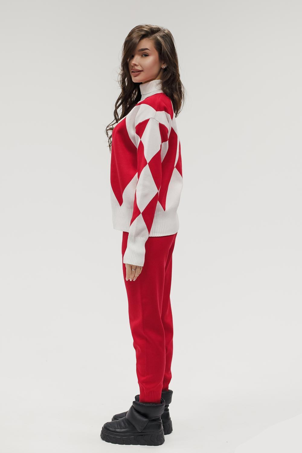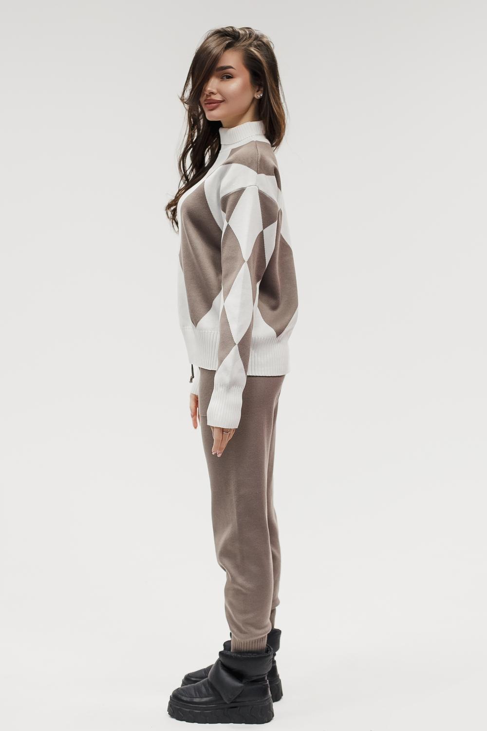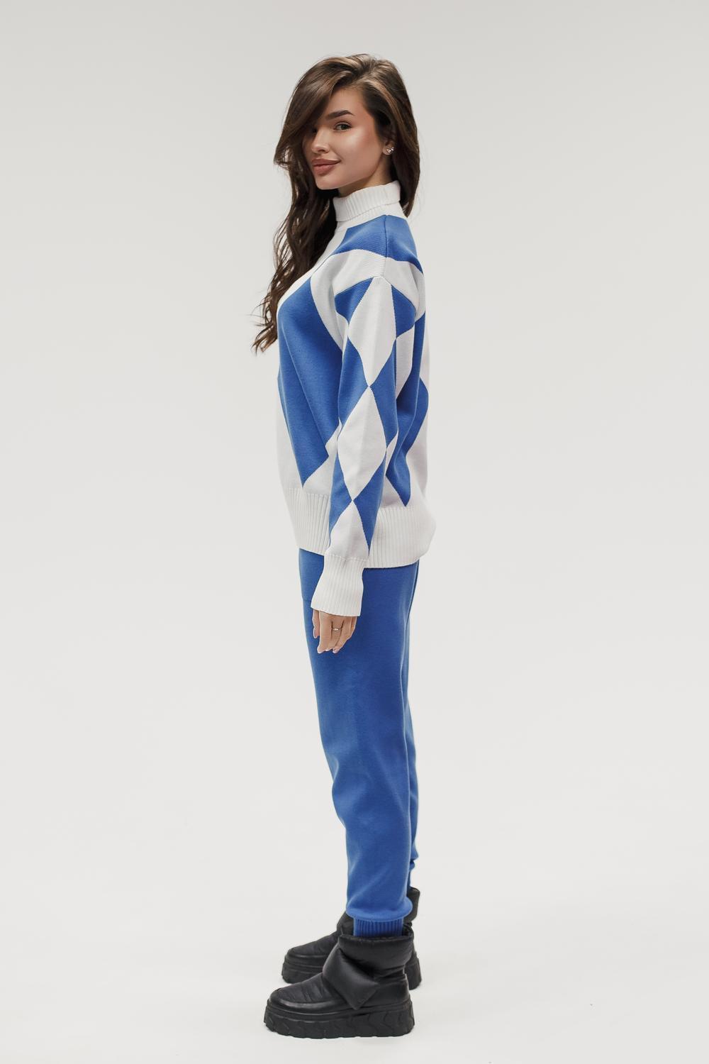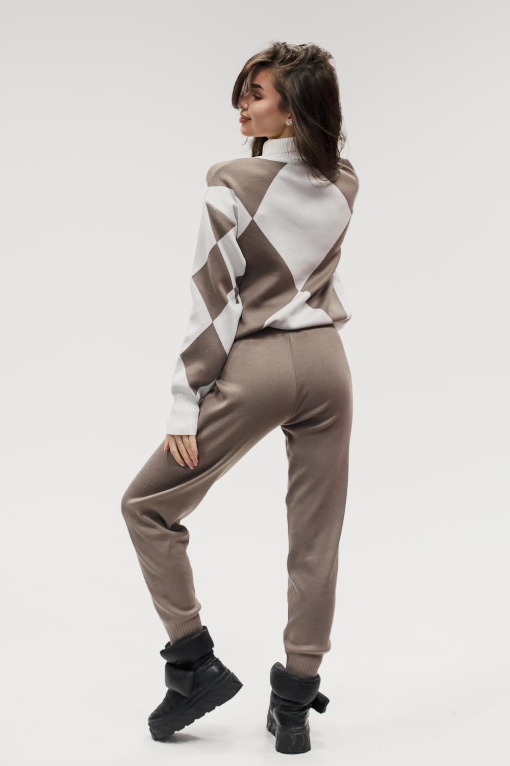 Этот тёплый женский вязаный костюм — гармоничный комплект из свитера и брюк, выполненный из плотной, мягкой и эластичной пряжи (состав: 30% хлопок, 40% вискоза, 30% полиэстер), который надёжно сохраняет тепло и при этом приятно прилегает к телу. Свитер свободногос аккуратной воротниковой стойкой средней высоты визуально стройнит и обеспечивает дополнительную защиту от холода, манжеты и нижняя кромка обработаны резинкой для лучшей посадки и сохранения формы. Плечи оформлены со скосом или лёгким «полупритёком» для комфортной посадки на фигуры разных типов; брюки средней посадки с эластичным поясом и внутренней мягкой тесьмой или шнурком обеспечивают индивидуальную регулировку, прямой или слегка зауженный книзу силуэт свободно сидит по бедру и книзу, благодаря эластичности материала изделие «тянется» и адаптируется под параметры от 40 до 46 размера и комфортно смотрится на росте до 160 см, при этом посадка и длина оптимизированы под невысокий рост — брюки не требуют сильной подшивки, а длина пуловера рассчитана так, чтобы сочетаться с верхней одеждой; в дизайне предусмотрены функциональные детали: скрытые боковые или накладные карманы в брюках, аккуратные декоративные швы или узорная вязка на передней части пуловера, что добавляет текстуре и визуального интереса, при этом декоративность не мешает повседневному использованию; палитра — нейтральные базовые оттенки (беж, серый, графит, тёмно-синий) и несколько насыщенных цветовых акцентов (бордо, изумруд, горчичный), которые легко сочетаются с верхней одеждой и аксессуарами; материал и плотная вязка делают костюм универсальным для осенне-зимнего периода и прохладной весны — он отлично подойдёт как для прогулок и поездок, так и для уютных домашних вечеров или неофициальных встреч; уход: рекомендована деликатная стирка руками или в машине на щадящем режиме при температуре не выше 30°C, сушить в расправленном виде на горизонтальной поверхности, не отбеливать, при необходимости возможна бережная химчистка; благодаря продуманной посадке и использованию качественной пряжи комплект сохраняет форму и внешний вид даже при регулярной носке, подчёркивает женственность без лишней вычурности и станет практичным элементом гардероба тех, кто ценит комфорт, тепло и стиль.