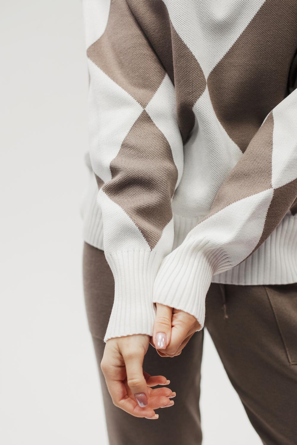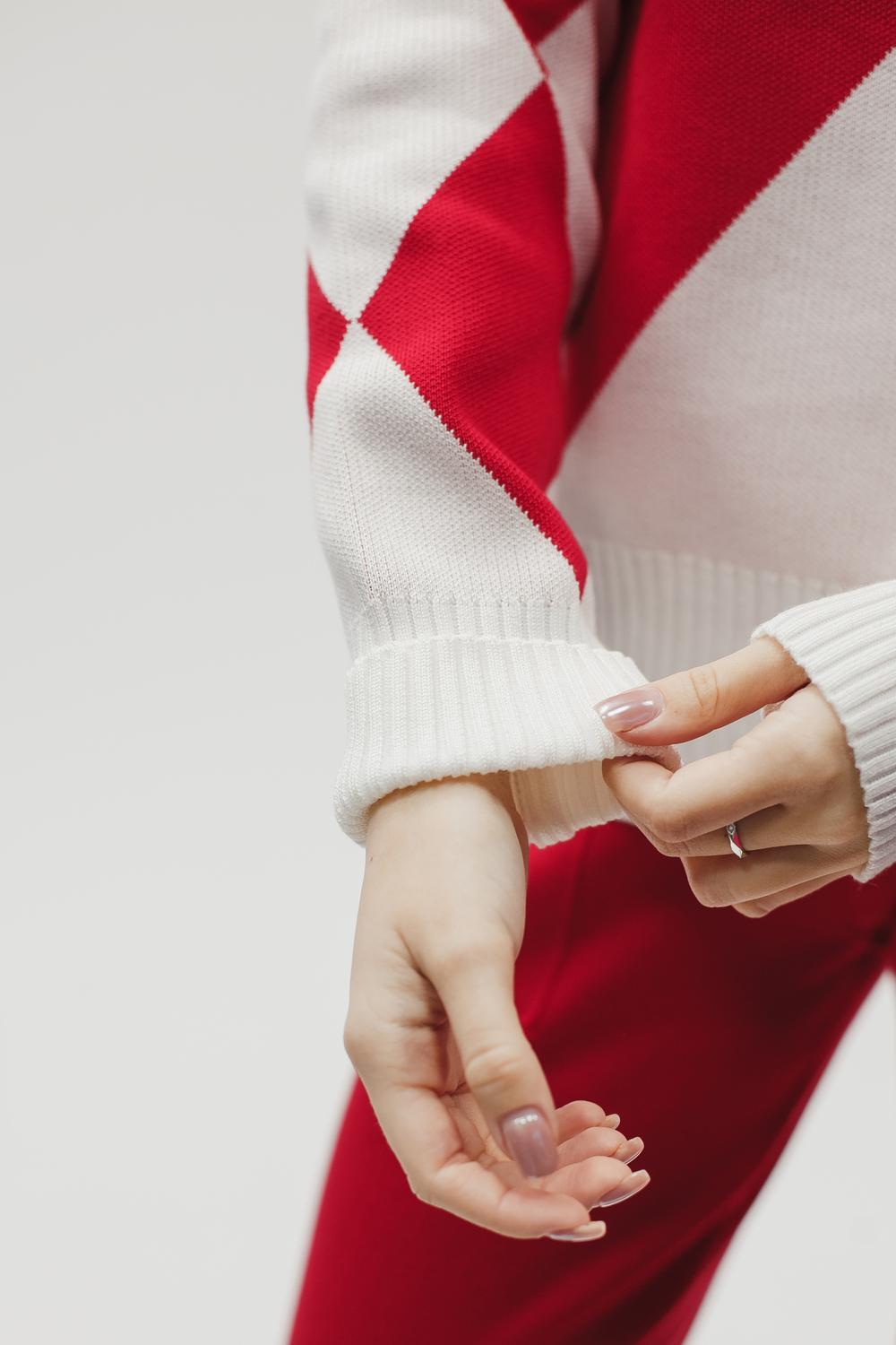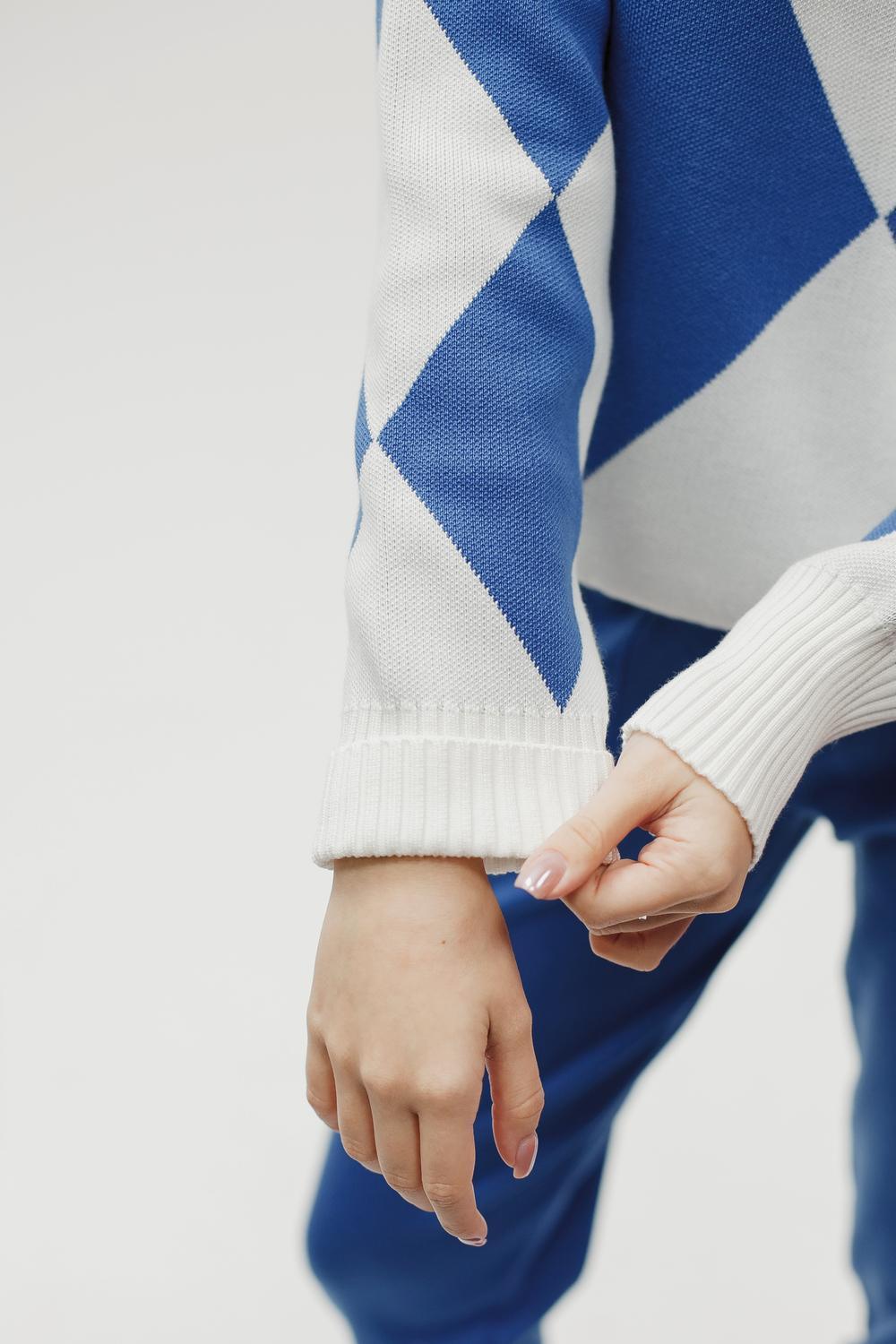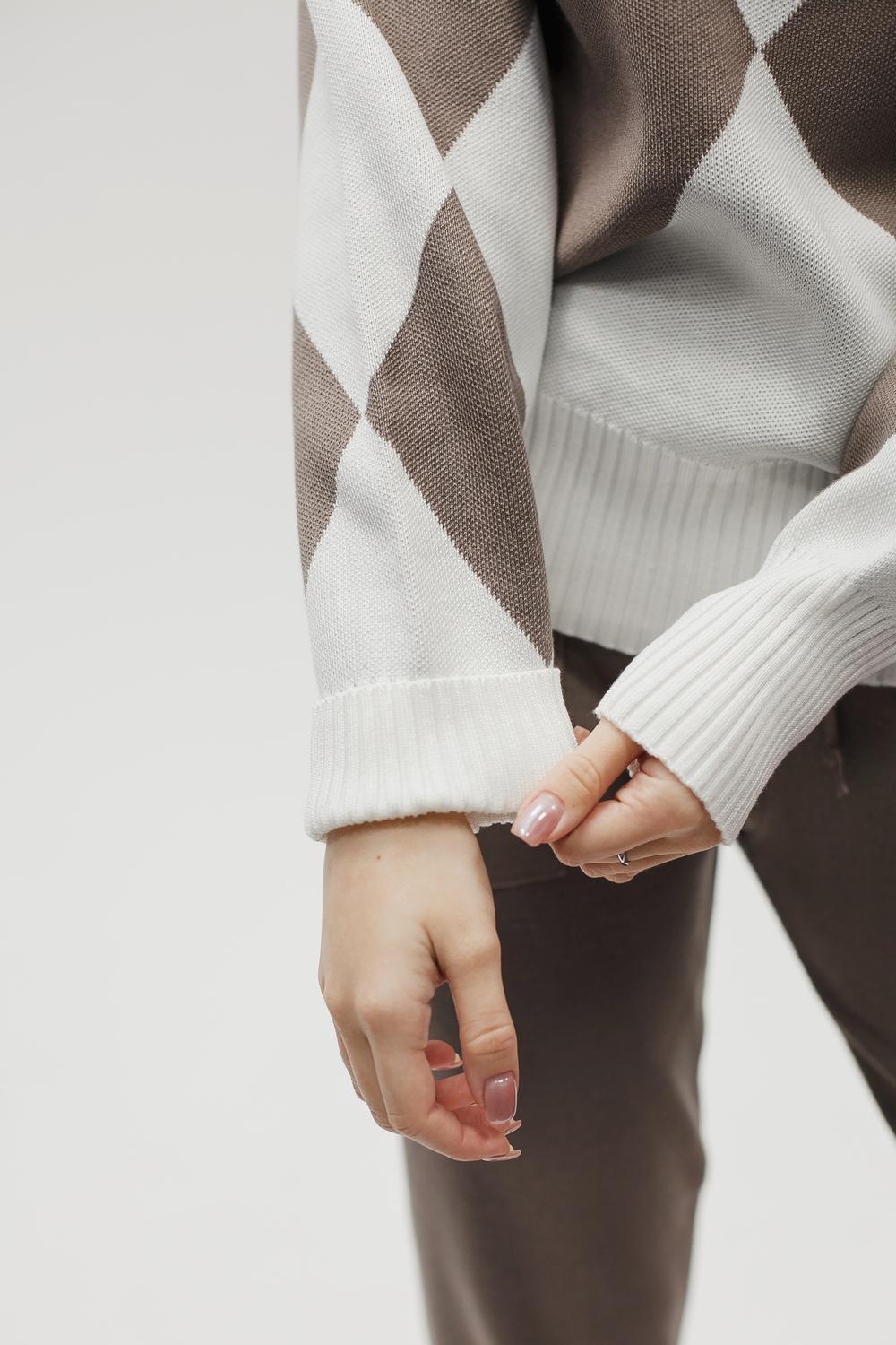 Этот тёплый женский вязаный костюм — гармоничный комплект из свитера и брюк, выполненный из плотной, мягкой и эластичной пряжи (состав: 30% хлопок, 40% вискоза, 30% полиэстер), который надёжно сохраняет тепло и при этом приятно прилегает к телу. Свитер свободногос аккуратной воротниковой стойкой средней высоты визуально стройнит и обеспечивает дополнительную защиту от холода, манжеты и нижняя кромка обработаны резинкой для лучшей посадки и сохранения формы. Плечи оформлены со скосом или лёгким «полупритёком» для комфортной посадки на фигуры разных типов; брюки средней посадки с эластичным поясом и внутренней мягкой тесьмой или шнурком обеспечивают индивидуальную регулировку, прямой или слегка зауженный книзу силуэт свободно сидит по бедру и книзу, благодаря эластичности материала изделие «тянется» и адаптируется под параметры от 40 до 46 размера и комфортно смотрится на росте до 160 см, при этом посадка и длина оптимизированы под невысокий рост — брюки не требуют сильной подшивки, а длина пуловера рассчитана так, чтобы сочетаться с верхней одеждой; в дизайне предусмотрены функциональные детали: скрытые боковые или накладные карманы в брюках, аккуратные декоративные швы или узорная вязка на передней части пуловера, что добавляет текстуре и визуального интереса, при этом декоративность не мешает повседневному использованию; палитра — нейтральные базовые оттенки (беж, серый, графит, тёмно-синий) и несколько насыщенных цветовых акцентов (бордо, изумруд, горчичный), которые легко сочетаются с верхней одеждой и аксессуарами; материал и плотная вязка делают костюм универсальным для осенне-зимнего периода и прохладной весны — он отлично подойдёт как для прогулок и поездок, так и для уютных домашних вечеров или неофициальных встреч; уход: рекомендована деликатная стирка руками или в машине на щадящем режиме при температуре не выше 30°C, сушить в расправленном виде на горизонтальной поверхности, не отбеливать, при необходимости возможна бережная химчистка; благодаря продуманной посадке и использованию качественной пряжи комплект сохраняет форму и внешний вид даже при регулярной носке, подчёркивает женственность без лишней вычурности и станет практичным элементом гардероба тех, кто ценит комфорт, тепло и стиль.