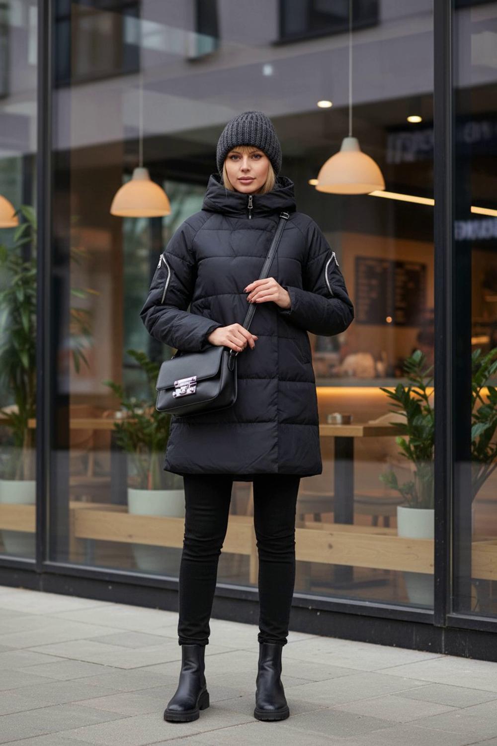 Горизонтальная простежка придает изделию визуальную легкость. Благодаря ей куртка сохраняет идеальную форму, не теряя элегантности, а наполнитель обеспечивает оптимальный уровень теплоизоляции без излишнего веса. Общая длина 88 см закрывает бедра, создавая стройный силуэт и надежно защищая низ спины от холода.