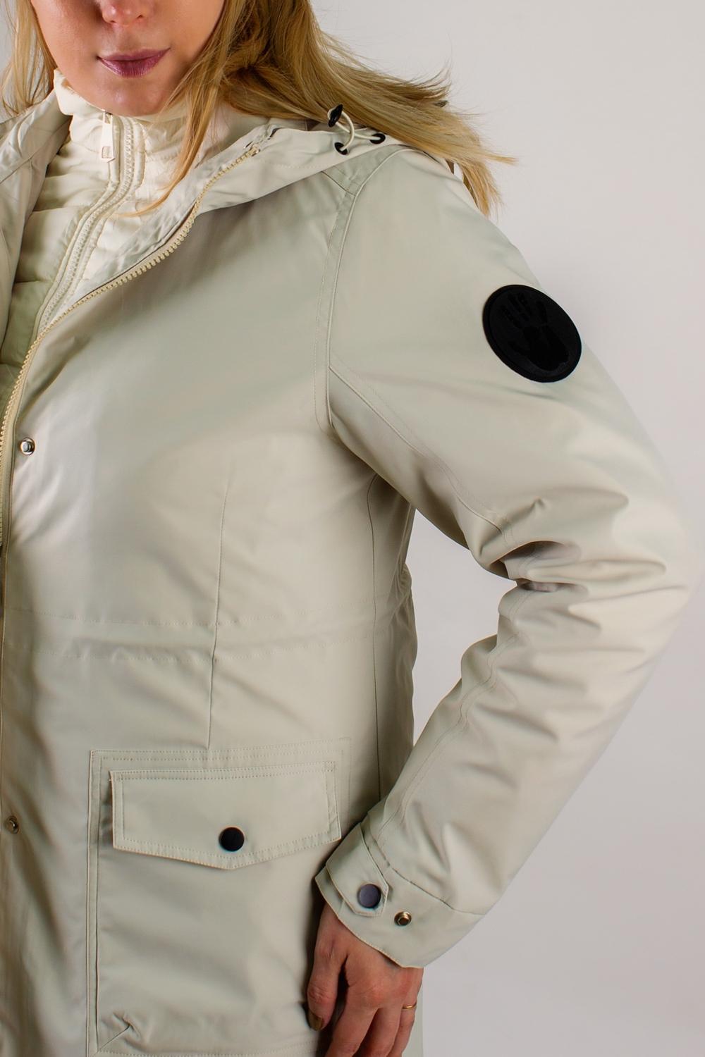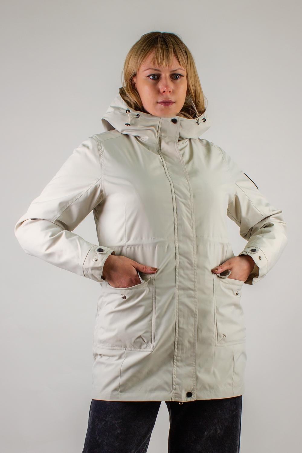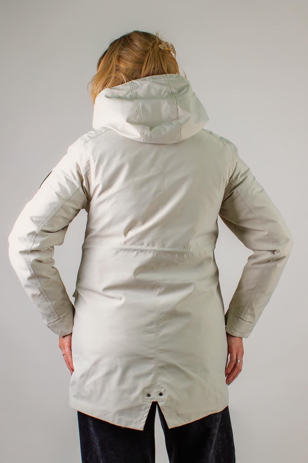 Внешняя парка-плащ выполнена из прочного, ветро- и влагоотталкивающего материала с матовым эффектом. Вместительный капюшон оснащен фиксаторами, позволяющими подогнать его по форме головы и защитить от ветра. Воротник-стойка сохраняет тепло в области шеи и придаёт модели элегантный силуэт. Молния с двухсторонним бегунком закрывается декоративной планкой на клёпках, препятствуя продуванию. На поясе размещена скрытая кулиска со стягивающими завязками — идеальное решение для подчёркивания талии. Регулируемые манжеты на двух кнопках и два вместительных накладных кармана на клапанах обеспечивают практичность в любых условиях.