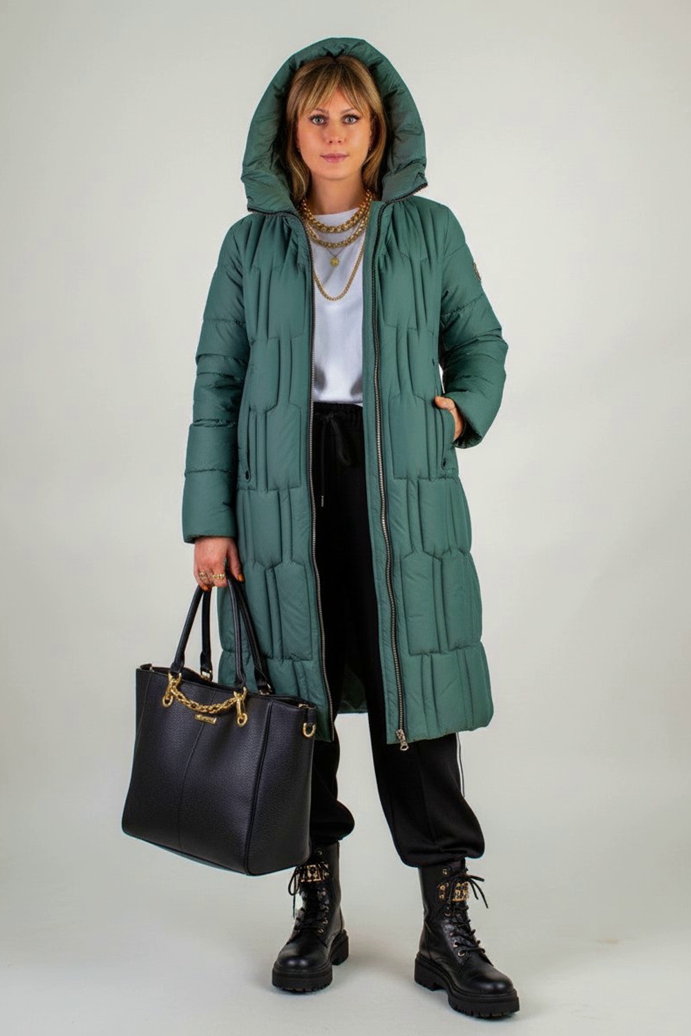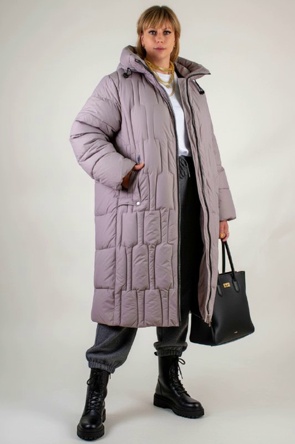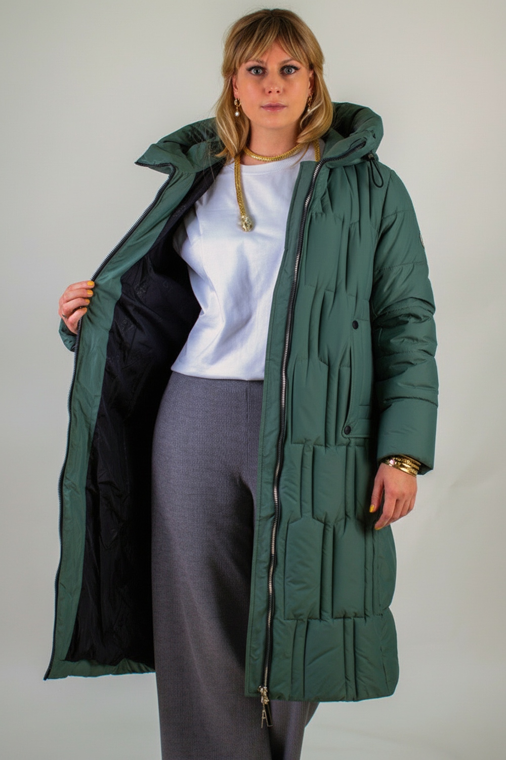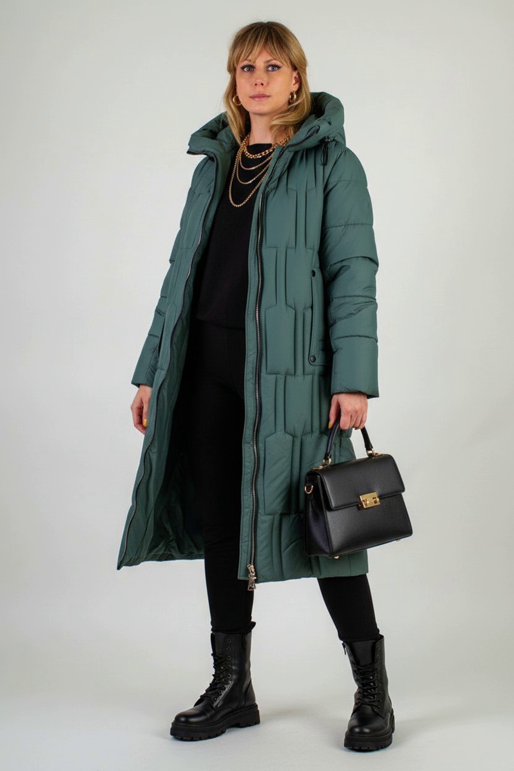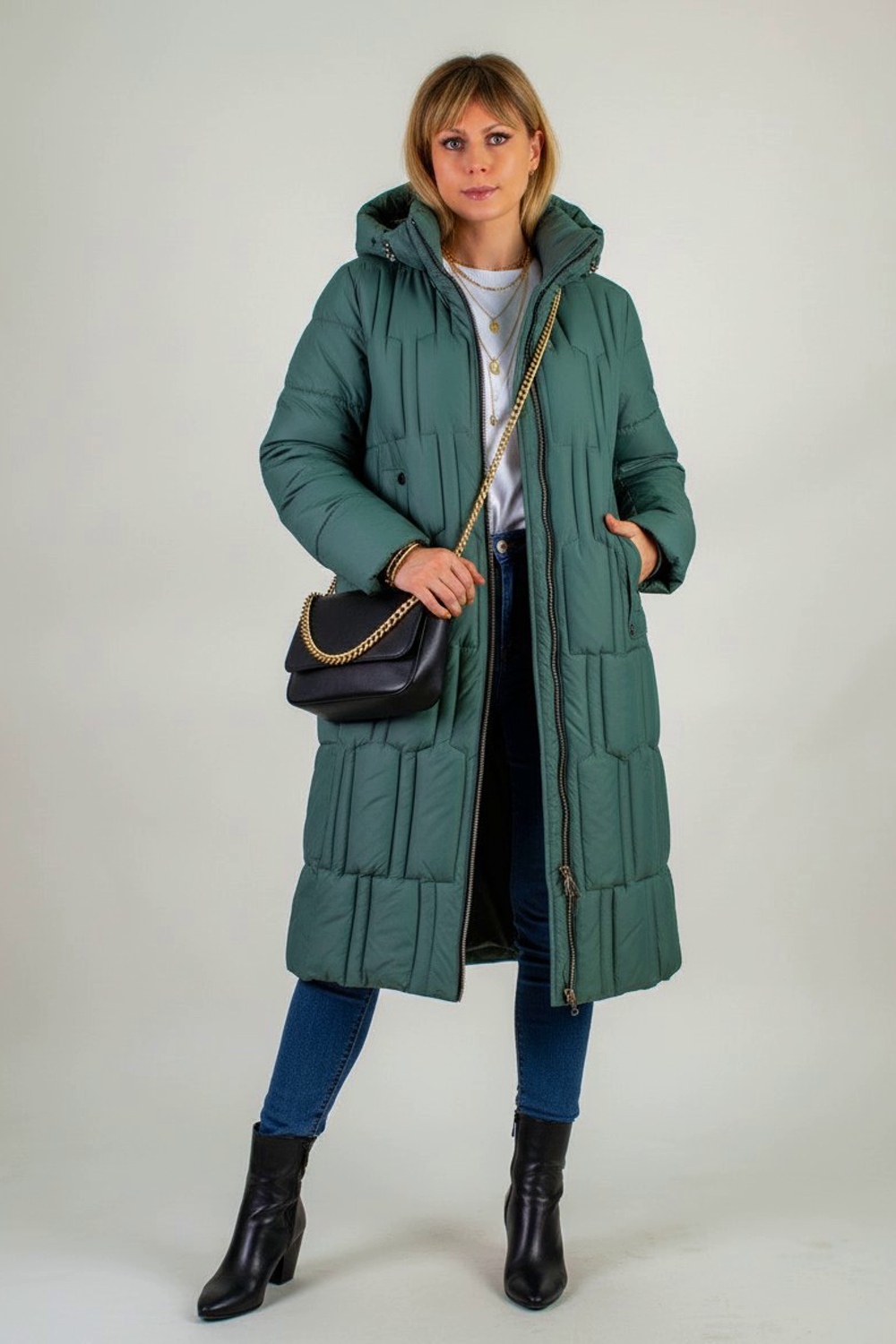 Материал верха – плотная матовая ткань, отталкивающая грязь, шерсть и пыль. Цветовые варианты: трендовый бежевый, классический чёрный и насыщенная бирюза. Куртка доступна в расширенной размерной линейке больших размеров, что делает её универсальным решением для любой фигуры.