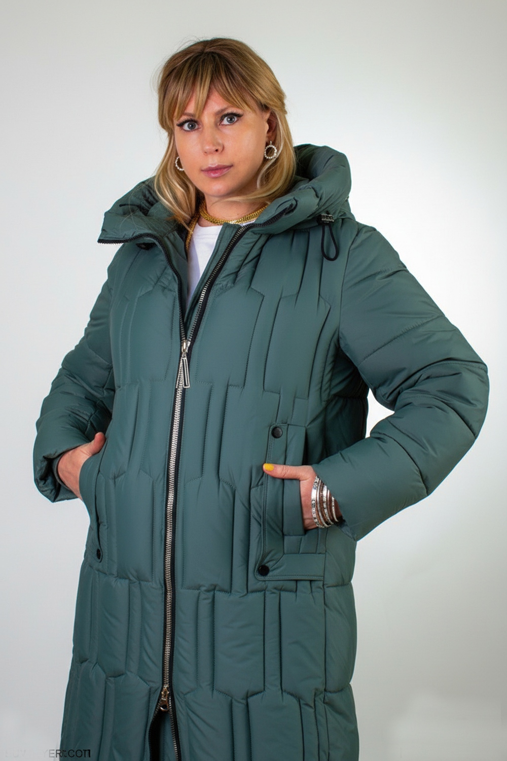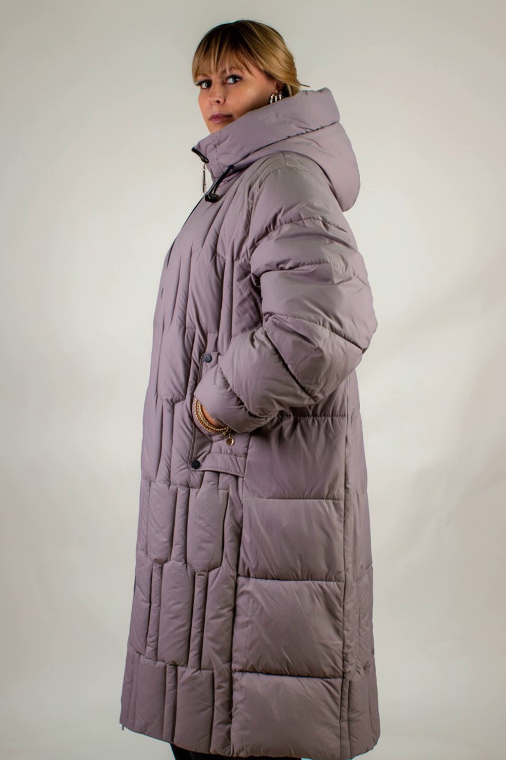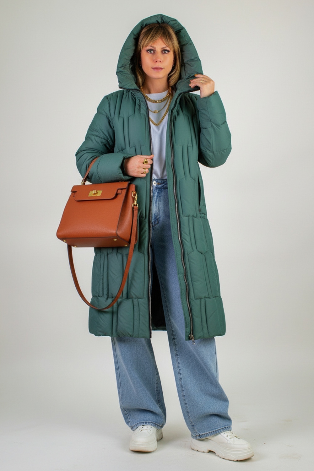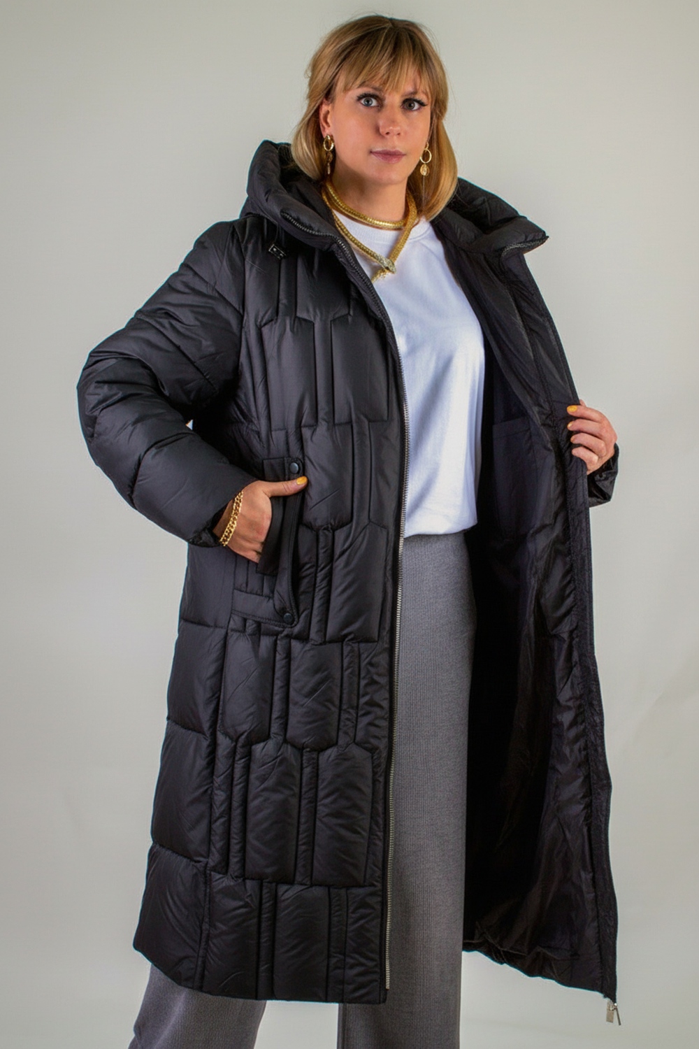 Материал верха – плотная матовая ткань, отталкивающая грязь, шерсть и пыль. Цветовые варианты: трендовый бежевый, классический чёрный и насыщенная бирюза. Куртка доступна в расширенной размерной линейке больших размеров, что делает её универсальным решением для любой фигуры.