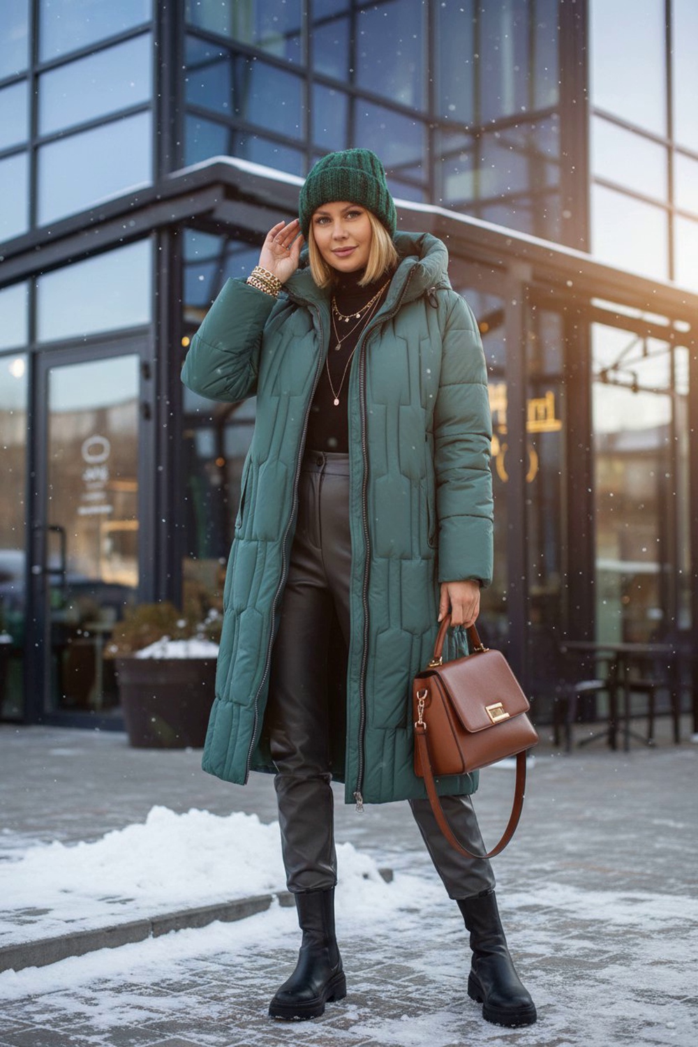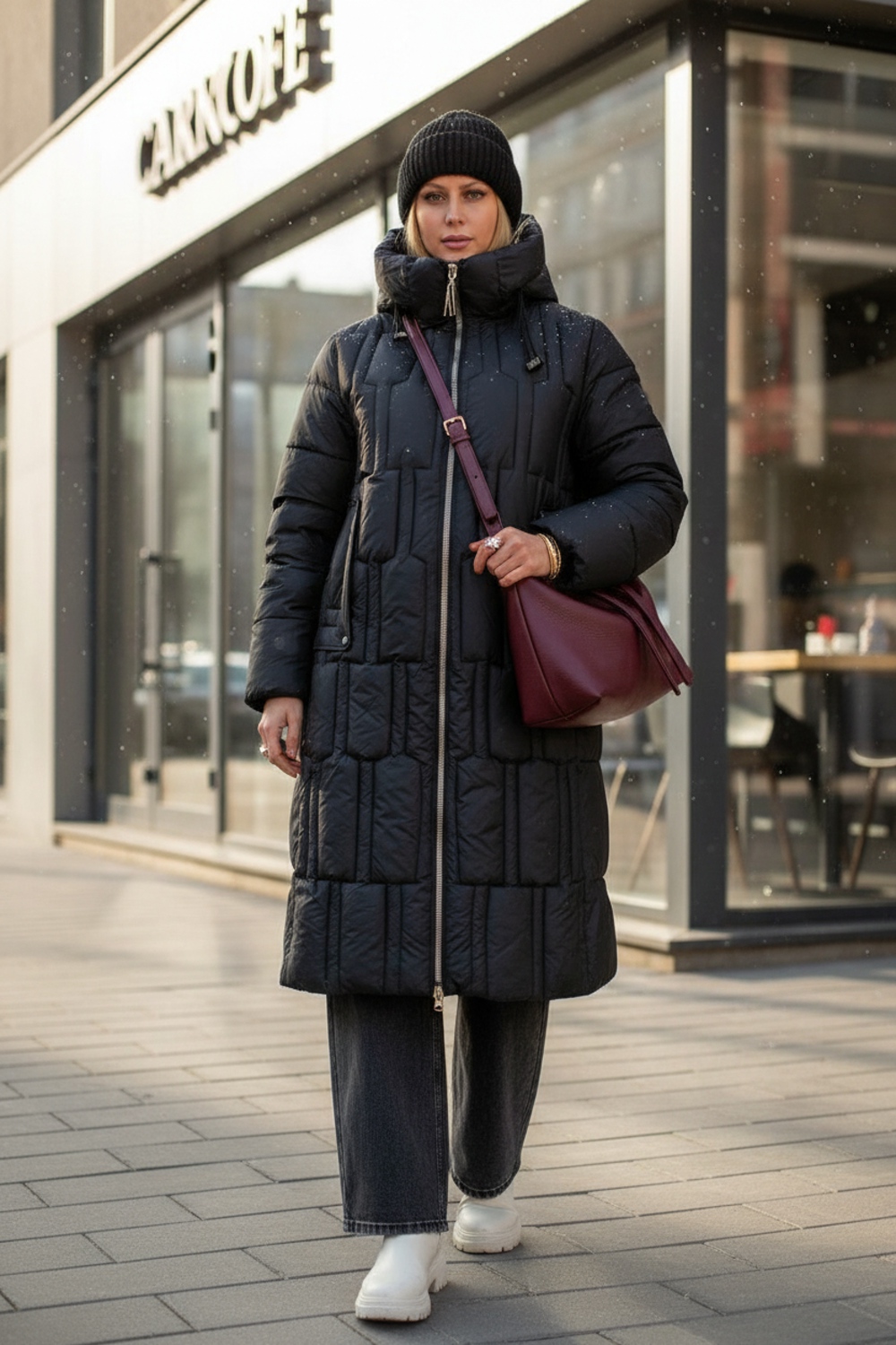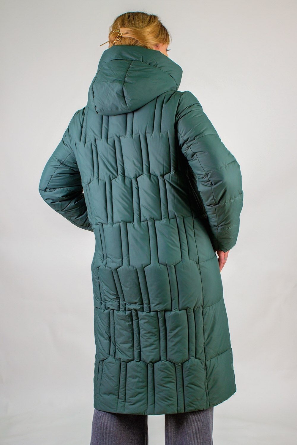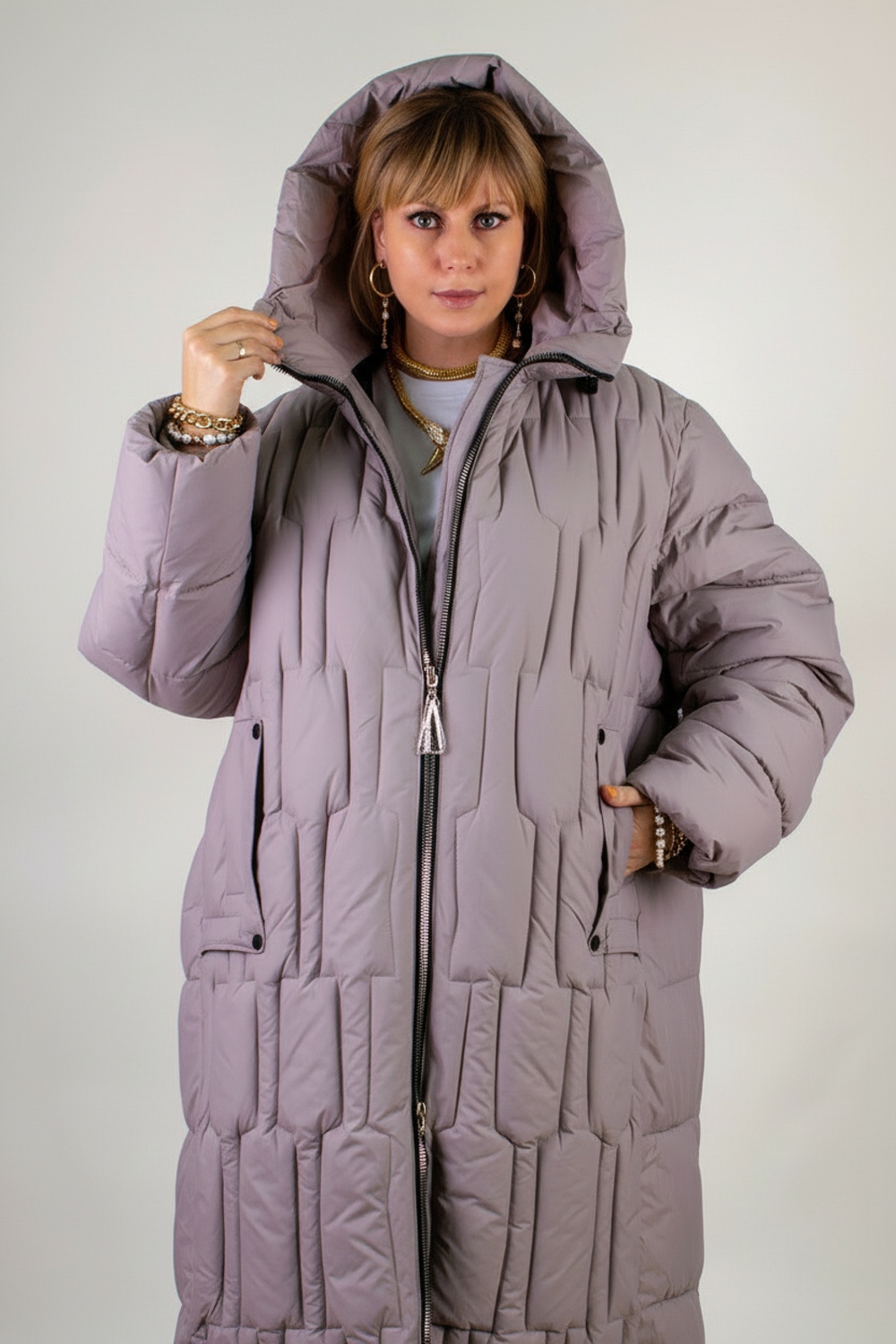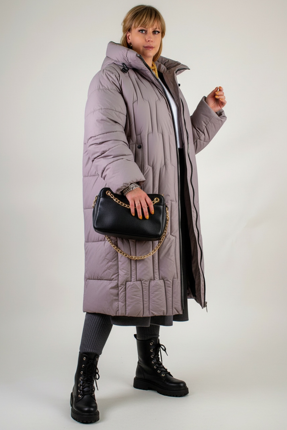 Материал верха – плотная матовая ткань, отталкивающая грязь, шерсть и пыль. Цветовые варианты: трендовый бежевый, классический чёрный и насыщенная бирюза. Куртка доступна в расширенной размерной линейке больших размеров, что делает её универсальным решением для любой фигуры.