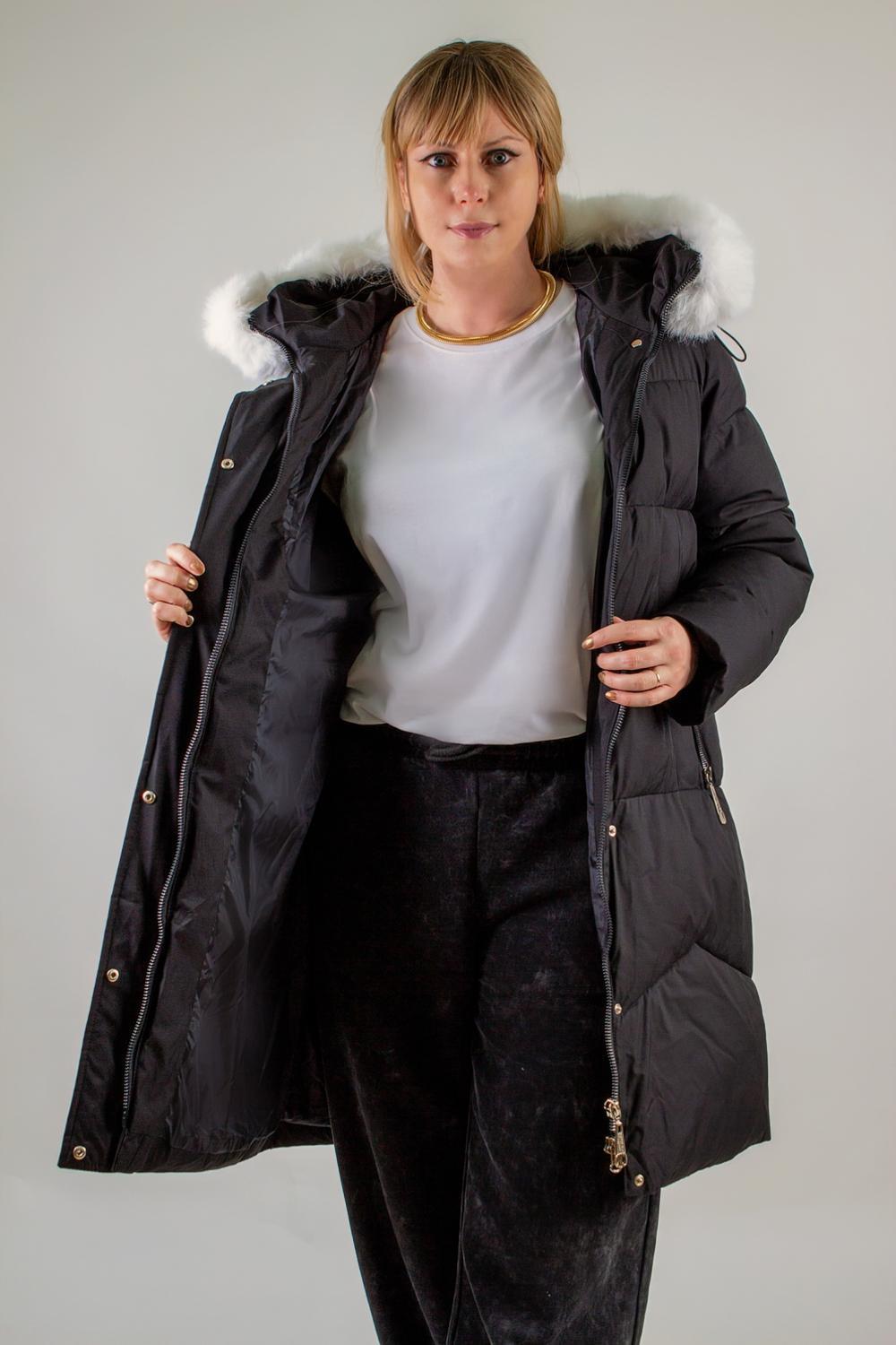 Капюшон с высоким воротником-стойкой на фиксаторах надежно удерживает тепло и защищает от непогоды. По контуру капюшона отстегивающаяся аккуратная опушка из качественного искусственного меха белого цвета – стильный и практичный элемент, который можно при желании отстегнуть. Куртка застегивается на двухзамковую молнию, дополненную планкой с кнопками, что гарантирует защиту от продувания и сохраняет тепло внутри.