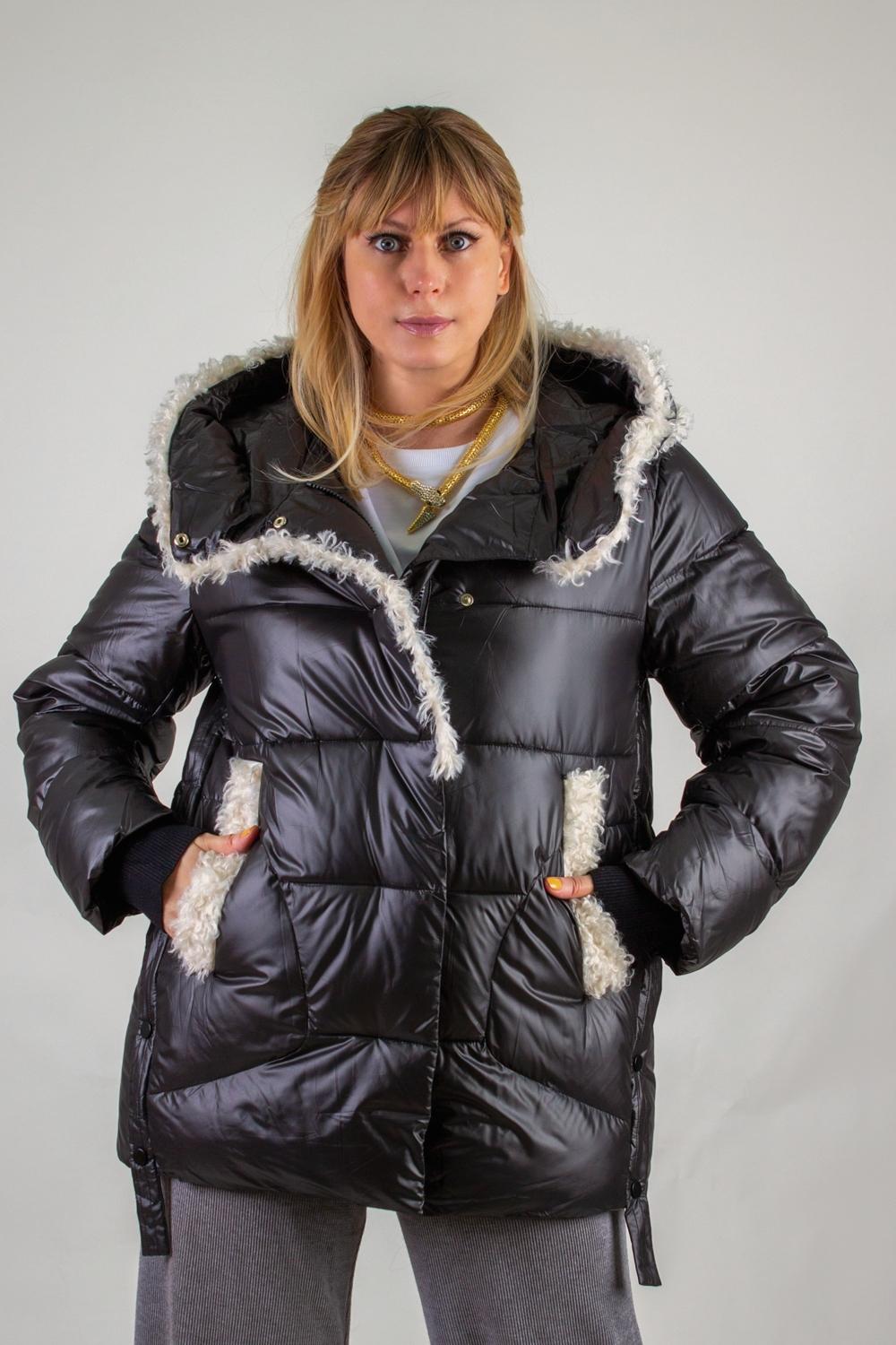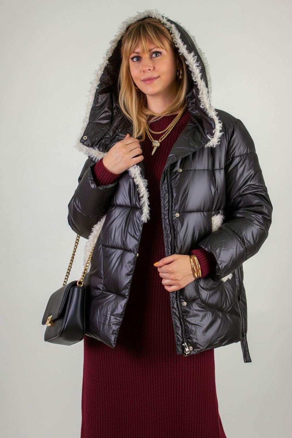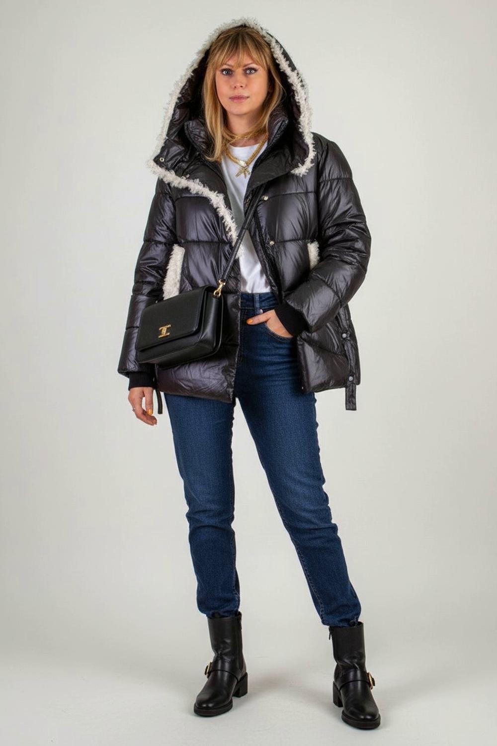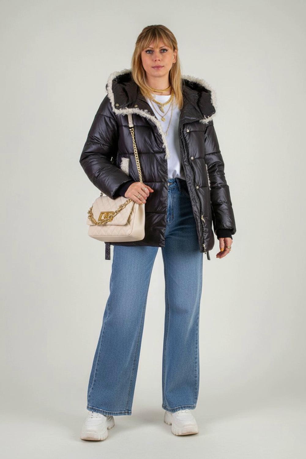 Особое украшение куртки – два боковых кармана на кнопке, обрамлённые искусственным мехом «барашек» нежно-белого оттенка. Тот же ворс используется на капюшоне и верхней части воротника до линии талии, придавая образу утончённость и лёгкую роскошь. Декоративная планка с кнопками по бокам визуально стройнит силуэт, при этом куртка остаётся свободной и не сковывает движений.