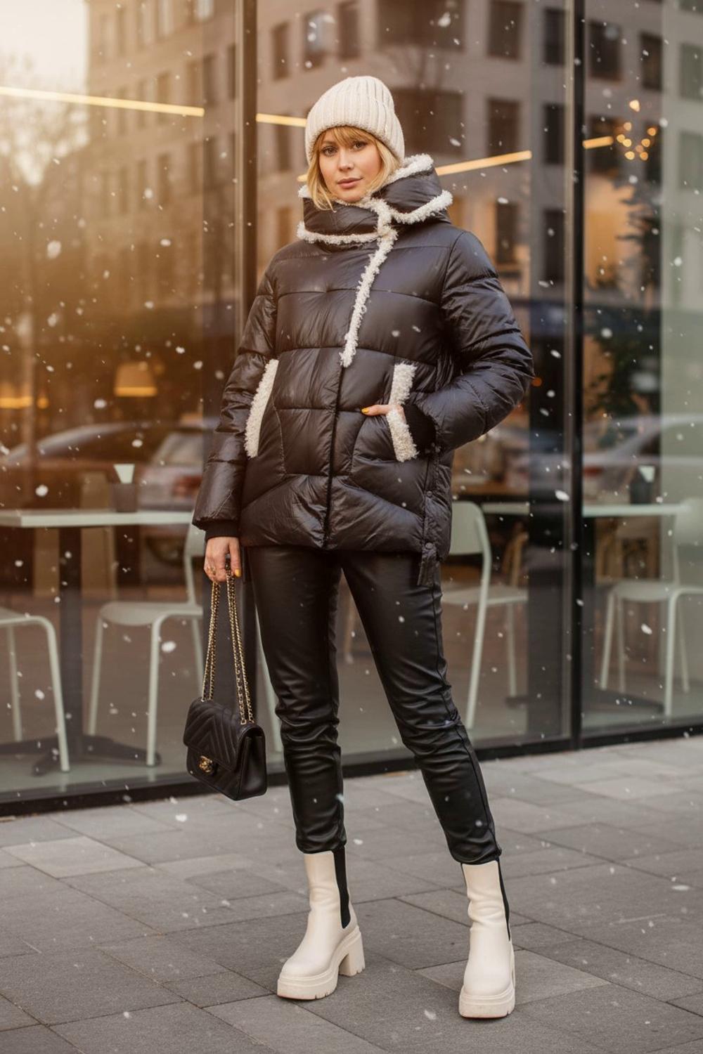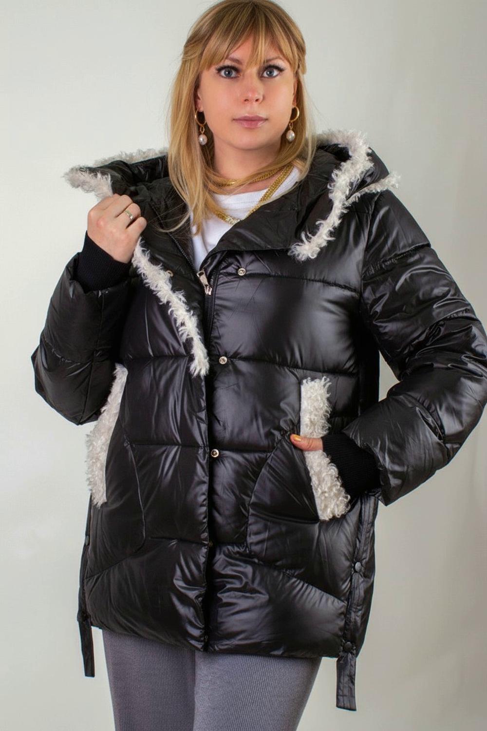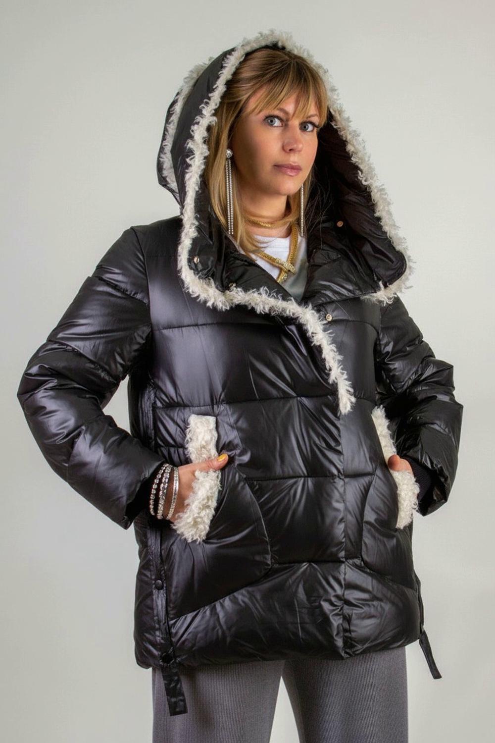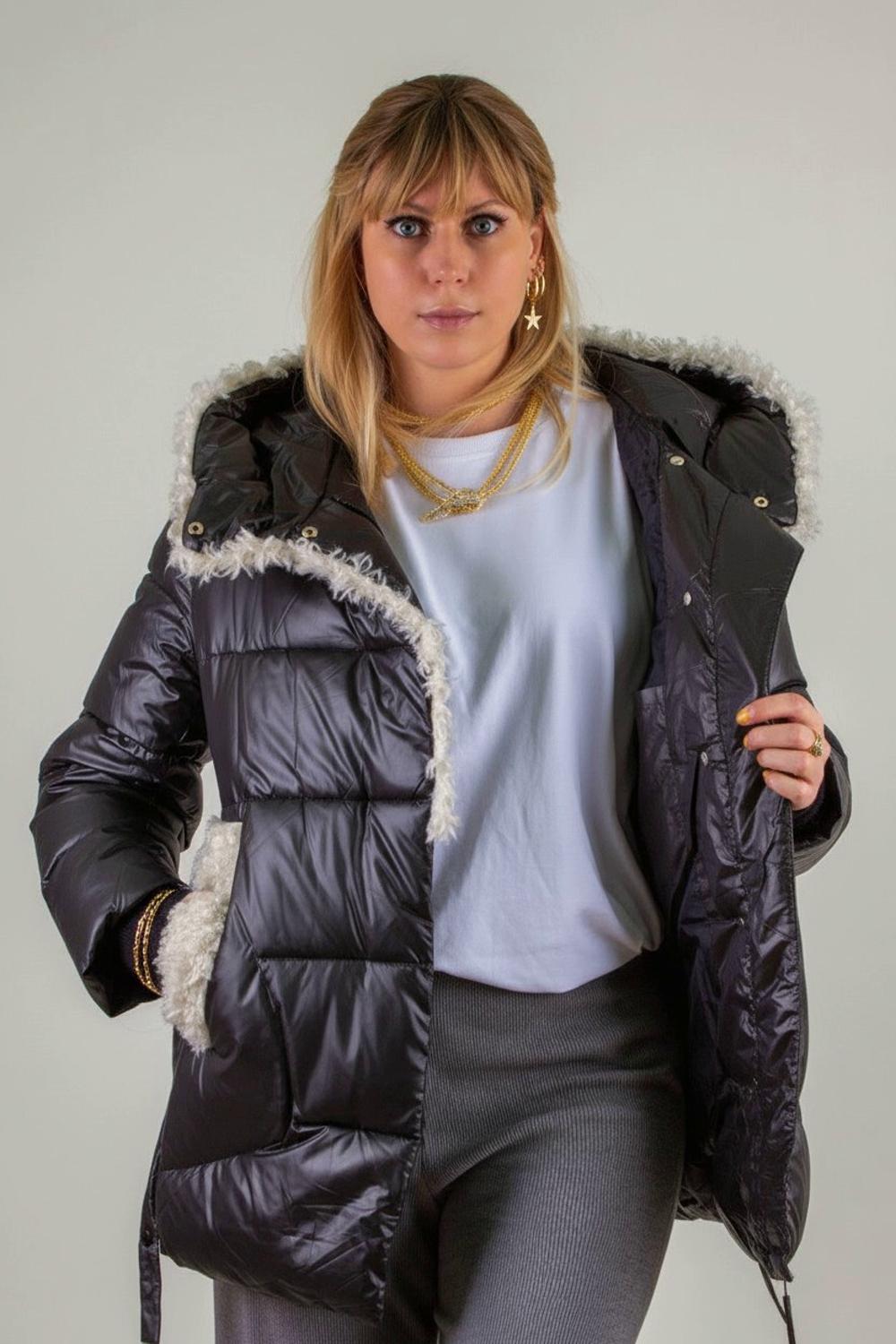 Особое украшение куртки – два боковых кармана на кнопке, обрамлённые искусственным мехом «барашек» нежно-белого оттенка. Тот же ворс используется на капюшоне и верхней части воротника до линии талии, придавая образу утончённость и лёгкую роскошь. Декоративная планка с кнопками по бокам визуально стройнит силуэт, при этом куртка остаётся свободной и не сковывает движений.