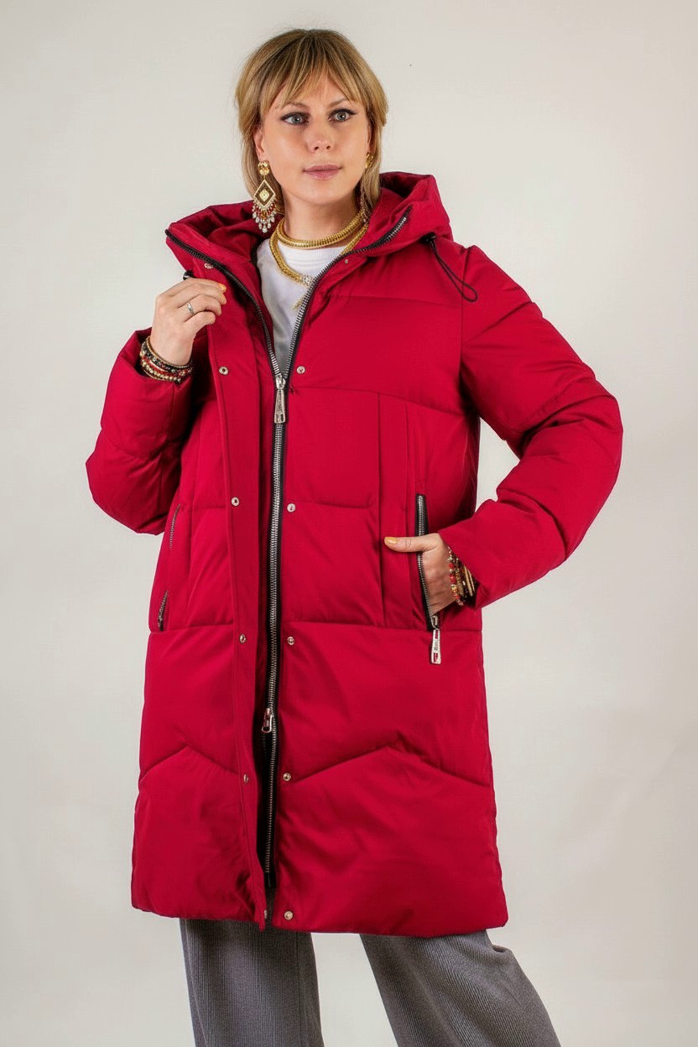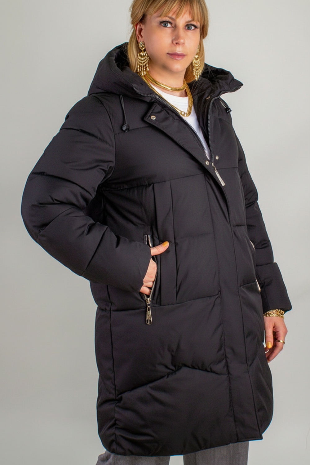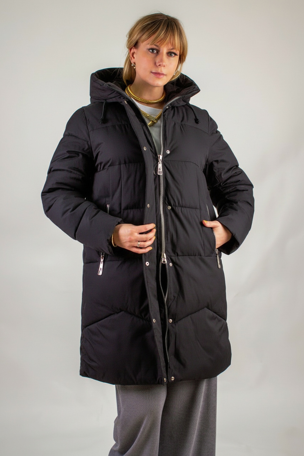 Продуманная функциональность: два боковых кармана на молниях аккуратно вписаны и дополнены минималистичными декоративными вставками под лёгким углом, что визуально удлиняет фигуру. Эластичные трикотажные манжеты на рукавах плотно облегают запястья и не пропускают холод, а внутренний карман — надёжное место для хранения смартфона, ключей или проездного.