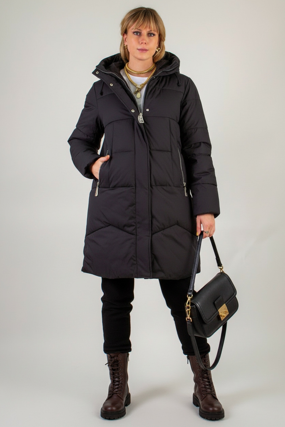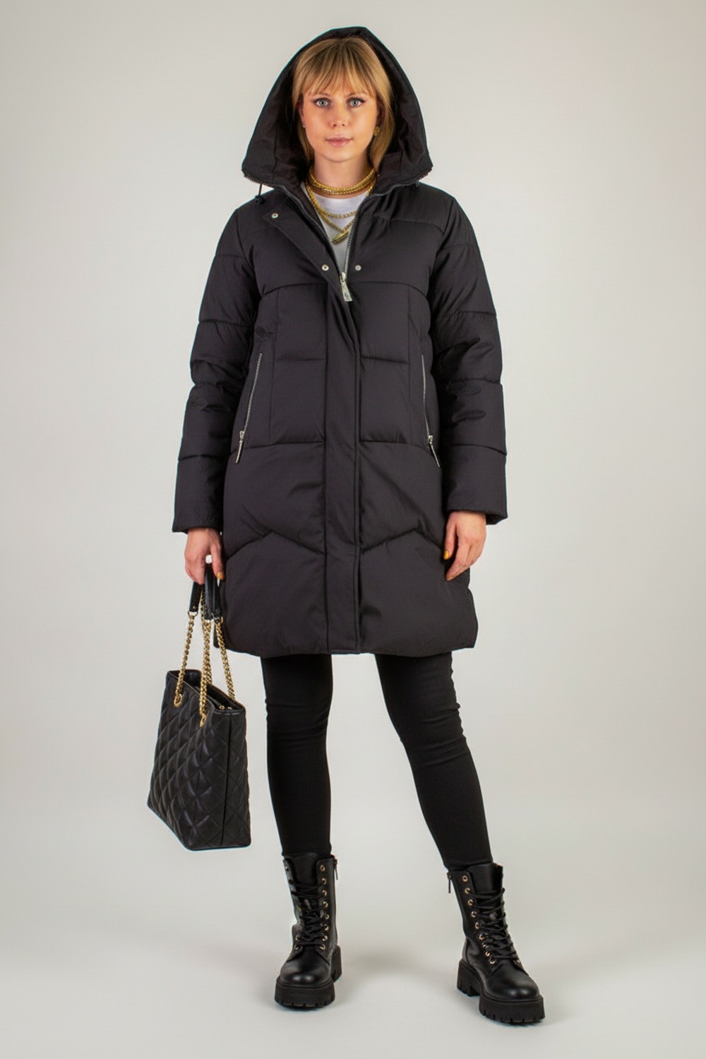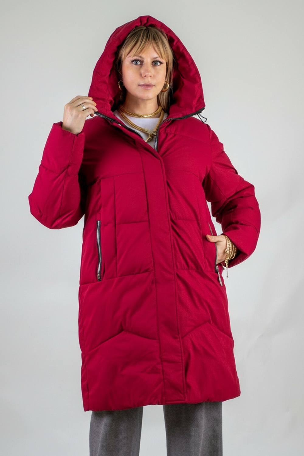 Продуманная функциональность: два боковых кармана на молниях аккуратно вписаны и дополнены минималистичными декоративными вставками под лёгким углом, что визуально удлиняет фигуру. Эластичные трикотажные манжеты на рукавах плотно облегают запястья и не пропускают холод, а внутренний карман — надёжное место для хранения смартфона, ключей или проездного.