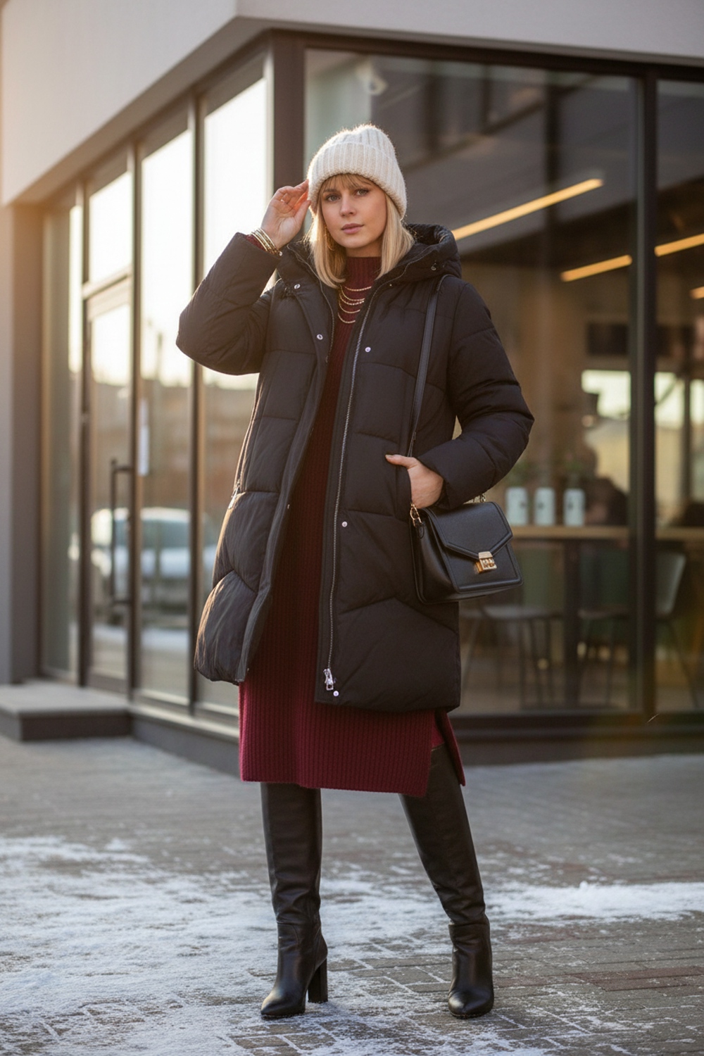 • Тёплый поясной ремень поверх куртки для подчёркивания талии.