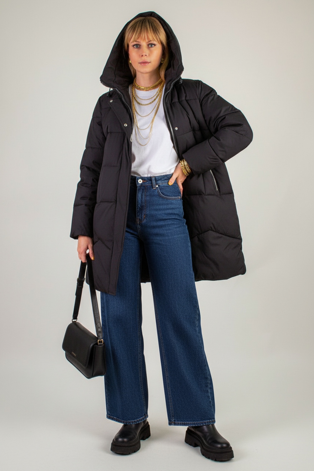 • Свитер крупной вязки или худи нейтрального оттенка под высоким воротником-стойкой.