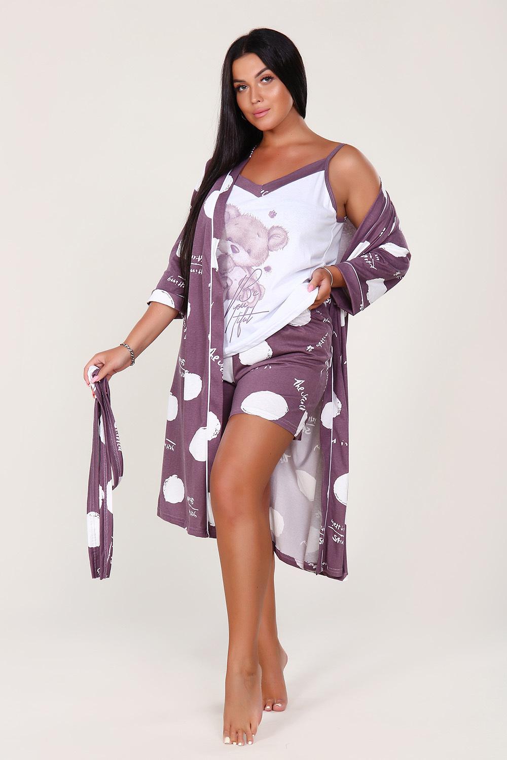 Комплект домашней одежды, состоящий из халата, топа и шорт, выполнен из 100% хлопка с принтом "Миша" и отличается комфортом, натуральным составом и милым дизайном