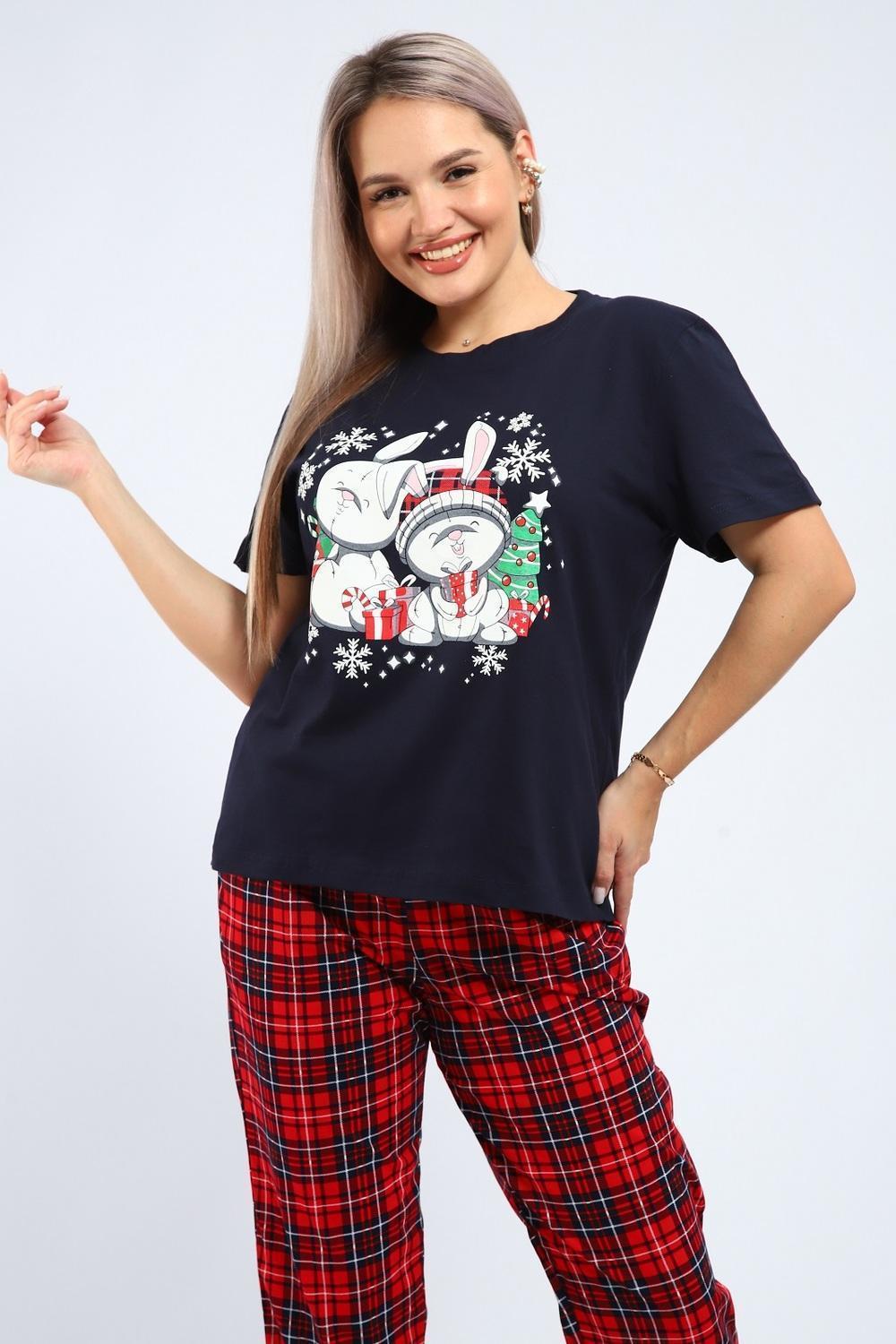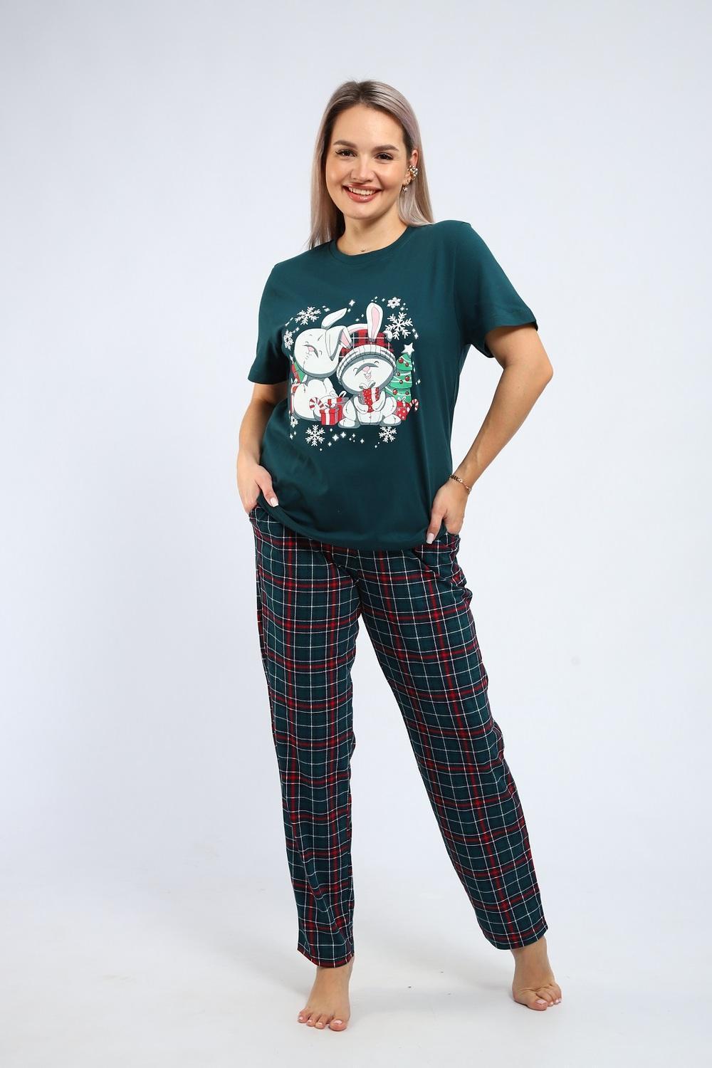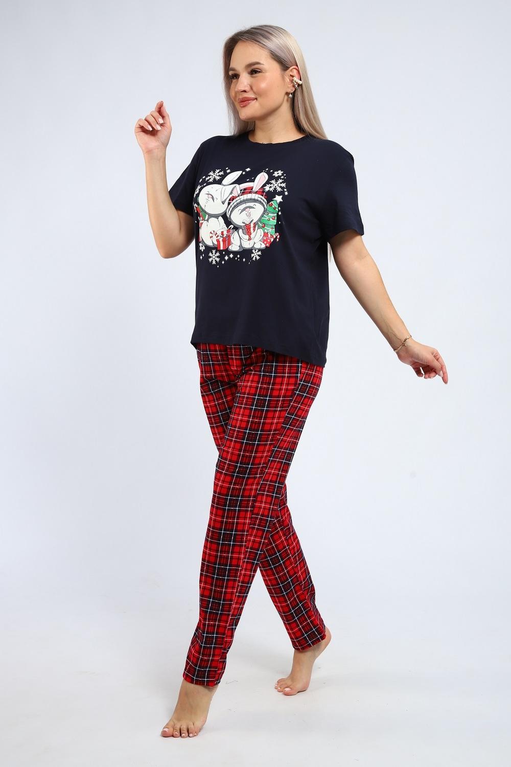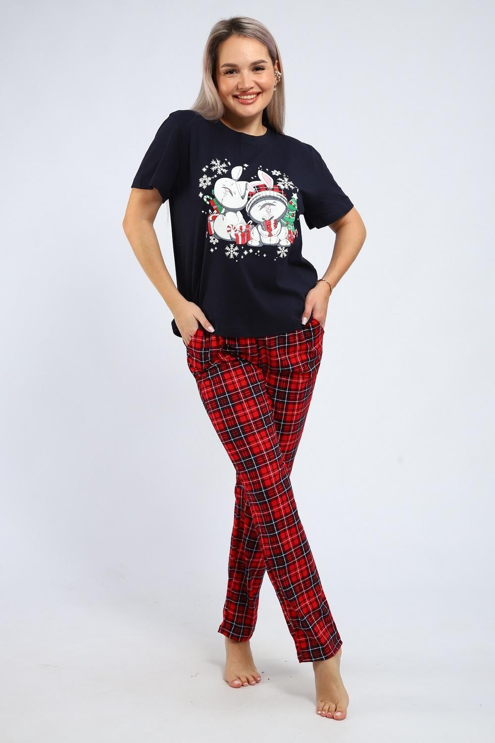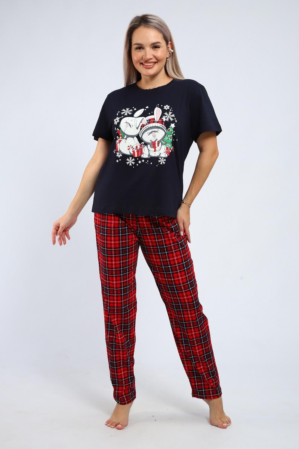 Уютная комфортная пижама из футболки с милым принтом "Зайки" и брюками в клетку с двумя карманами.