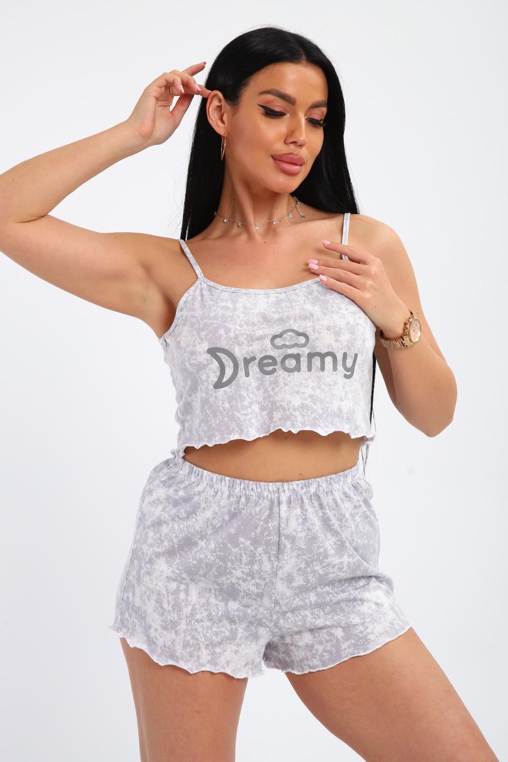 Пижама молодежная, из натурального, набивного трикотажного полотна, хлопок 100%. Верх - топ на бретелях. Длинна выше линии талии. Шорты прямые, без карман, с цельнокроеным поясом, на мягкой резинки. Низ топа и шорт обработан краёвкой. По центру топа нанесен принт (шелкография).