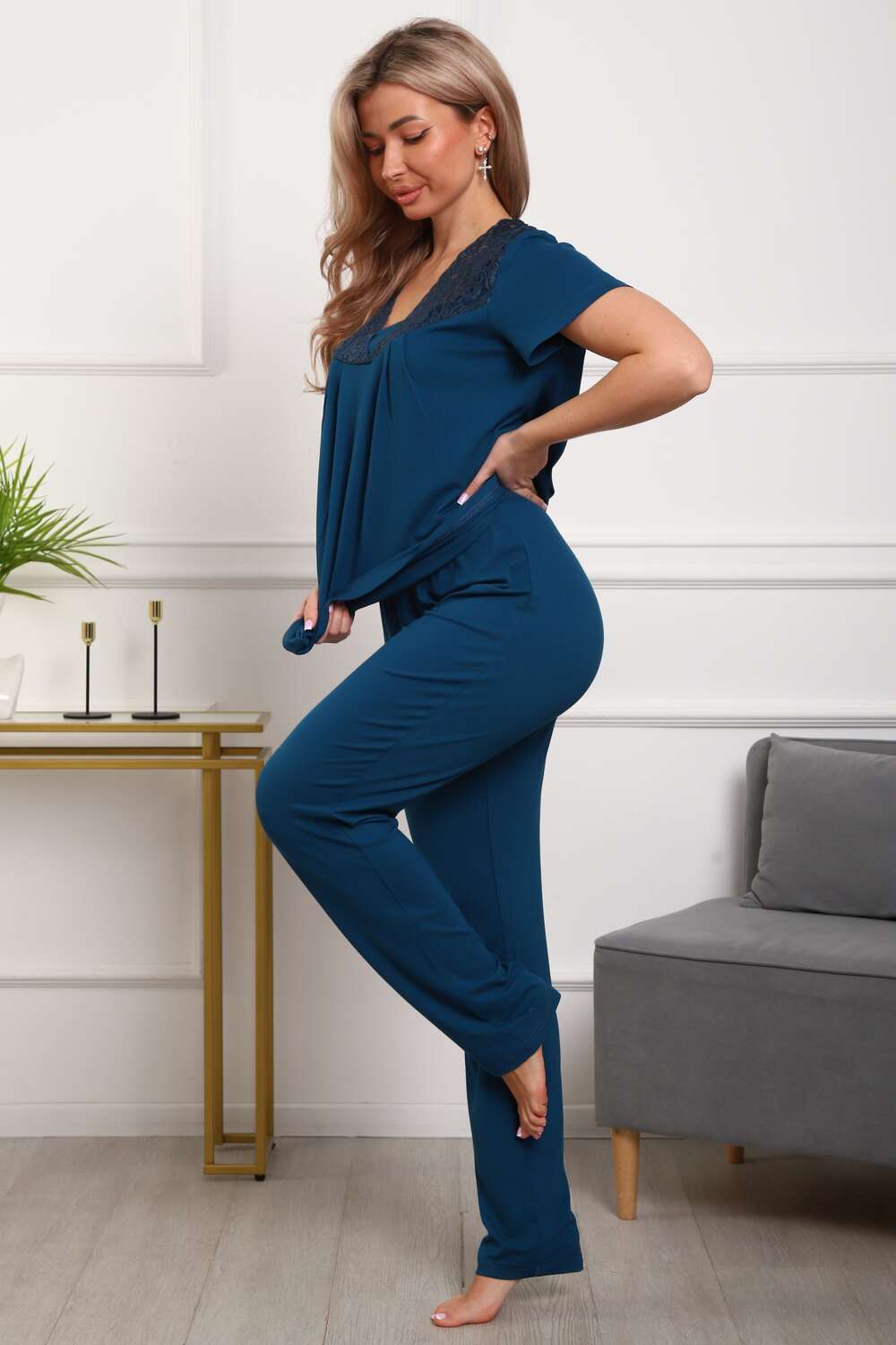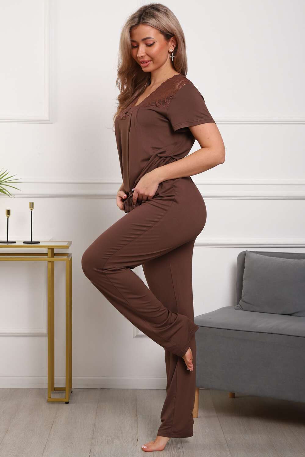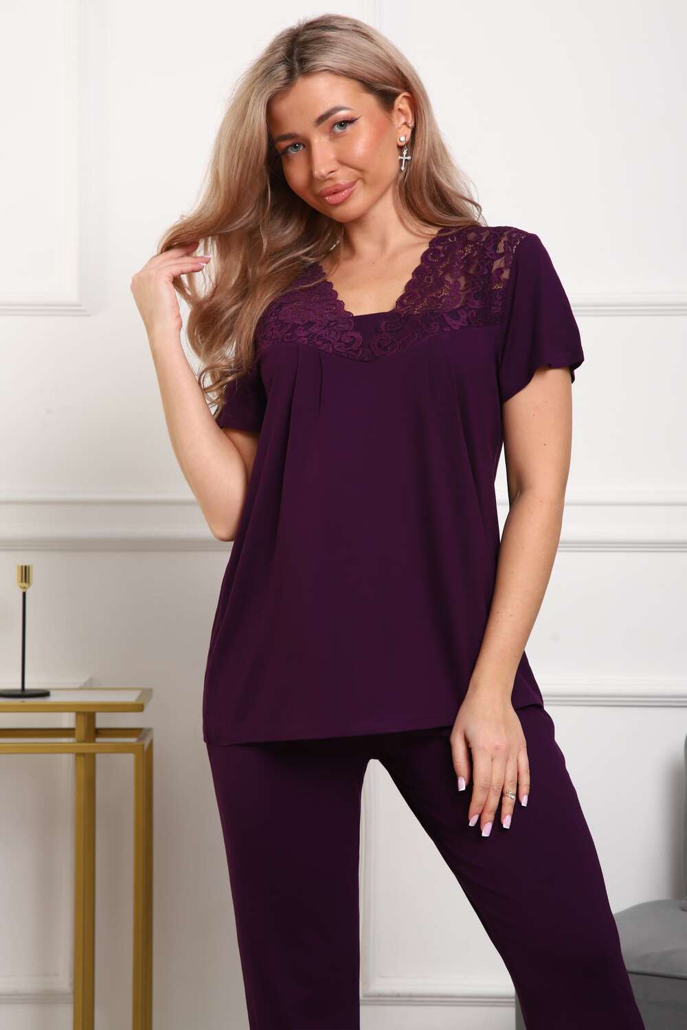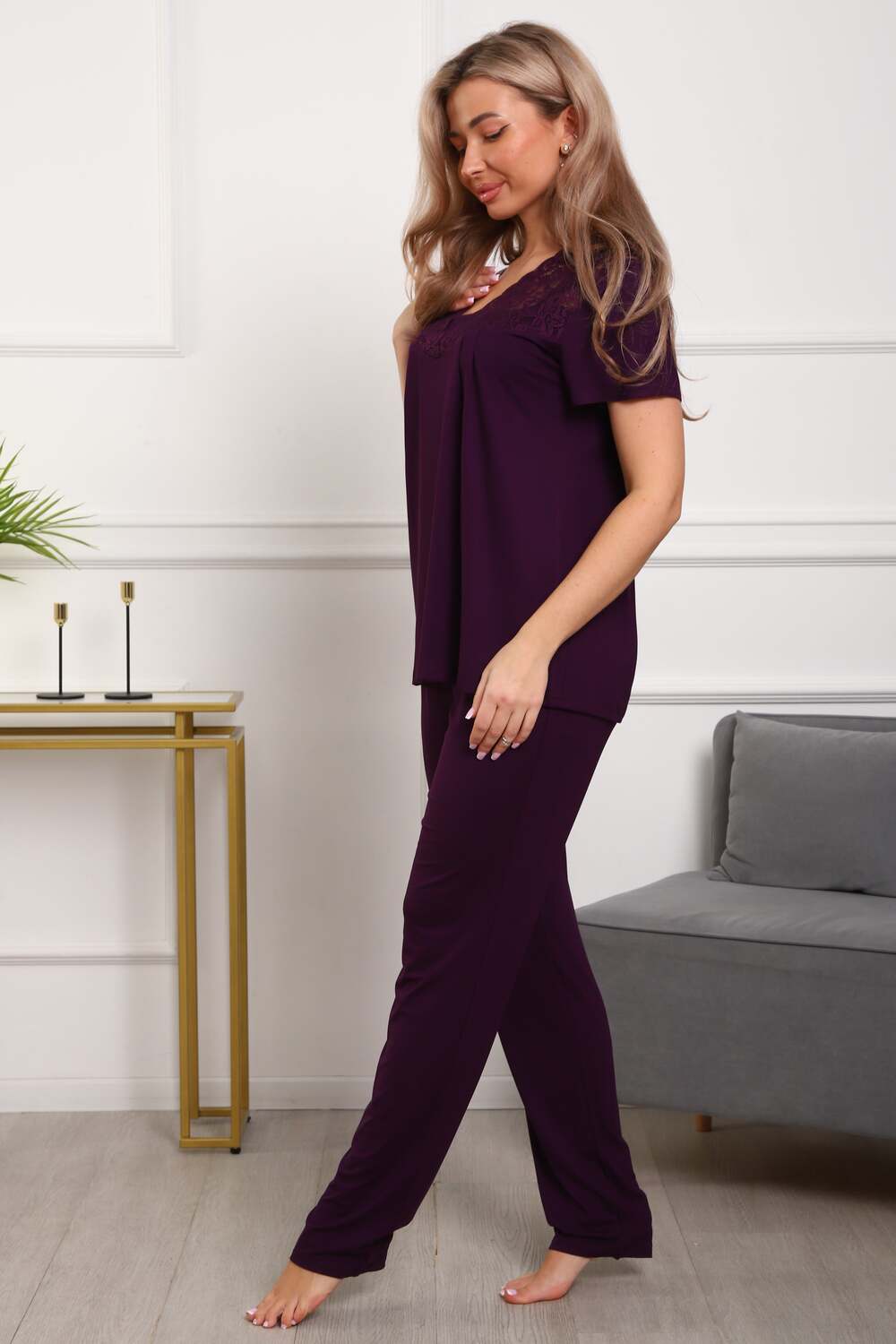 Пижама женская из вискозы. Состоит из туники и брюк. Верх прямого силуэта, чуть расклешённый к низу, ниже середины бедра. Рукав короткий. Горловина V-образной формы, отделана кружевом. Низ прямой.