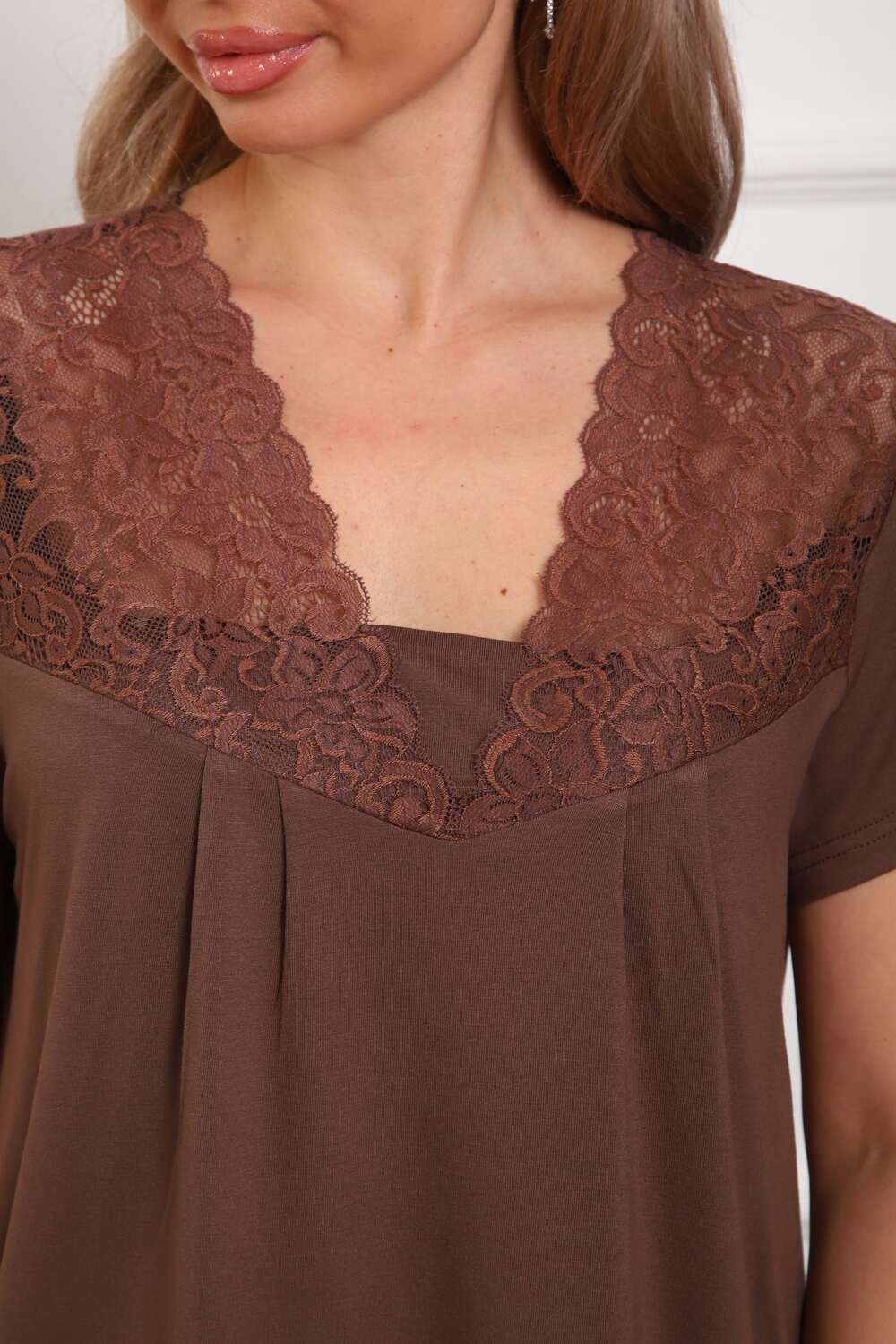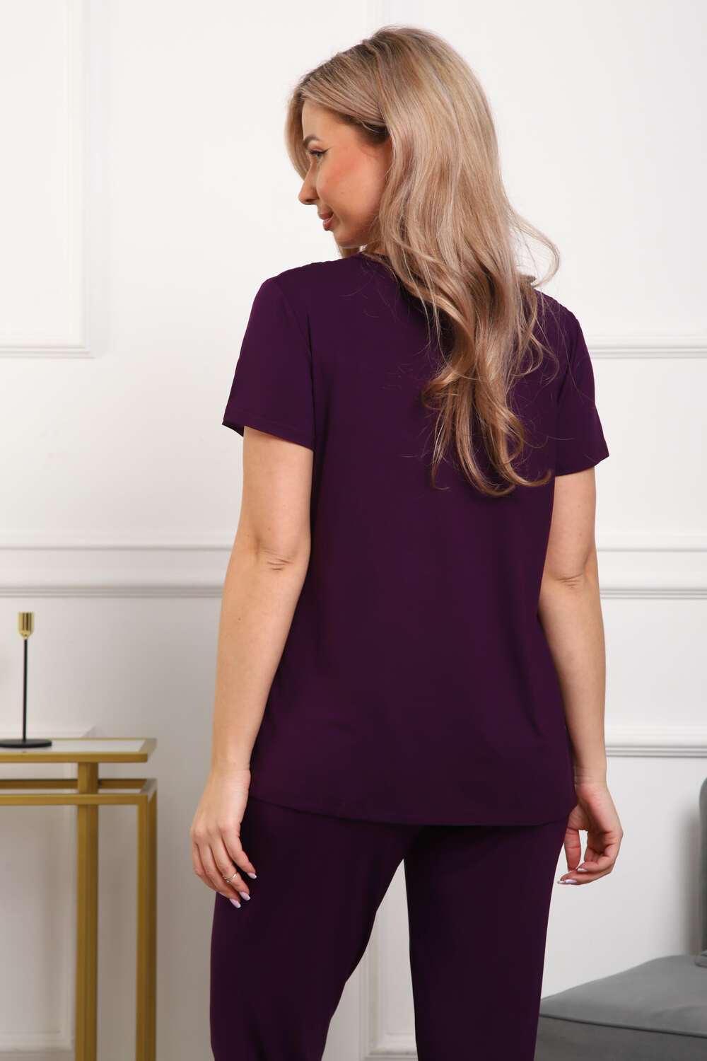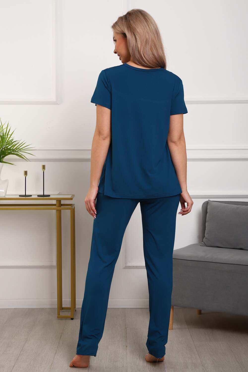 Пижама женская из вискозы. Состоит из туники и брюк. Верх прямого силуэта, чуть расклешённый к низу, ниже середины бедра. Рукав короткий. Горловина V-образной формы, отделана кружевом. Низ прямой.