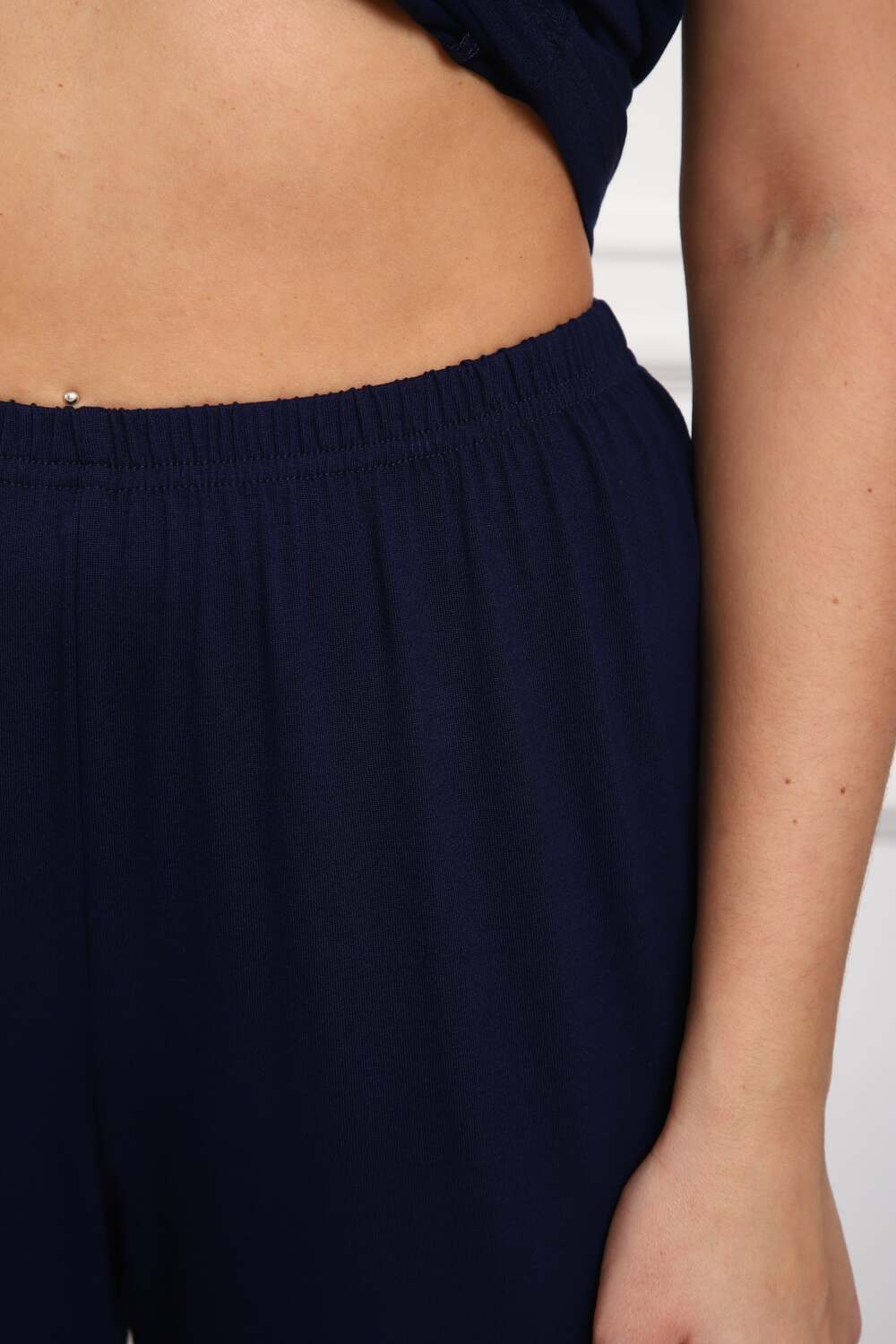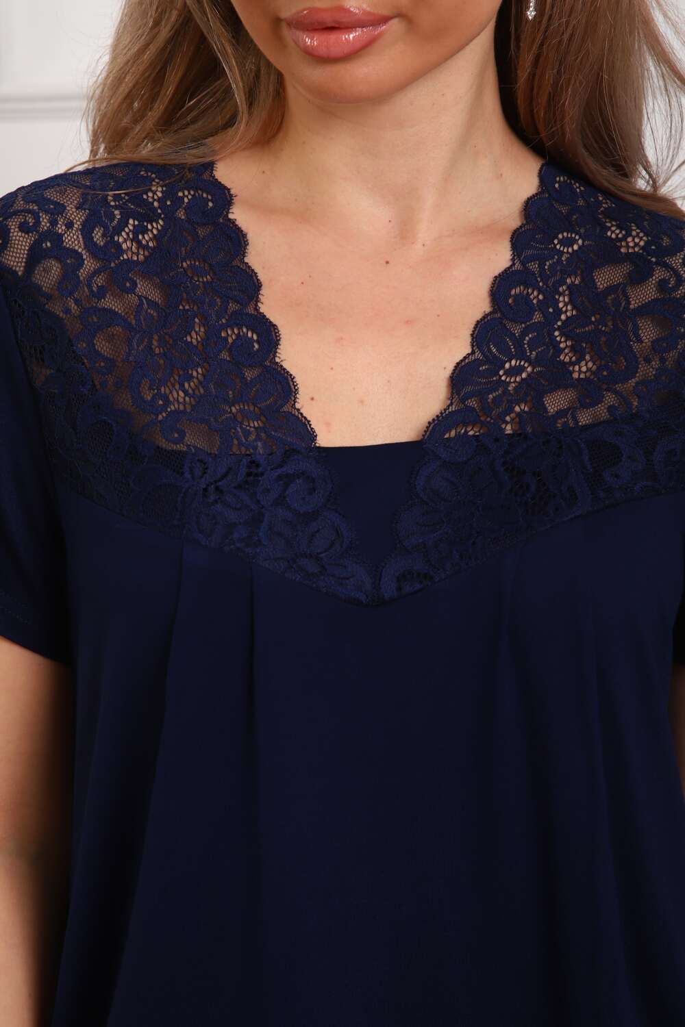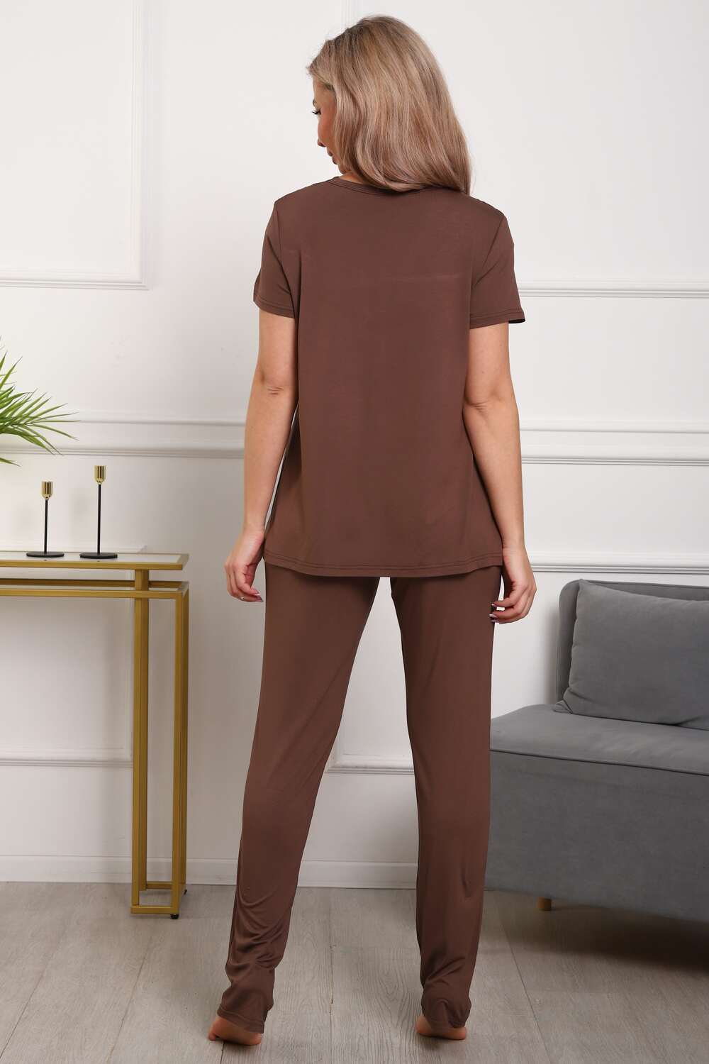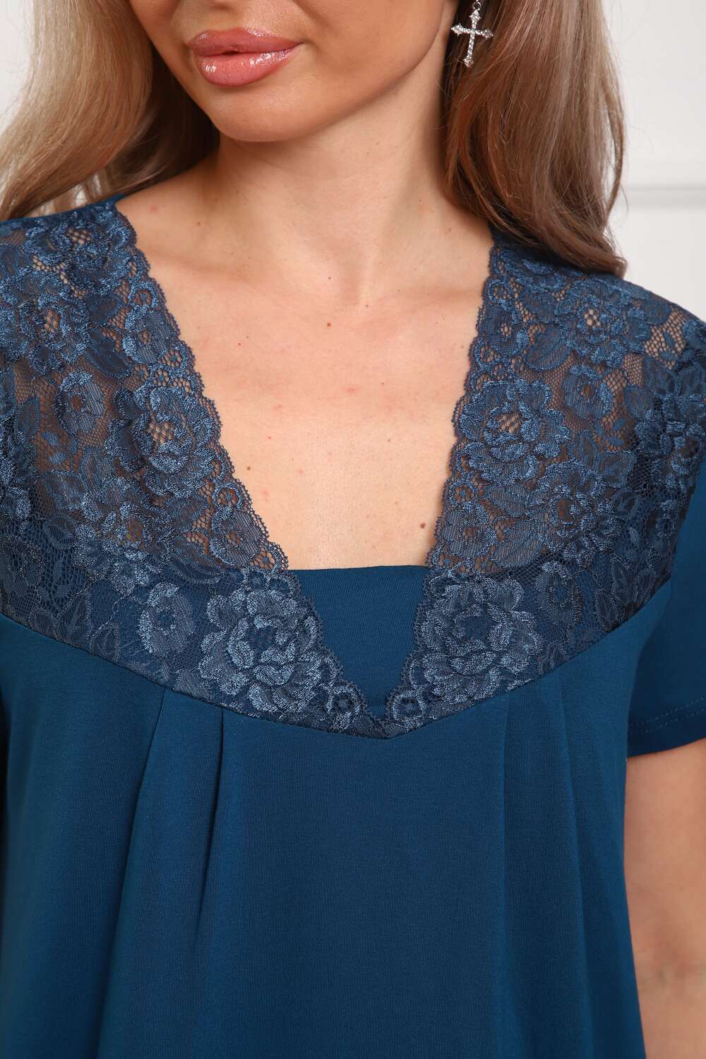 Пижама женская из вискозы. Состоит из туники и брюк. Верх прямого силуэта, чуть расклешённый к низу, ниже середины бедра. Рукав короткий. Горловина V-образной формы, отделана кружевом. Низ прямой.