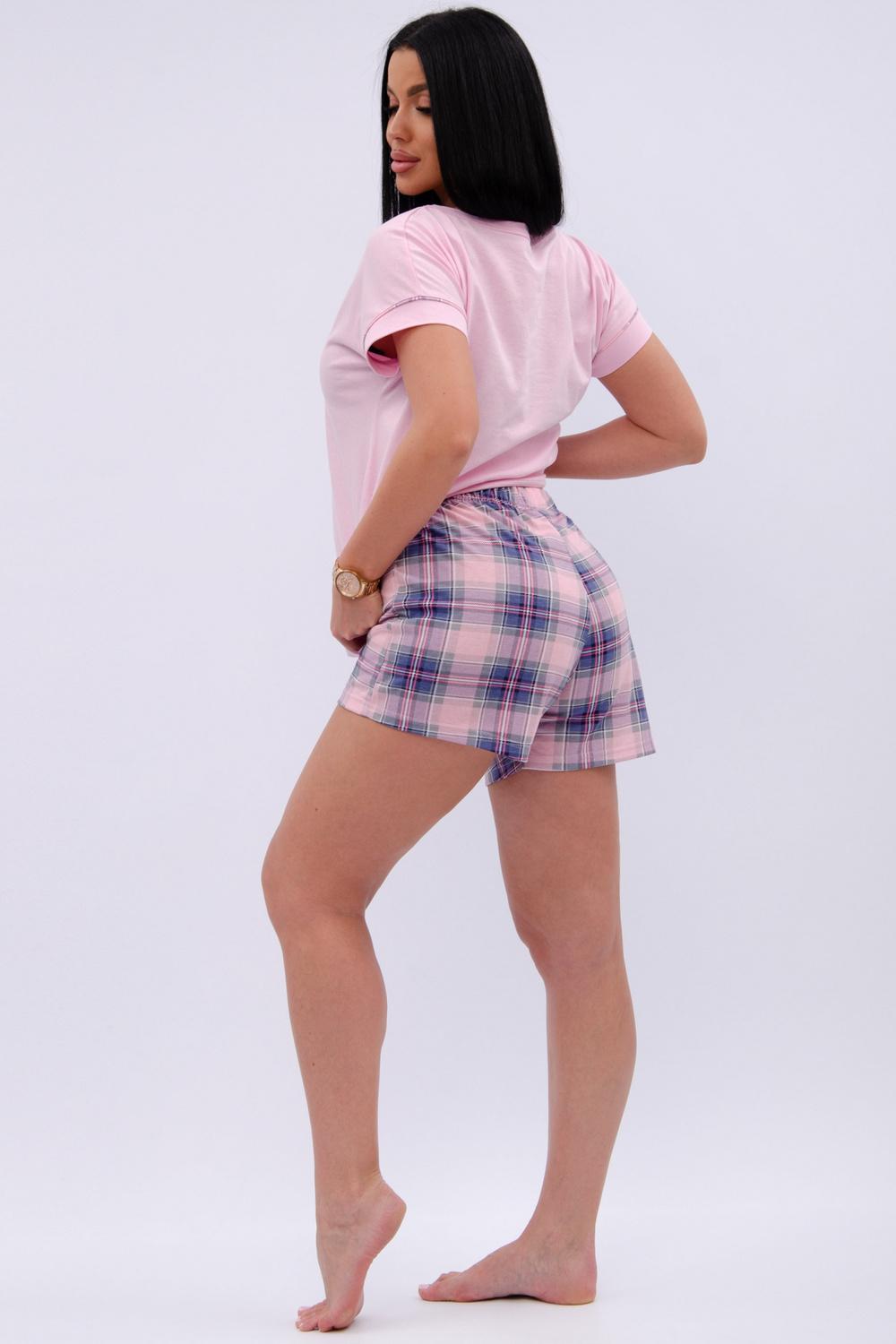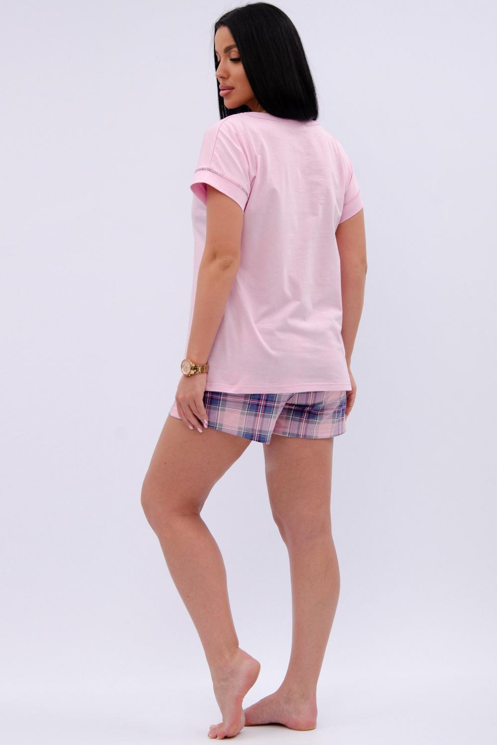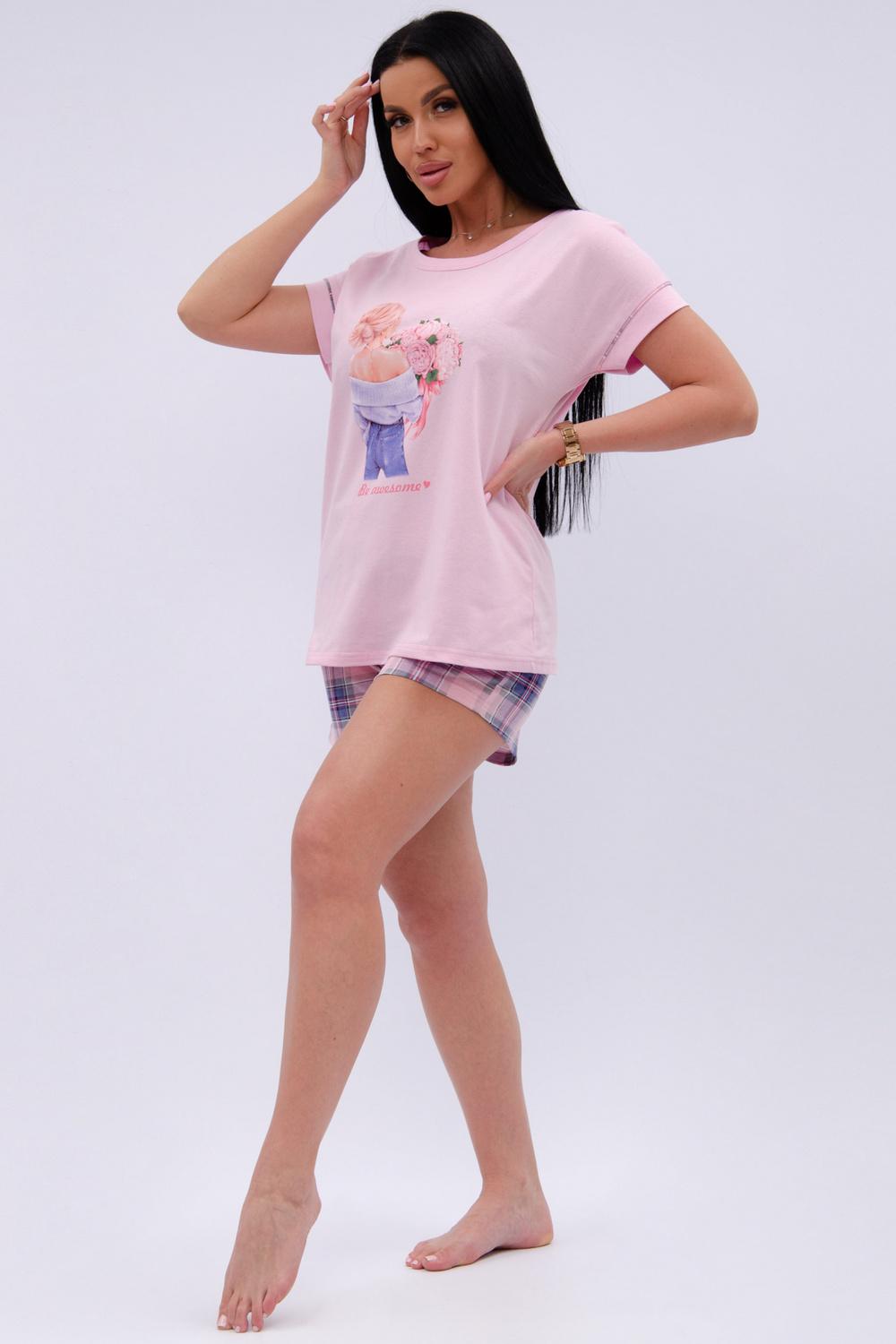 Пижама женская состоит из футболки с коротким рукавом и шортов. Футболка из однотонной кулирки с красивым принтом, шорты свободного покроя из ткани кулирка.