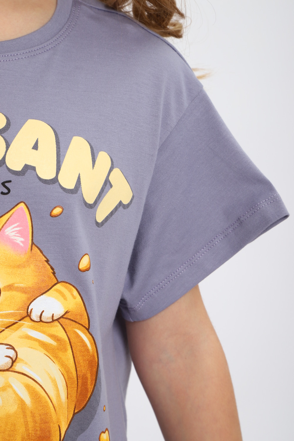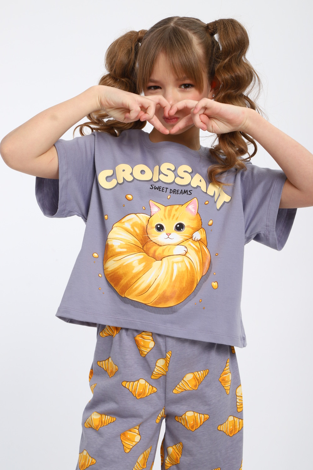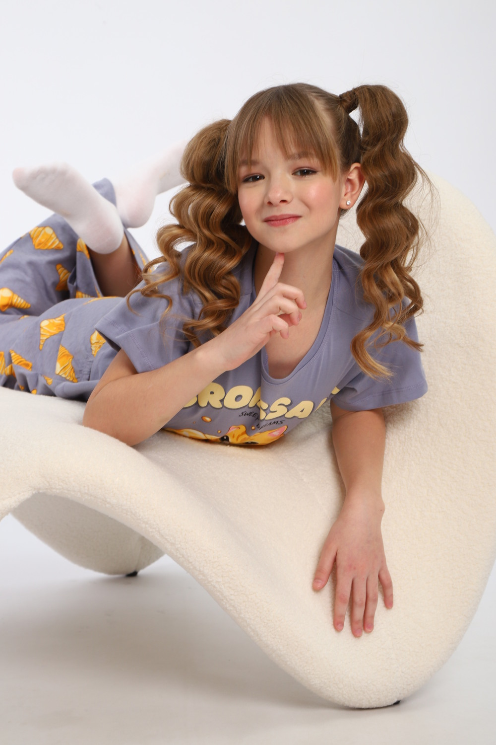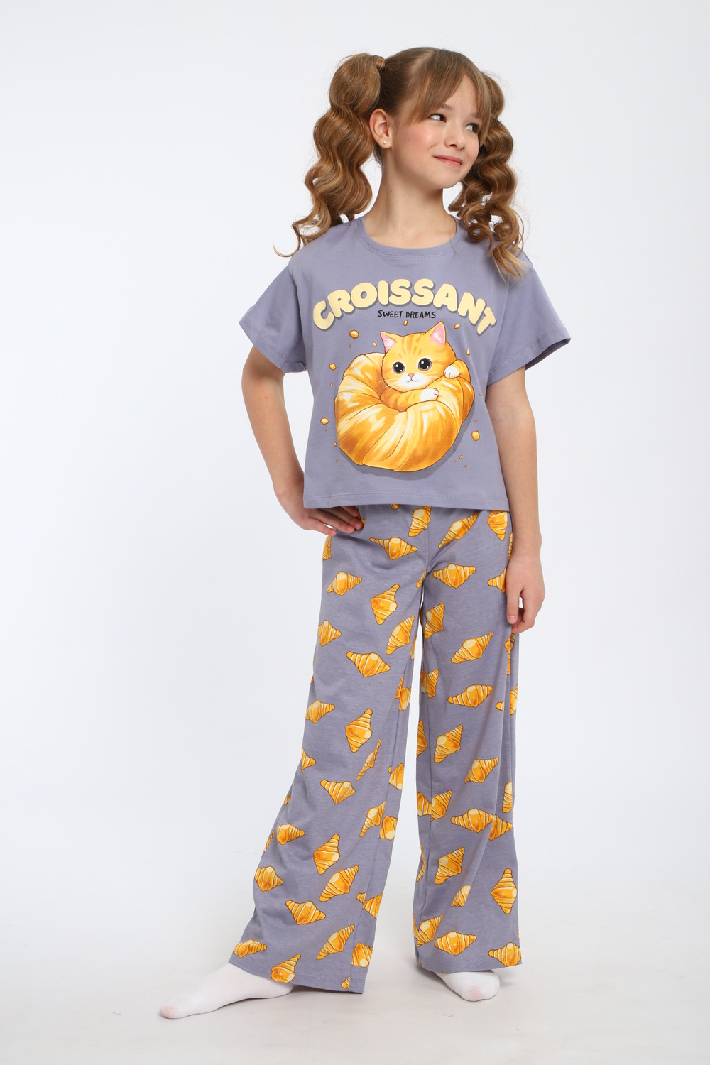 Комфортная пижама для девочки с оригинальным принтом. Пижама детская состоит из футболки забавным принтом и прямых брюк. Дизайн ткани позволяет использовать пижаму не только для сна, но и как костюм для дома. Модель пижамы не сковывает движения ребенка во время сна. Покрой футболки свободный, брюки классические без карманов. Пижама выполнена из 100% гипоаллергенного хлопка, что позволяет коже ребенка дышать во время сна.