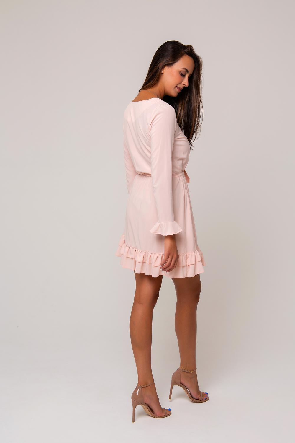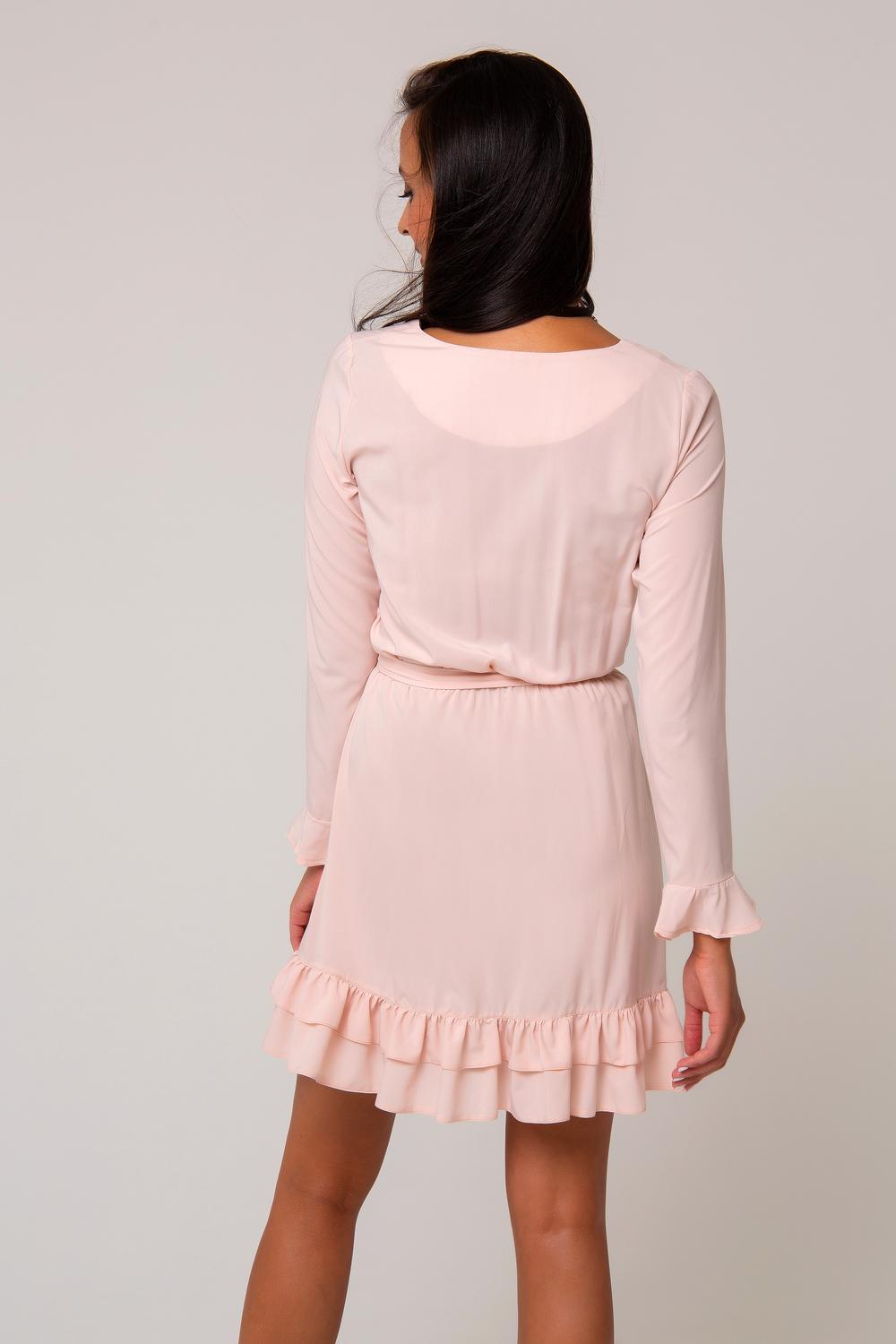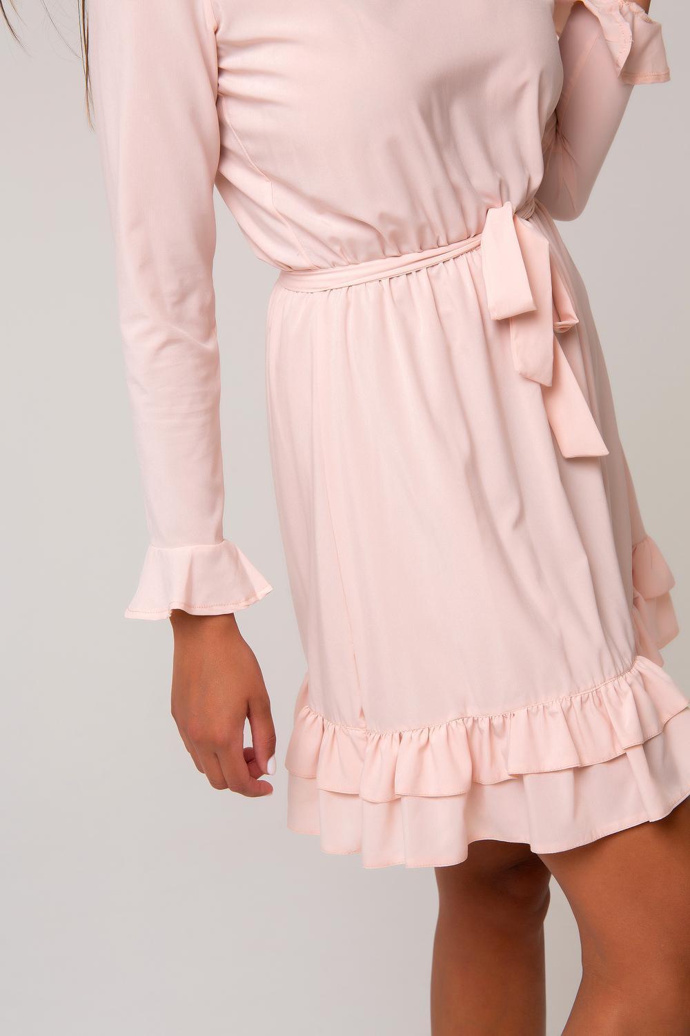 Платье А-силуэта, выполненное в нежном приятном оттенке. Рукав длинный, декорирован воланом, что придает платью женственности и романтичности. Край подола также оформлен воланами, которые еще больше привносят в образ нежности и изыска. Вырез горловины V-образный. Изделие дополнено поясом. Состав: 95% полиэстер, 5% эластан. Длина изделия см. Рост модели на фото 173 см (+ каблук).