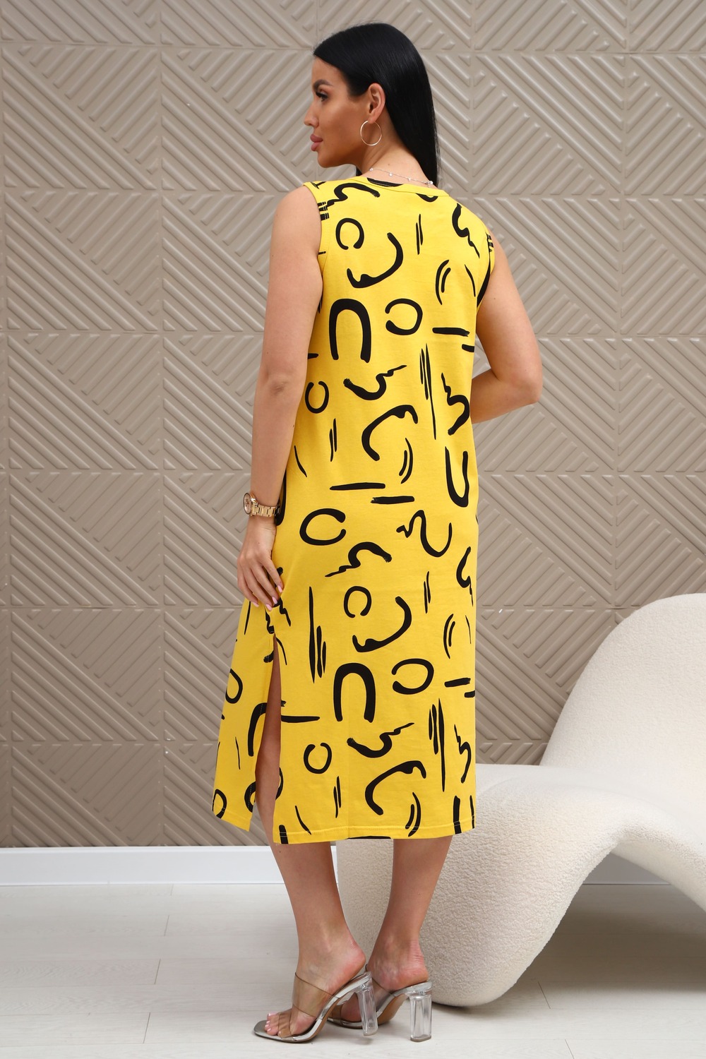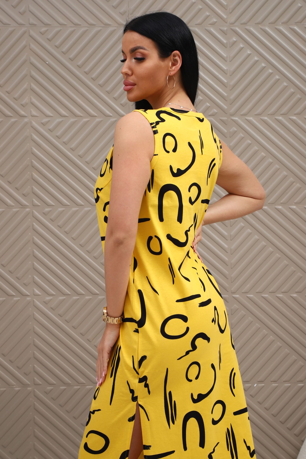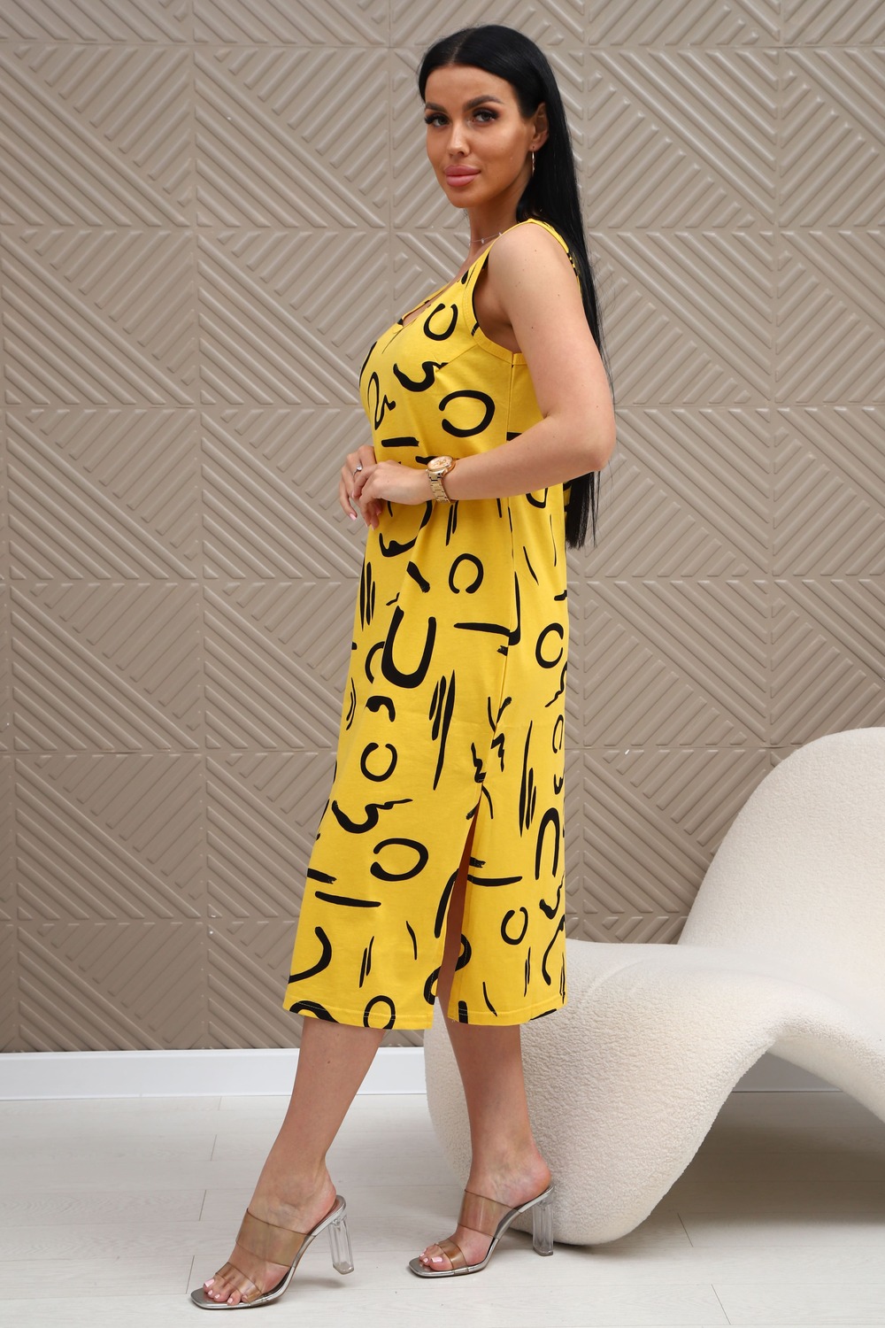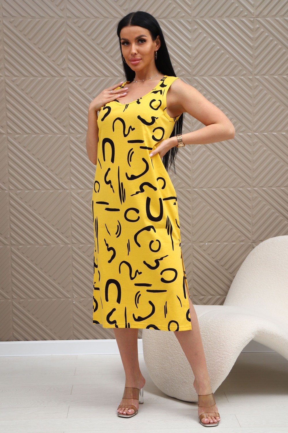 Сарафан из натурального трикотажного полотна. Силуэт прямой, слегка приталенный. Горловина V-образной формы. Без рукава. Спинка и перед гладкие, без рельефов. В боковых швах карманы. Разрезы по низу с двух сторон. Низ изделия прямой.